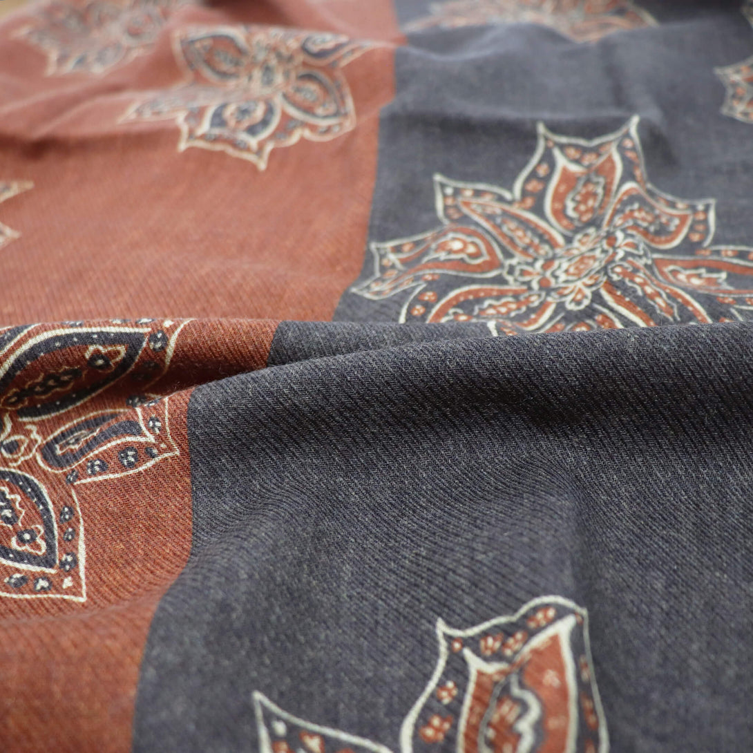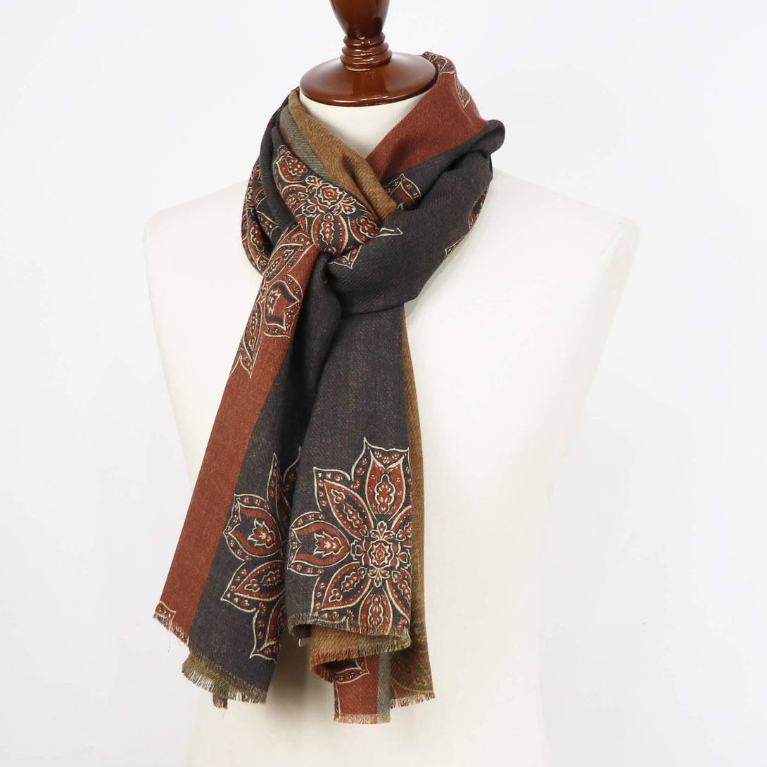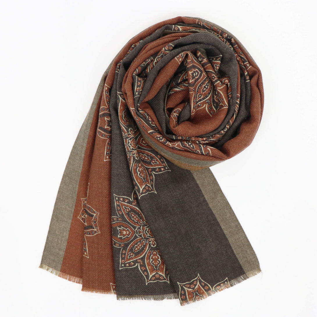 肌触りのいいイタリアメイドのウールストール。さらっとしていてなおかつ滑り感もあり、大判でありながらボリュームがですぎないので使い勝手が大変よくクラシックな柄がコーディネートに華を添えてくれます。