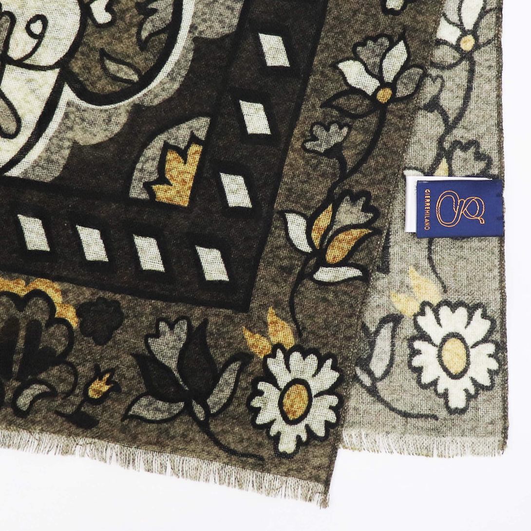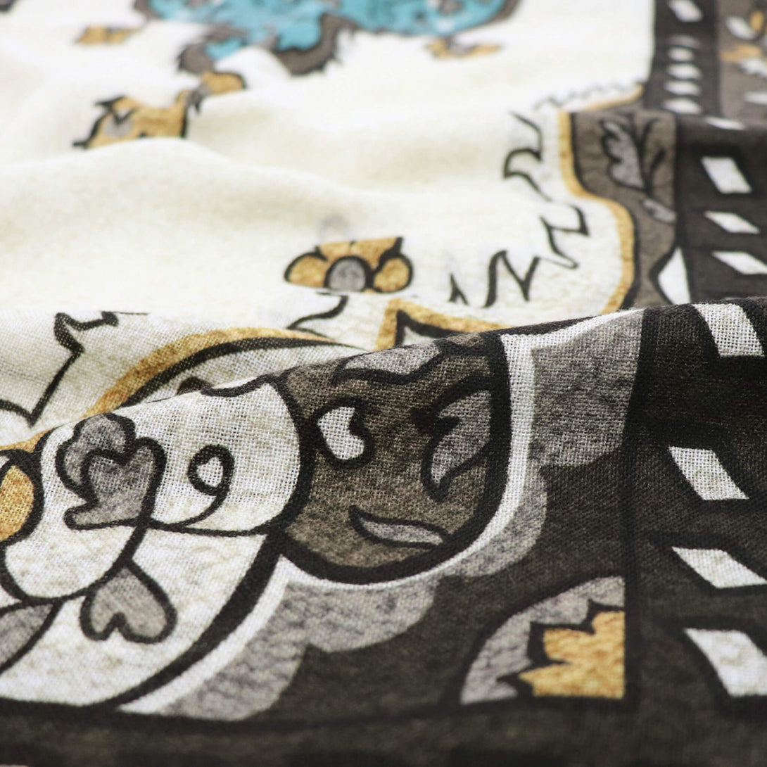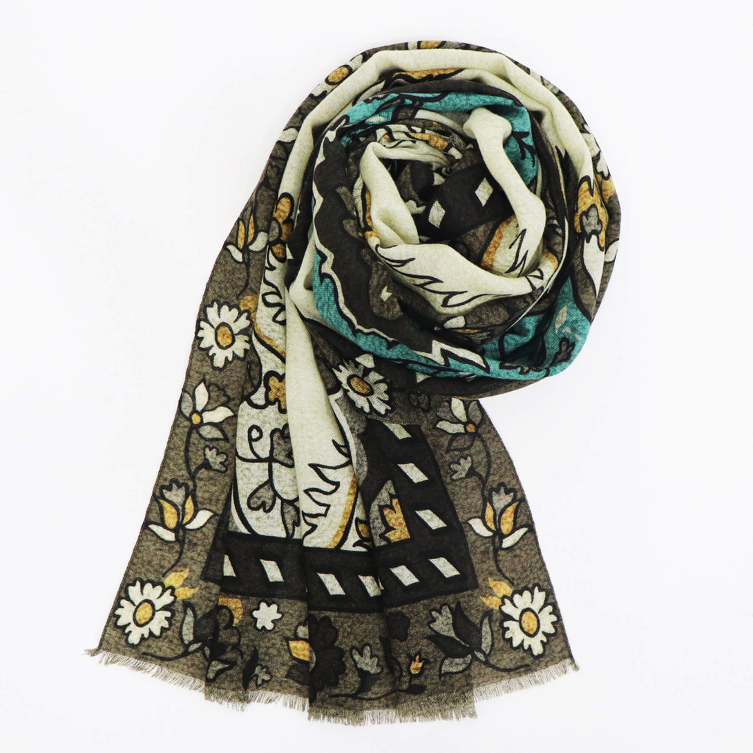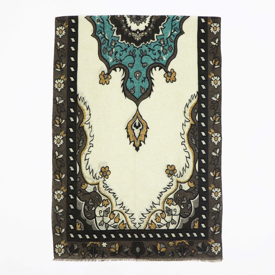 肌触りのいいイタリアメイドのウールストール。さらっとしていてなおかつ滑り感もあり、大判でありながらボリュームがですぎないので使い勝手が大変よくクラシックな柄がコーディネートに華を添えてくれます。