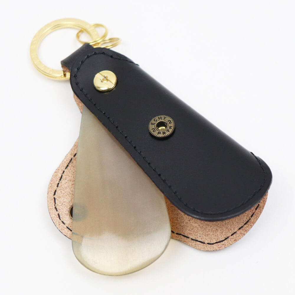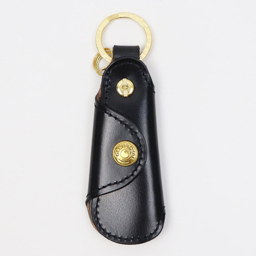 キーホルダーとしてもお使いいただける携帯用シューホーン(靴べら)。外出先でサッと使うだけで、さり気なく品のある大人の立ち振る舞いを演出できます。 GLENROYALのシューホーンはコンパクトなサイズで気軽に持ち歩くことが可能なのが魅力的です。ホーンを覆う伝統のライドルレザーに金のスナップボタンの組み合わせという、エレガンスの宿る贅沢で深みのある仕上がり。日々変わっていく革の表情も楽しめる逸品。 ホーン本体は水牛の角を使用し、他にはない上質で温かみのある雰囲気も生み出しています。