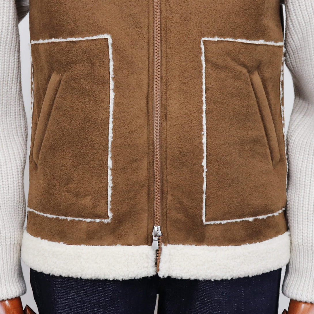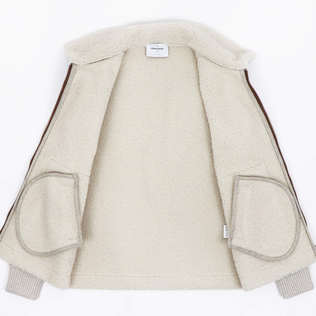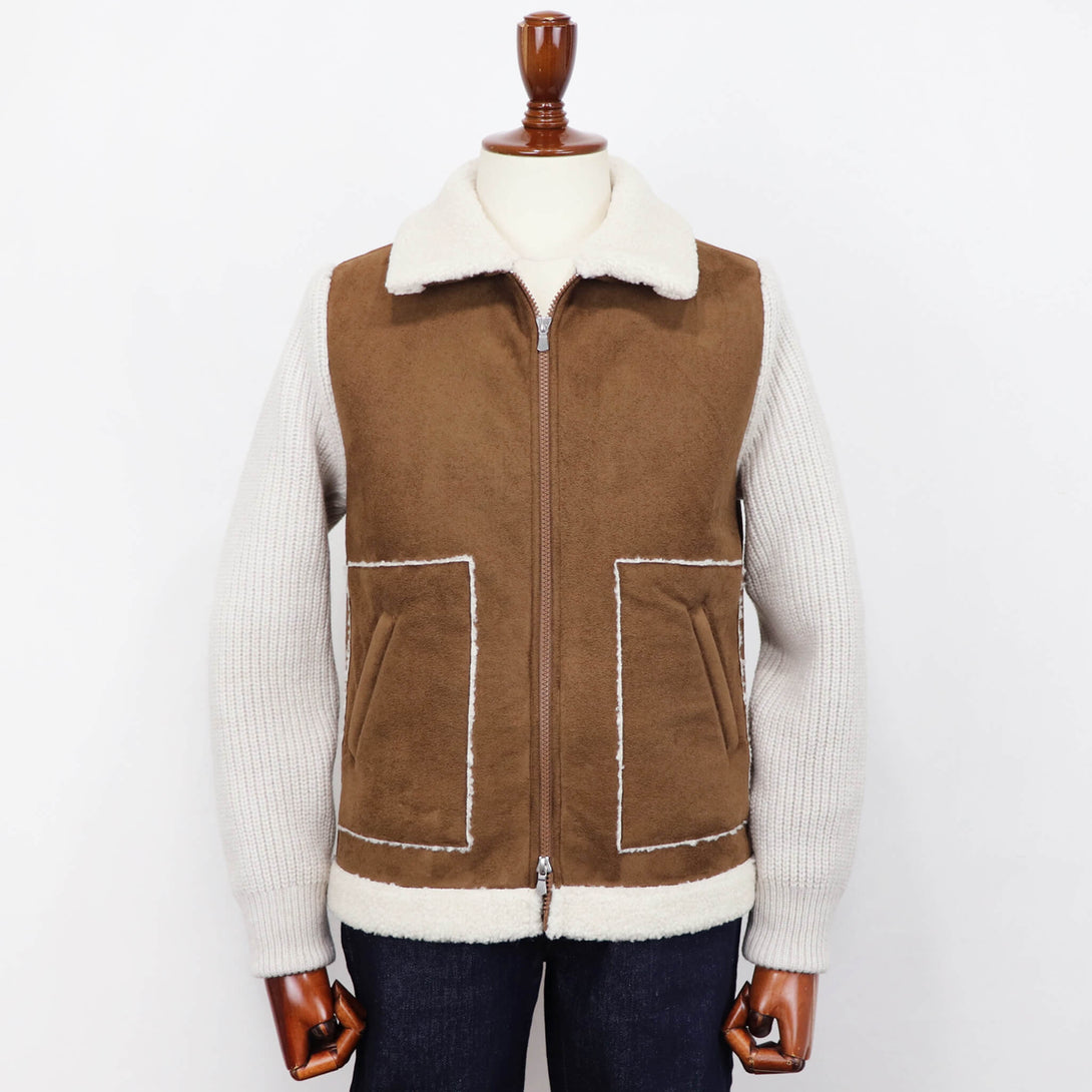 今季、グランサッソではお馴染みの異素材コンビネーションニットブルゾン新作のご紹介です。エコで保温性の高い素材として、注目を浴びている人口皮革アルカンターラを使用し、エコムートンと、グランサッソならではの上質なニットのコンビネーションが魅力の1着。エレガントでラグジュアリー、大人な雰囲気に仕上がっています。アウターとしての役割となるので、ハイゲージのニットとの組み合わせや、カットソーや、シャツなど気温に合わせてインナー選びがお楽しみいただけます。