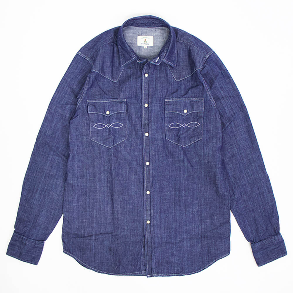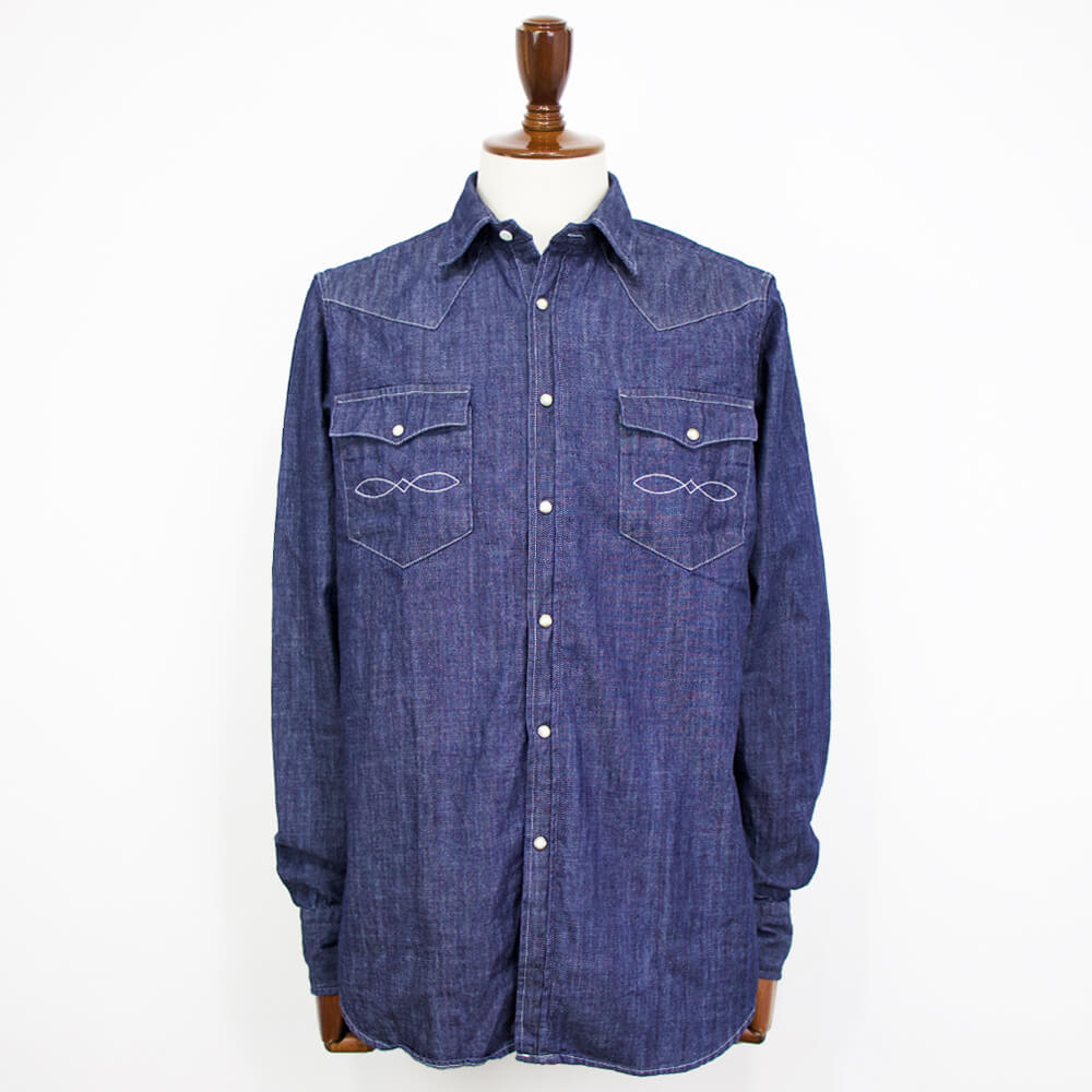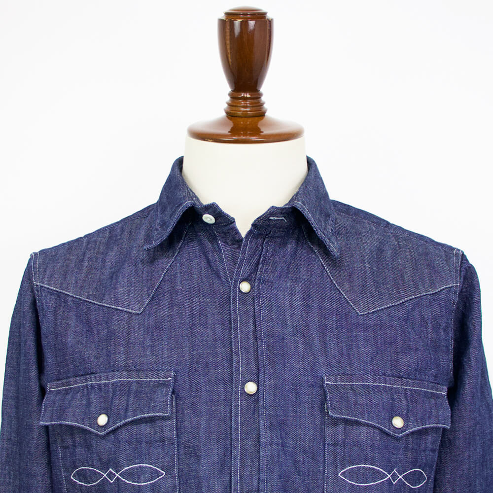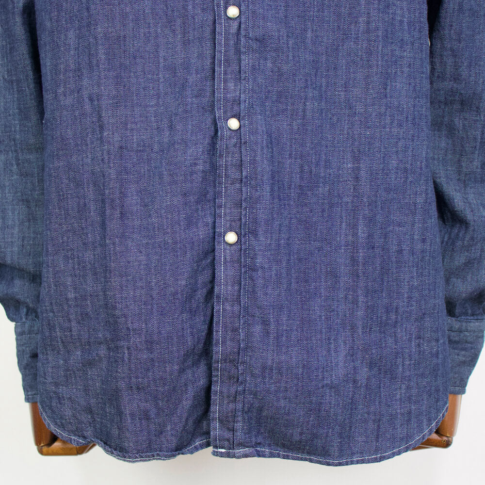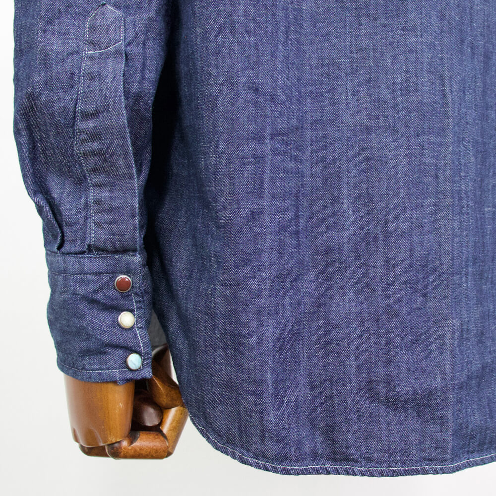 ライトオンスのデニム生地をベースにウエスタンシャツのディテールをプラスし、胸ポケットには特徴的なチェーンステッチがあしらわれています。袖のスナップボタンはあえて色を変えるなど、細部に渡り彼のこだわりが多く詰まっています。