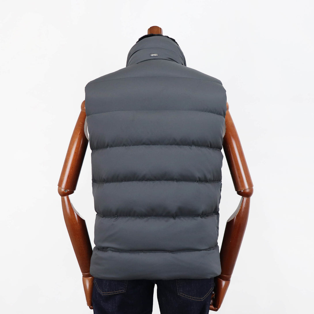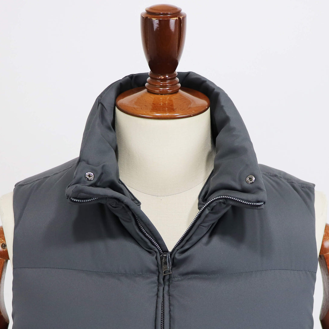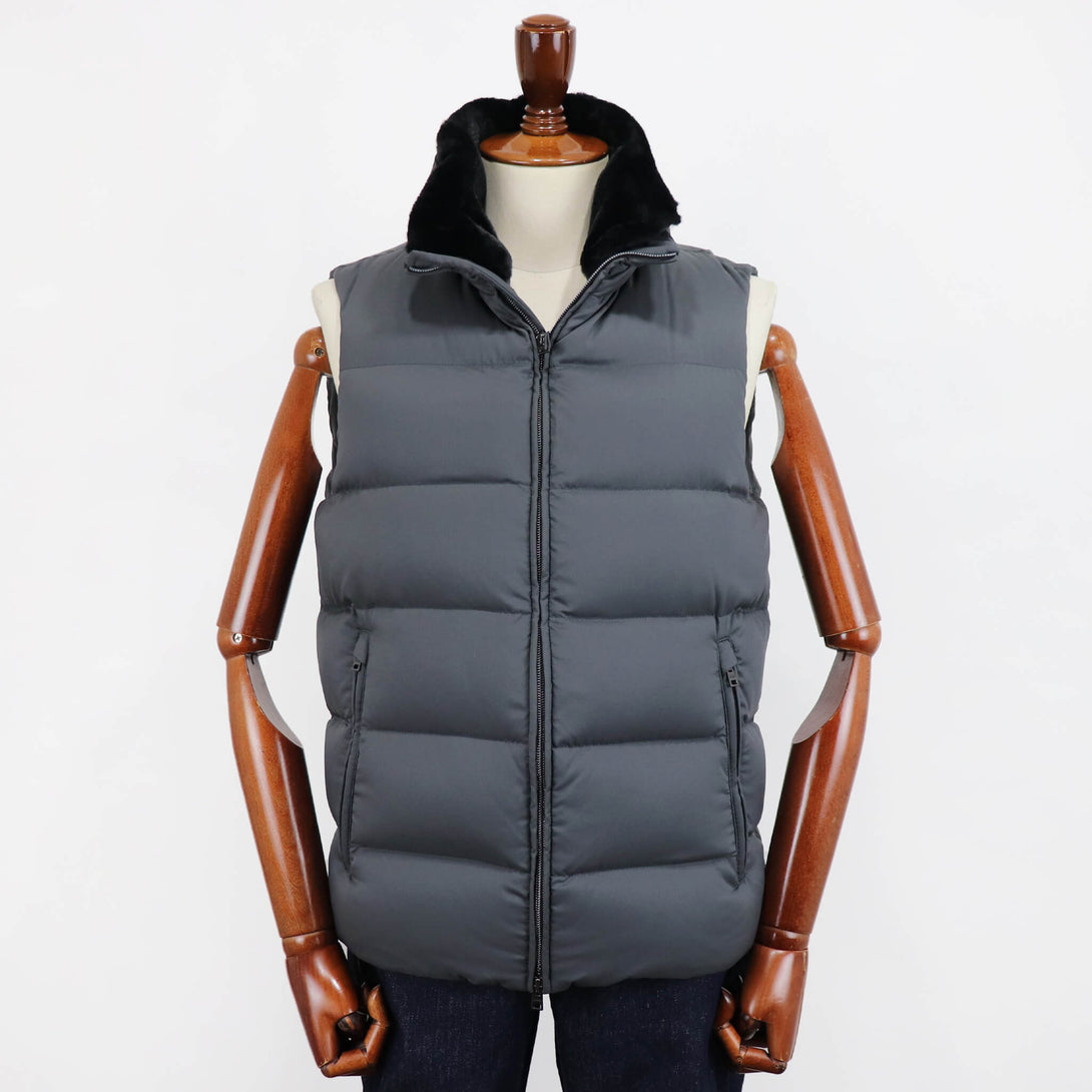 今季もHERNO(ヘルノ)の新作が届きました。撥水性の高い、機能性ナイロンですが、マットな風合いで上品な色出しとなっていま。柔らかな起毛感が特徴的で、高級感と機能性を兼ね備えた生地となっています。ネック内側にはエコファー(取り外し可能)を使用することで肌触りの良さと高級感を演出。スポーティなイメージのダウンベストを高級感のある生地を使用することで、大人も着れる落ち着いた表情に仕上がっています。