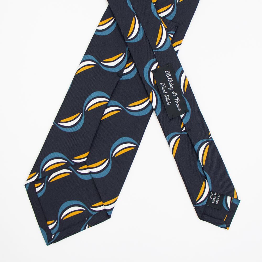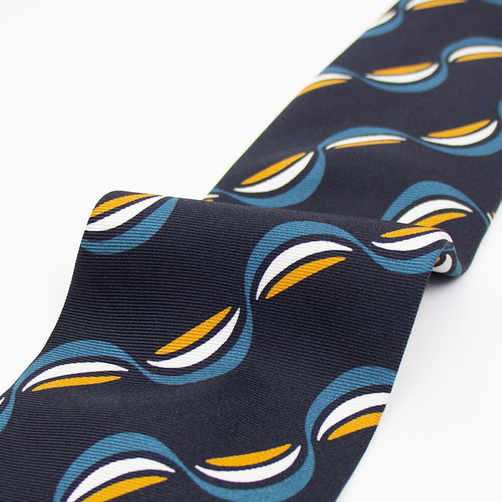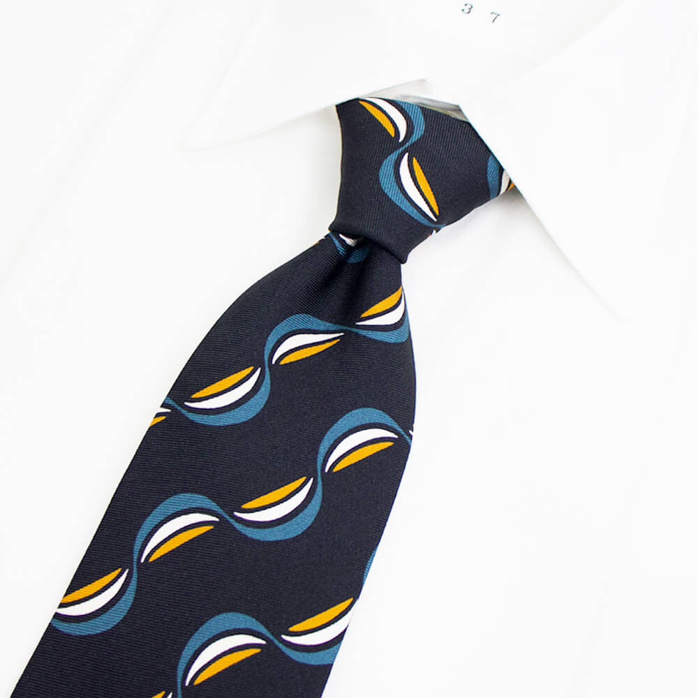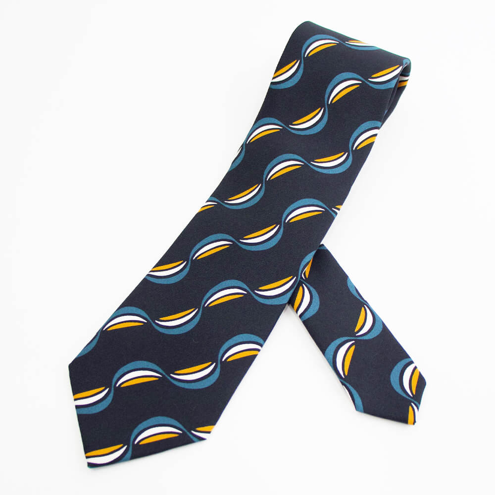 一見するとポップなデザインに見えますが、実際に結んでみると驚くほどにクラシックでエレガントな雰囲気の表情に変わるのに驚かされます。結婚式やパーティーなど華やかなシーンはもちろんのこと、落ち着いた色味ですのでビジネスにおいても活躍してくれる一本です。英国の伝統とイタリアのシルク産業の知識を融合した端正な佇まいが魅力です。ワードローブの一つにあると重宝すること間違いなしです。
