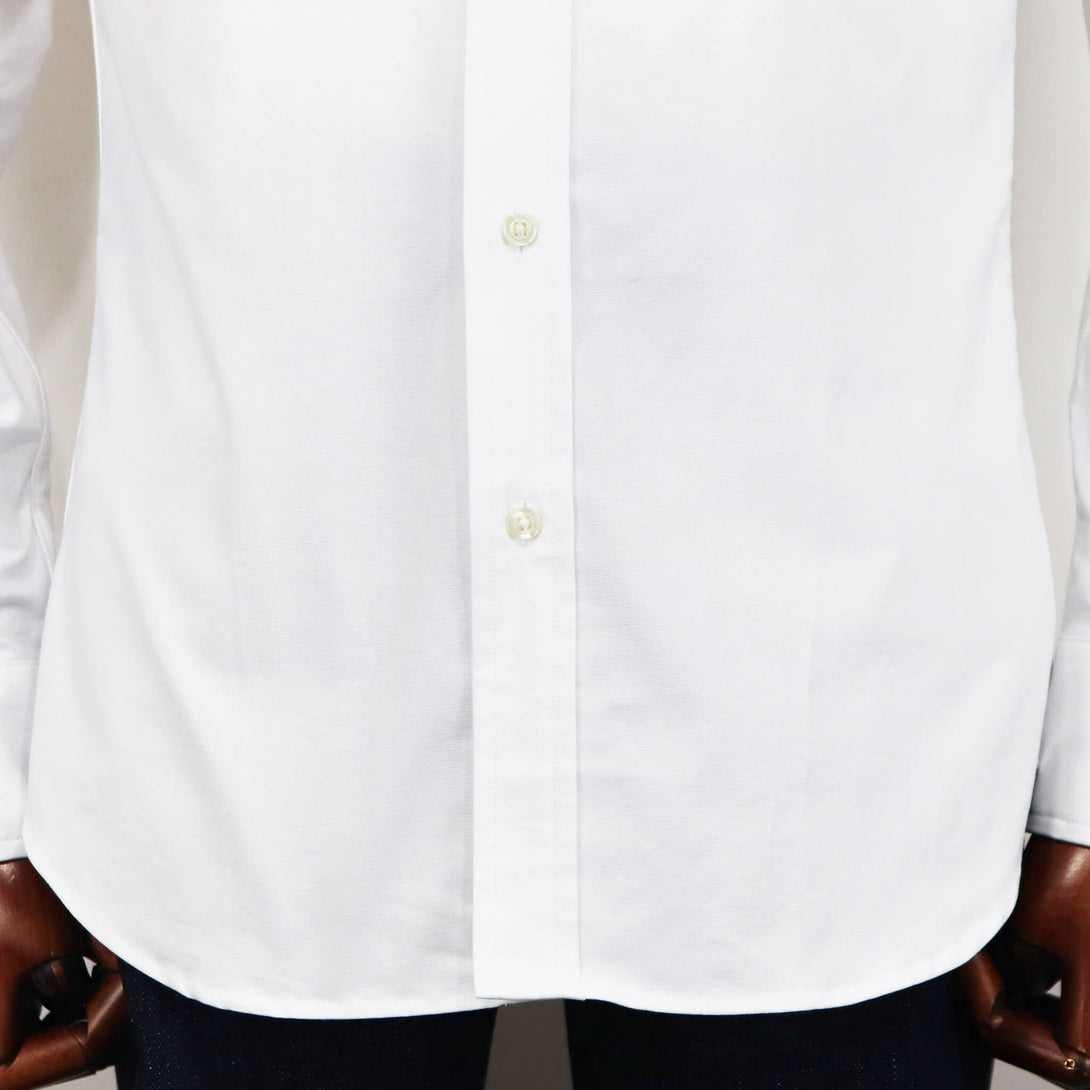 この「スタンダードフィット」は「クラシックフィット」と「スリムフィット」の中間のサイズ感となっており、身頃は細身ですが袖周りにはゆとりを持たせたタイト過ぎないシルエットが特徴です。また着丈をやや短めに設定する(Giotto別注)ことでシャツの裾をタックアウトしてもだらしなく見えないような作りになっているのもこのシャツの特徴です。