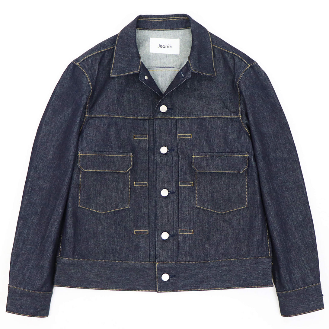 イタリア人と日本人の二人組によるブランドJeanik(ジーニック)通称2ndモデルを踏襲したこちらは、特徴的なフロント部分のプリーツや、両胸のパッチ、フラップポケット、ウエストのサイズアジャスターといったデザインを残しつつ、随所に現代的なアップデートが施されています。両胸ポケットのボタンに、左胸ポケットのブランドネームタグを排し、使用されているボタンも刻印などのないシンプルなデザイン。それらによってビンテージの雰囲気ではなく、あくまで現代的な表情が生まれ、モダンなスタイルを作りあげています。また、肩付けにテーラードの技術を採用することで、前振り袖になり可動域が広がり、着心地をより良くしています。