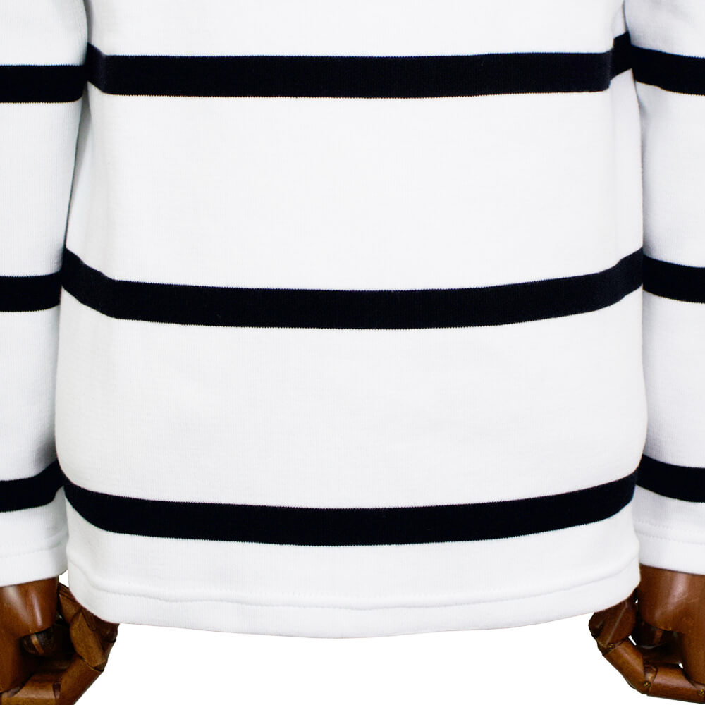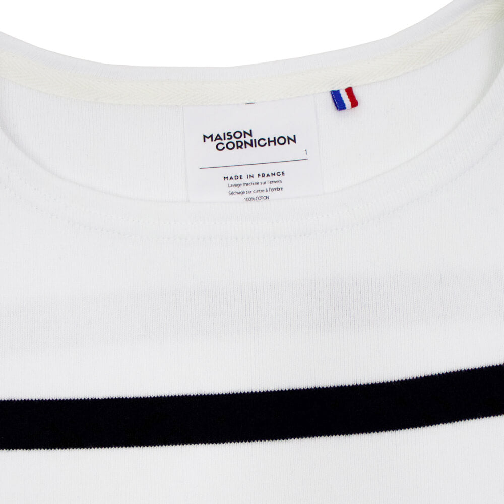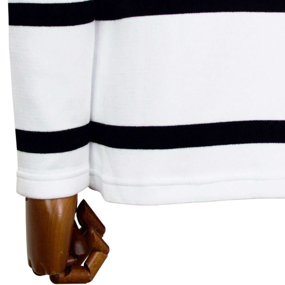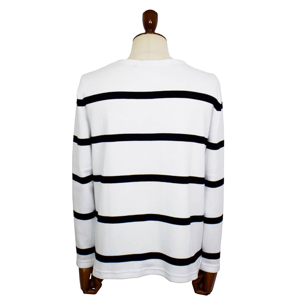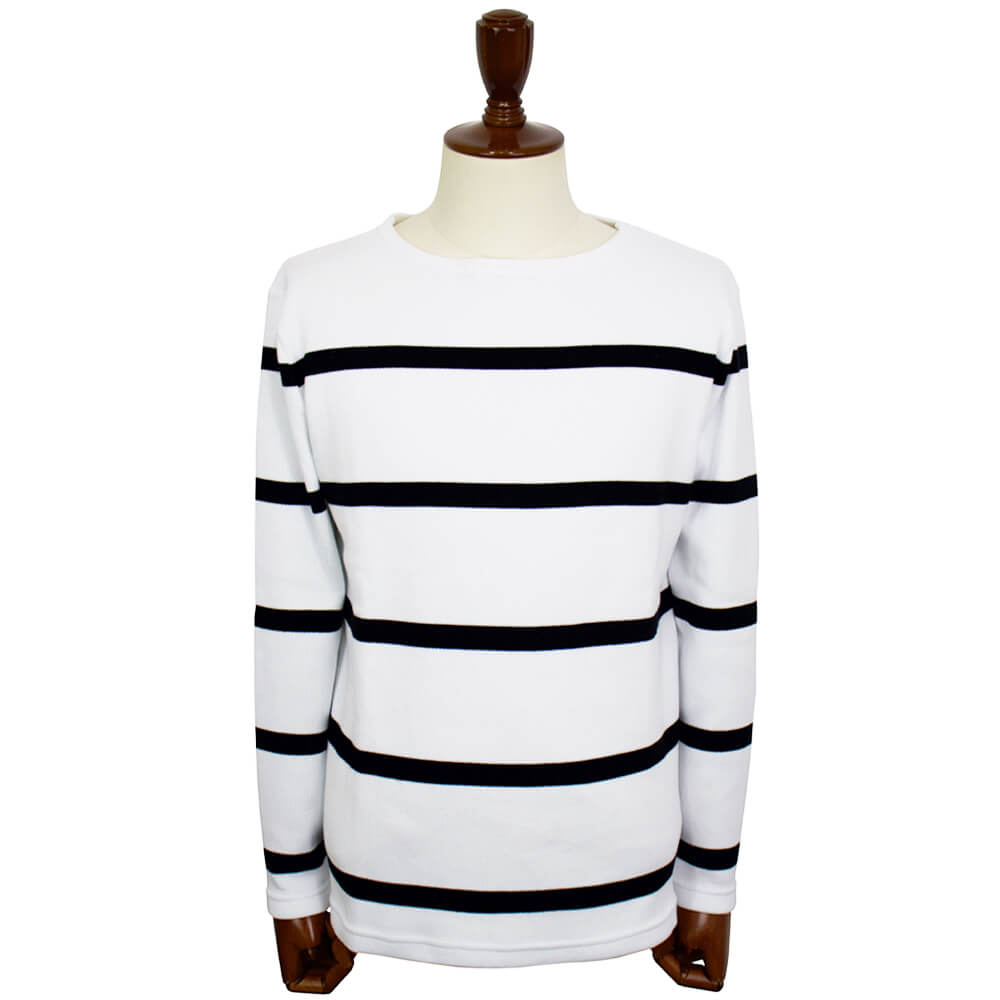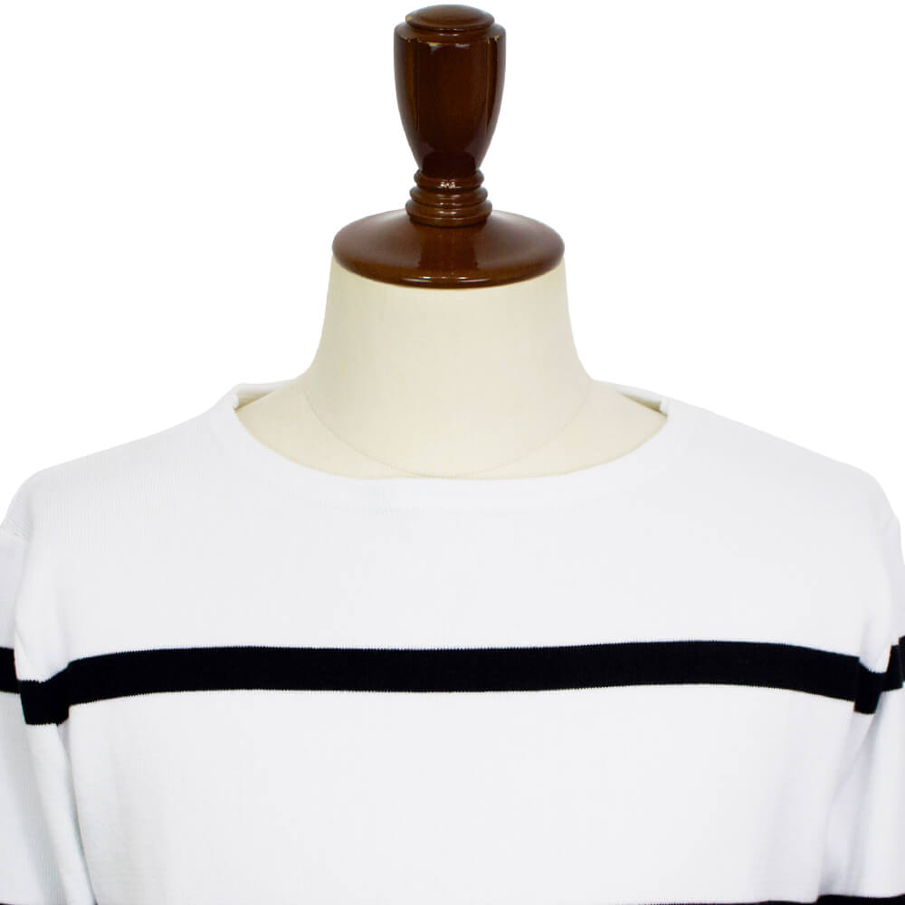 カットソーでありながらニットのようにも使うことができる一枚。伸縮性と着心地の良さはコルニションならでは。バスクシャツなので、首元が横にスーッと広がる上品なボートネックカットソー。程よい首元の広がり方は、上品なフランスらしい味付けとなっています。ドイツ製のヴィンテージ編み機によって作り出された生地はフランス国内でも数社、数少ない貴重な物となっています。背景も含め、少しフレンチな気分を味わいたい。そんな一着に仕上がっています。
