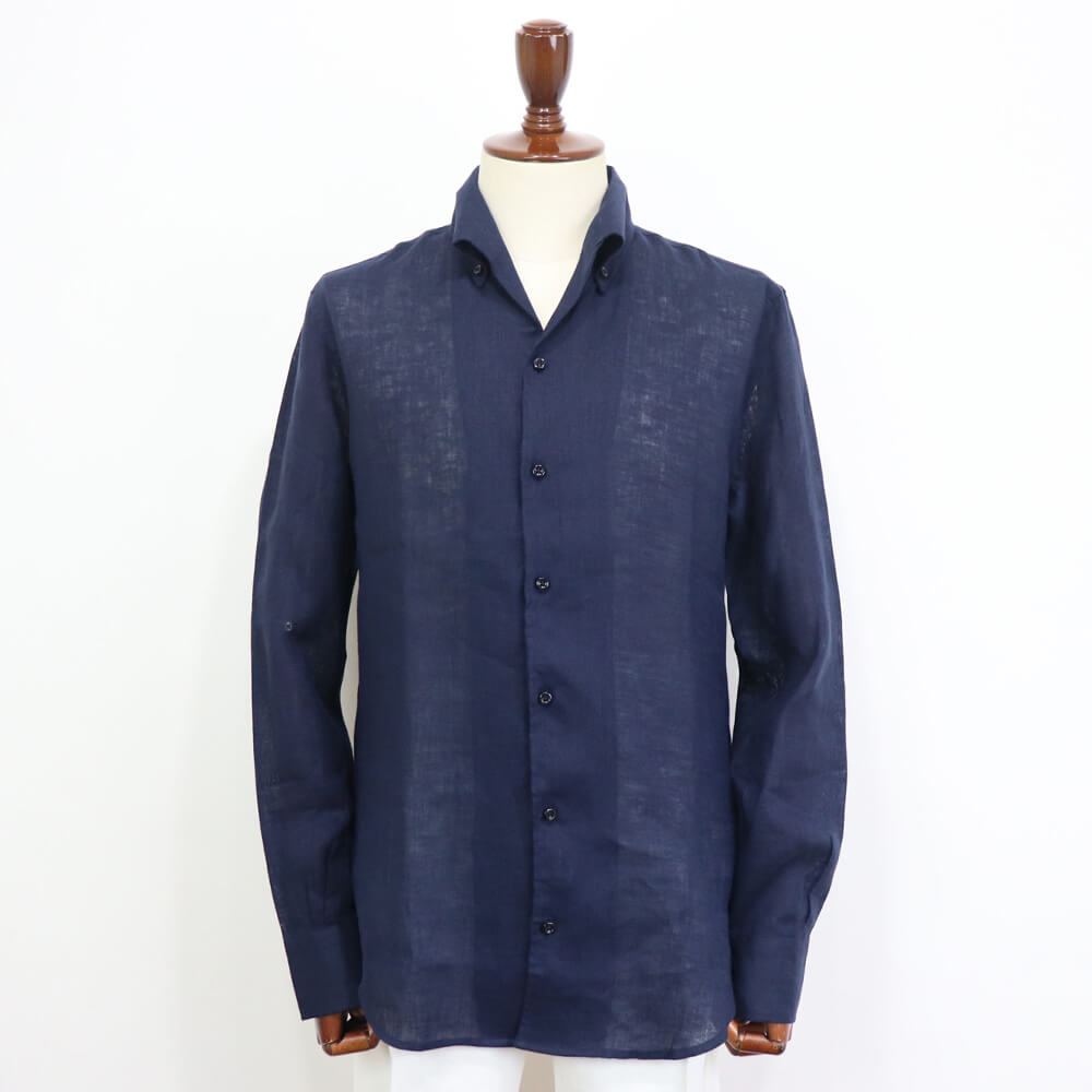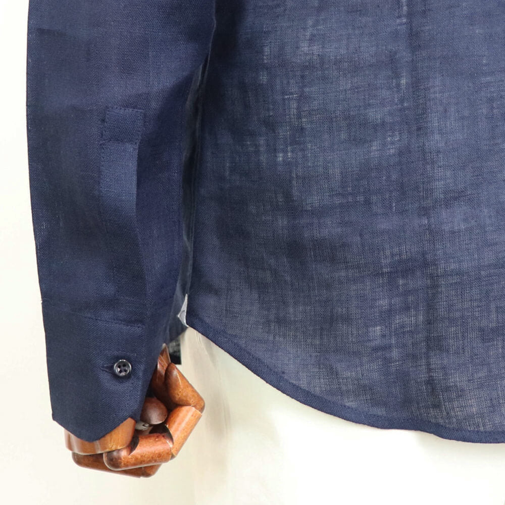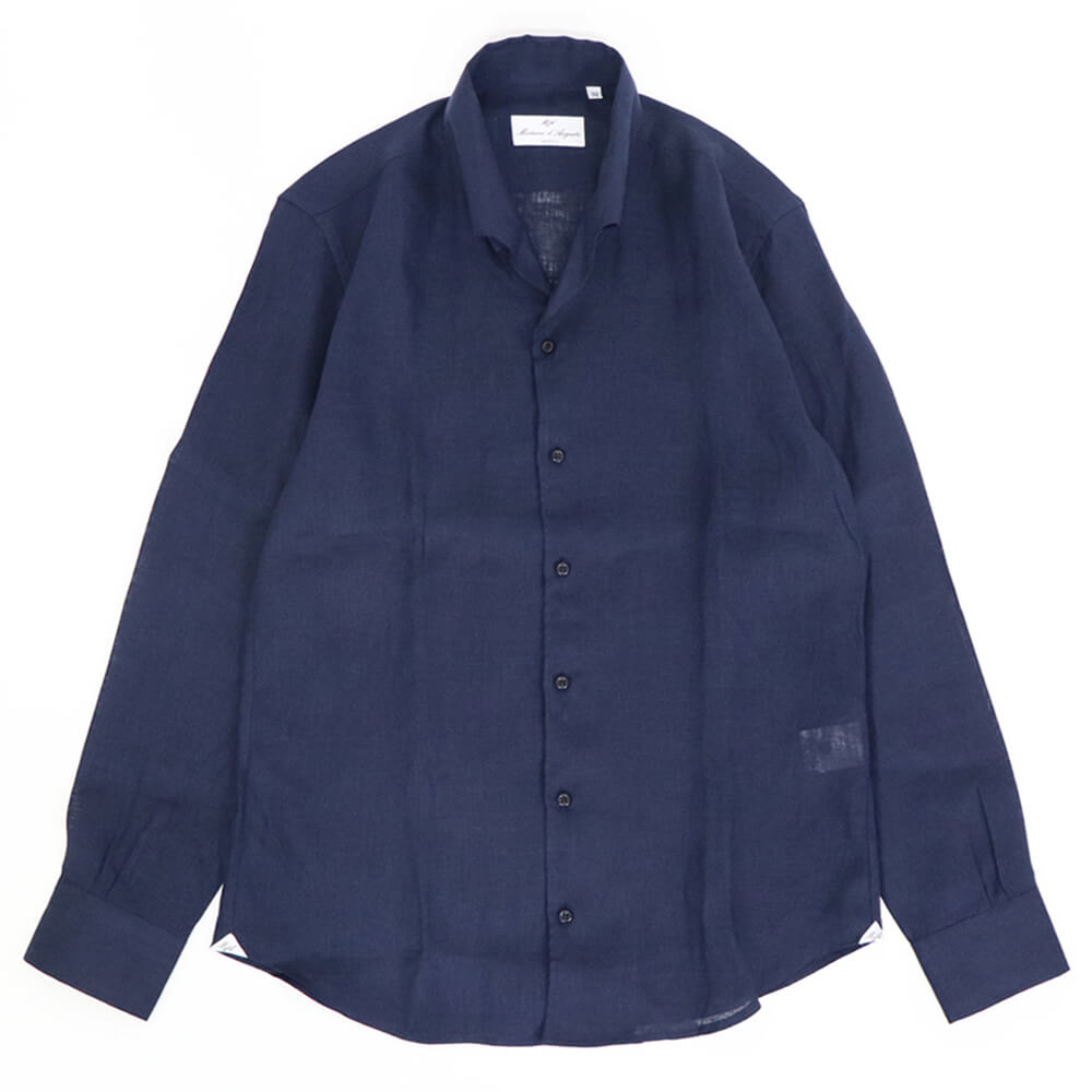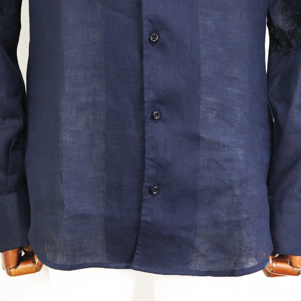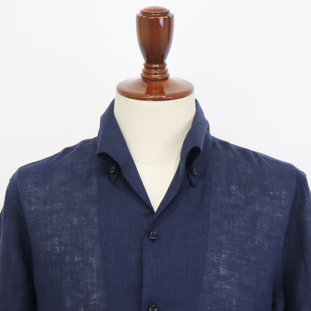 今季のセレクトしたモデルは”イタリアンカラーシャツ”になります。イタリアンカラーとは、衿と前立ての裏部分がオープンカラーのように縫い目のなく、衿が一枚の生地で出来ている衿型のことです。別名ワンピースカラーとも呼ばれています。台襟がなく、着用した時の”美しく立体感のある衿のロール”が生まれることが特徴的です。もともとは南イタリアで生まれたリゾートシャツ。イタリアならではの色気のあるシャツをリネン素材で仕上げ、夏に一枚でも様になる大人のシャツが仕上がりました。