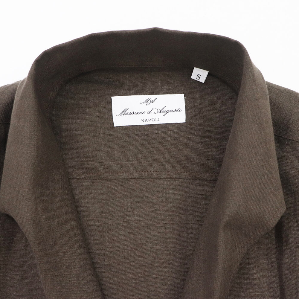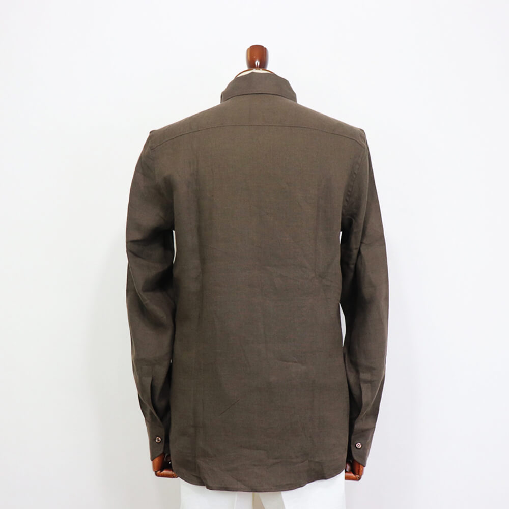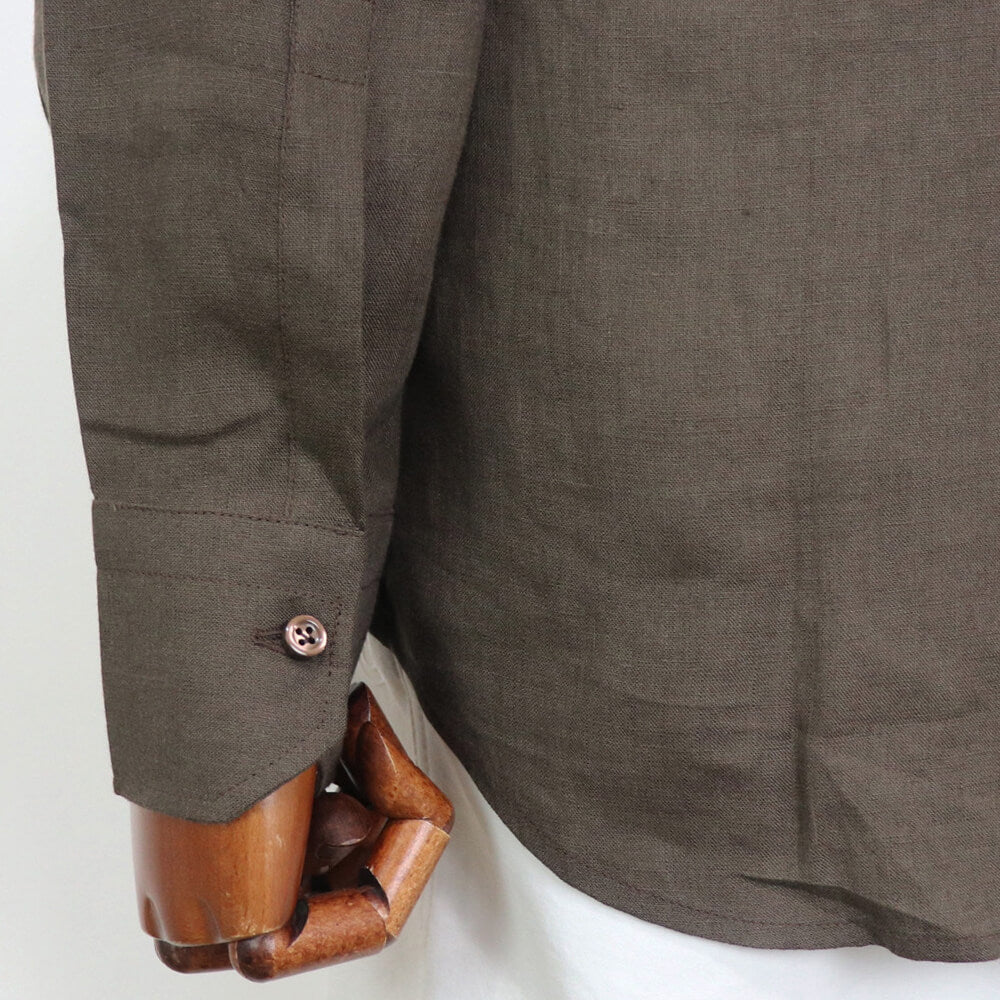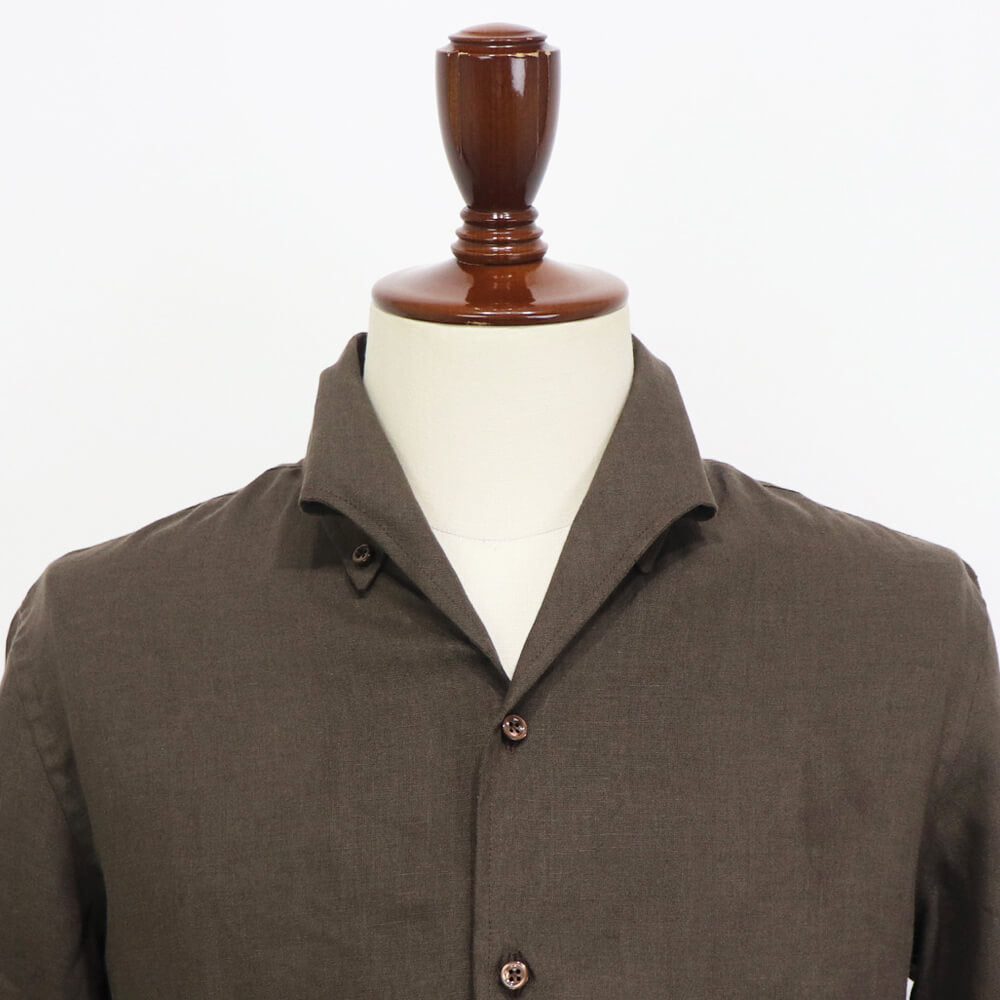 今季のセレクトしたモデルは”イタリアンカラーシャツ”になります。イタリアンカラーとは、衿と前立ての裏部分がオープンカラーのように縫い目のなく、衿が一枚の生地で出来ている衿型のことです。別名ワンピースカラーとも呼ばれています。台襟がなく、着用した時の”美しく立体感のある衿のロール”が生まれることが特徴的です。もともとは南イタリアで生まれたリゾートシャツ。イタリアならではの色気のあるシャツをリネン素材で仕上げ、夏に一枚でも様になる大人のシャツが仕上がりました。
