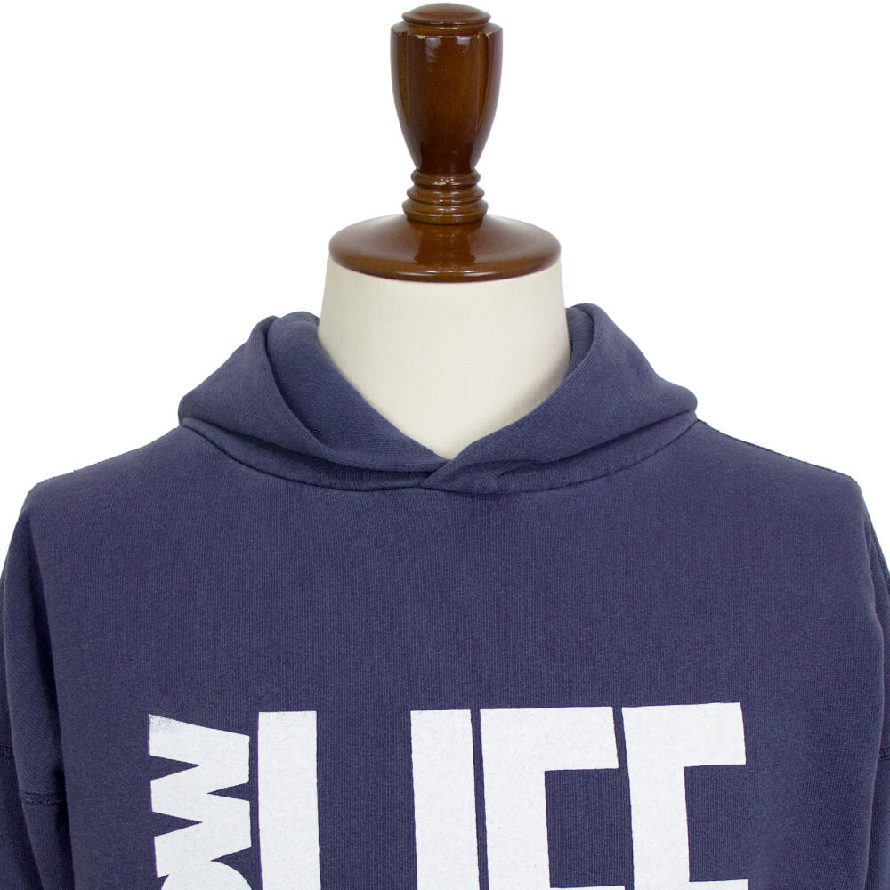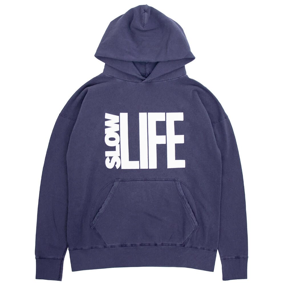 ヴィンテージ感のある色合いや風合いが魅力的な裏起毛パーカー。ミドルウェイトで地厚過ぎず、ややゆったりとしたサイズ感でメンズレディース問わず着用していただけるアイテムです。こちらのプリントは”SLOW LIFE” 常にせわしなく過ごすのではなく、たまにはゆっくりとして自分を見つめなおしてみてというメッセージが込められています。
