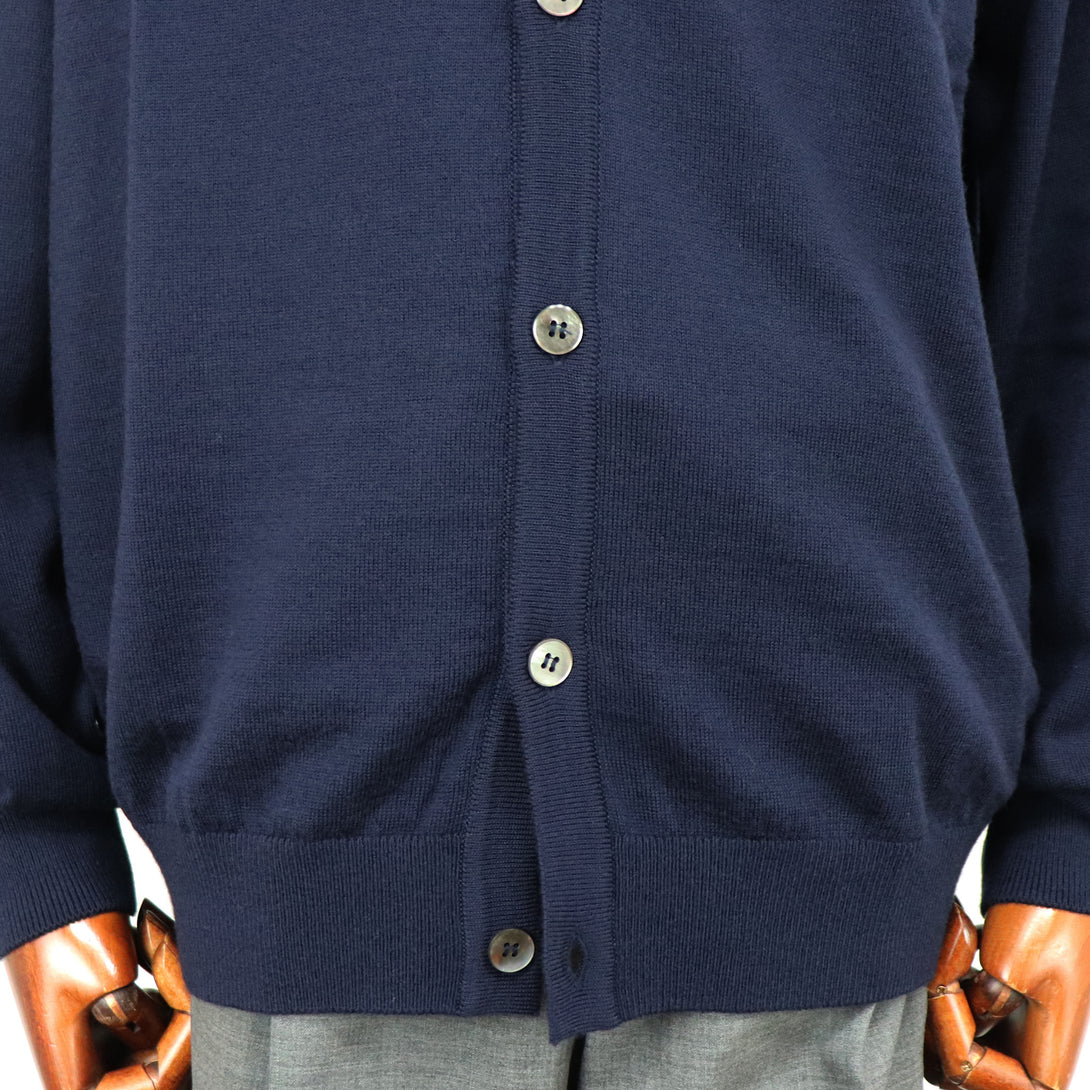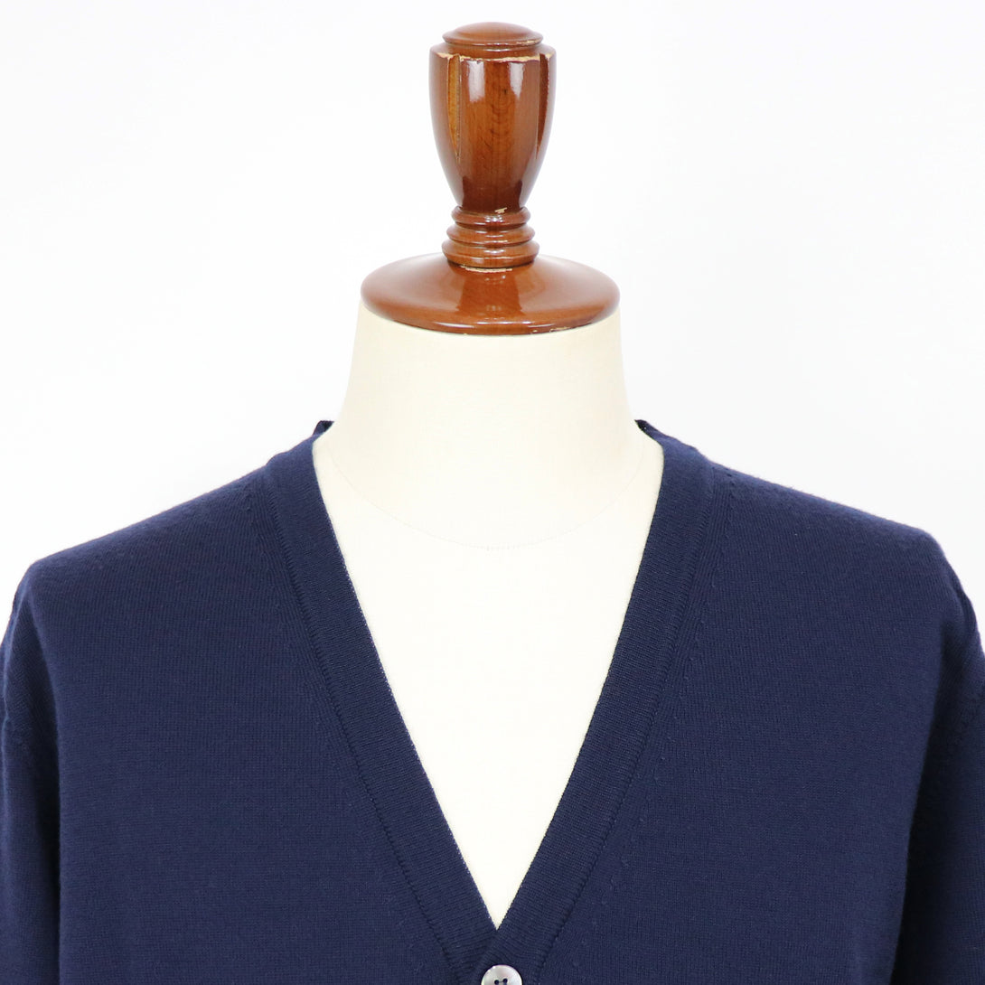 オーストラリア産メリノウールを使用したこのカーディガンは、繊細でしなやかな繊維ならではの滑らかな肌触りと上品な光沢感が魅力です。12G天竺編みによる細かく均一な編み目は、見た瞬間に上質さが伝わるハイゲージ仕上げ。目を詰めて編み立てることで生地にほどよい厚みと耐久性、そして高い保温性を持たせ、ウール特有のチクチク感を抑えて快適な着心地を実現しました。計算されたVネックラインは首元に適度な余裕を持たせ、黒蝶貝ボタンの奥行きある輝きと相まって洗練された印象に。袖や裾のリブはきつすぎず緩すぎない絶妙なフィット感で、シルエットを美しく整えながらジャケットのインナーとしても使いやすいデザインです。冬のワードローブに欠かせない、大人の魅力を引き上げるベーシックなウールカーディガンです。