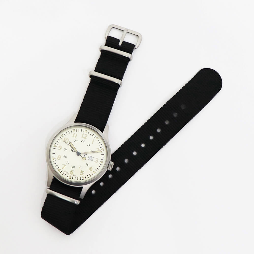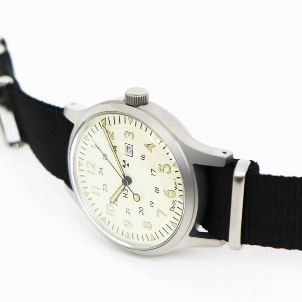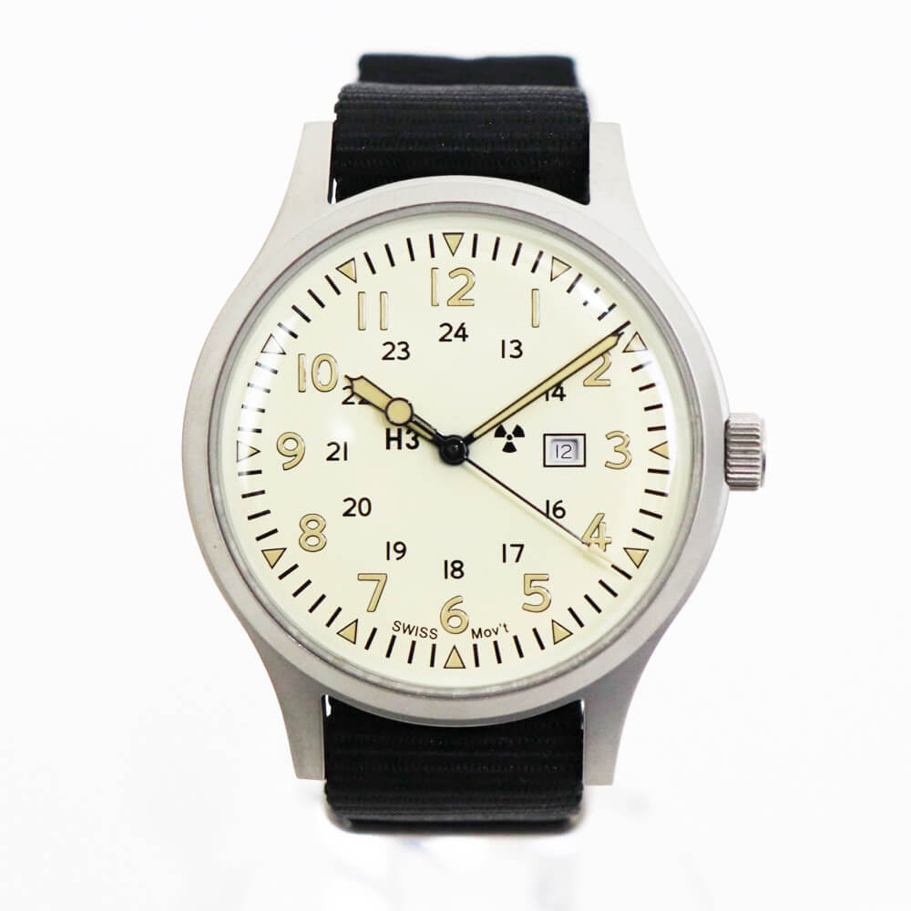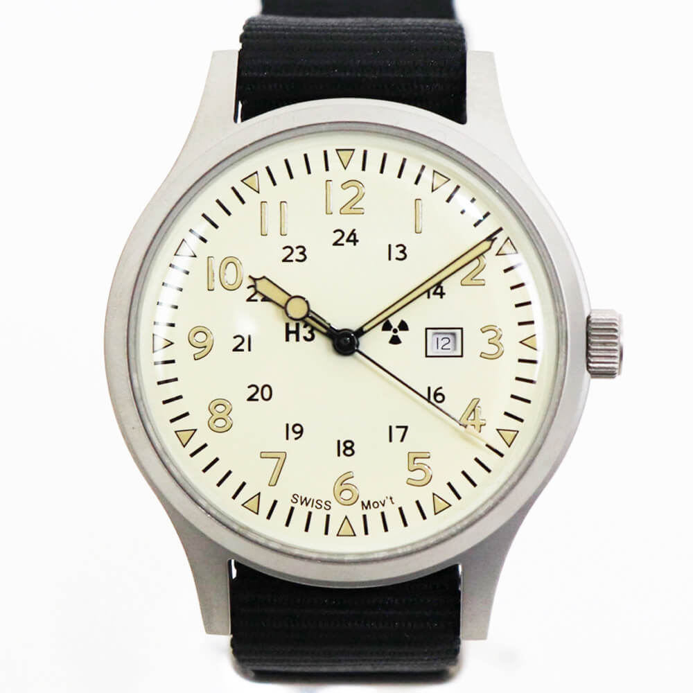 Mil.-01モデルのアイボリーホワイトカラーヴィンテージ仕様になります。Mil.-01A/Bと同様米国陸軍仕様をベースに、当時のミルスペックを忠実に再現しつつ、サイズ感をアップデートしてケース径を38ミリに拡大しました。ケース及びケースバック素材は316Lステンレススティールを採用。風防はアンティーク感を出すためにアクリル製ドーム風防を復刻。スイス製デイト付クォーツムーブメントを採用し、機能面でも現代の使用に耐えうる製品となってます。文字盤上の数字・インデックス・針の蓄光塗料にはスイス製腕時計にしか使用を許されていない「LumiNova(R)」塗料を採用し、通常のルミナスより蓄光時間・光が強化されています。加えて蓄光塗料をヴィンテージカラーを使用し、「H3」及び「放射性物質マーク(実際には放射性物質は使用しておりません)」を追記して当時感を感じさせるデザインになっております。防水面でも5気圧防水構造ですので日常の水仕事・作業にも充分使用していただけます。
