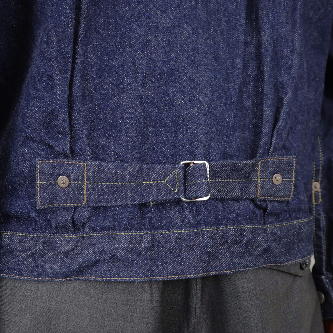 今季、orSlow(オアスロウ)から素敵なアイテムが届きました。1940年代、デニム素材のジャケットがまだジージャンと呼ばれていなかった時代プリーツの入ったブラウスと呼ばれていました。フロントプリーツのデザインは1800年代のなごりがあります。織り上がった後に防縮加工がかかっていない生地は縦方向によく縮み1800年代当時は生地を横使いで縫製し洗い後縮んだ際にプリーツをほどけば身幅を広げることが出来るといった仕様になっていたとも言われています。生地を縦方向に使う仕様になってからもデザインだけが残り現代でもフロントプリーツのデザインとして継承されています。1940年代のデニムは後年のデニムに比べ縦ムラが長い傾向があります。原料の綿を手摘みでしていたか機械でしていたかにより繊維の砕け方が違うからなのか定かではないですが1940年代以前のデニムと1950年代のデニムではムラの表情が違います。orslow6011に仕様しているオリジナルデニムも縦ムラが他の物より長い素材を使用しています。背中の仕様はサイズ3以上はTバックの仕様になっています。物が貴重で無駄なく使われていた時代に大きいサイズの生地の用尺をよくするために考えられた仕様だと思われます。