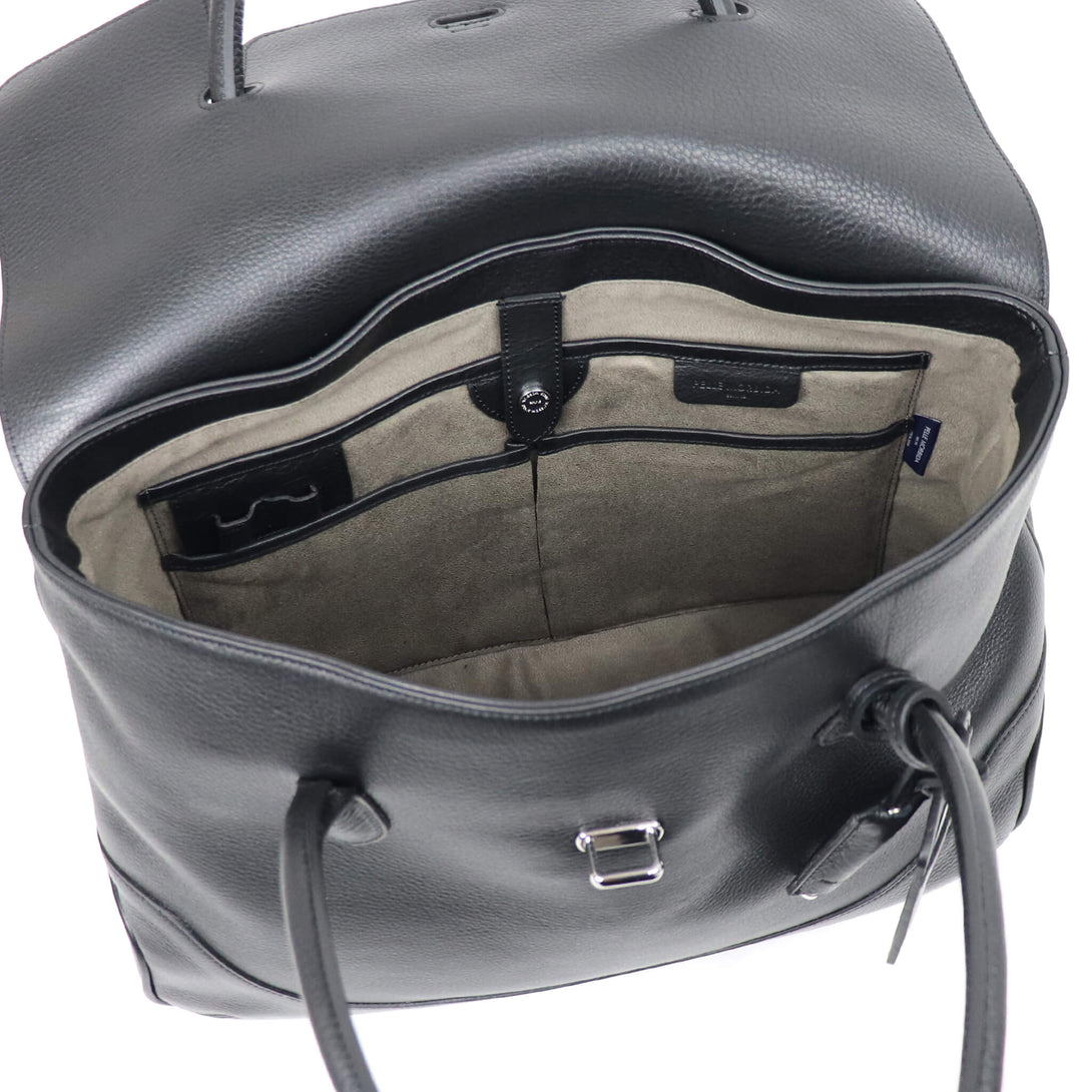 内装にはポケットやペン差しを備え、スマホ収納にも便利。底びょう付きで自立性があり、シンプルな1本ベルトで開閉もスムーズ。肩掛けもできるハンドル高も魅力です。