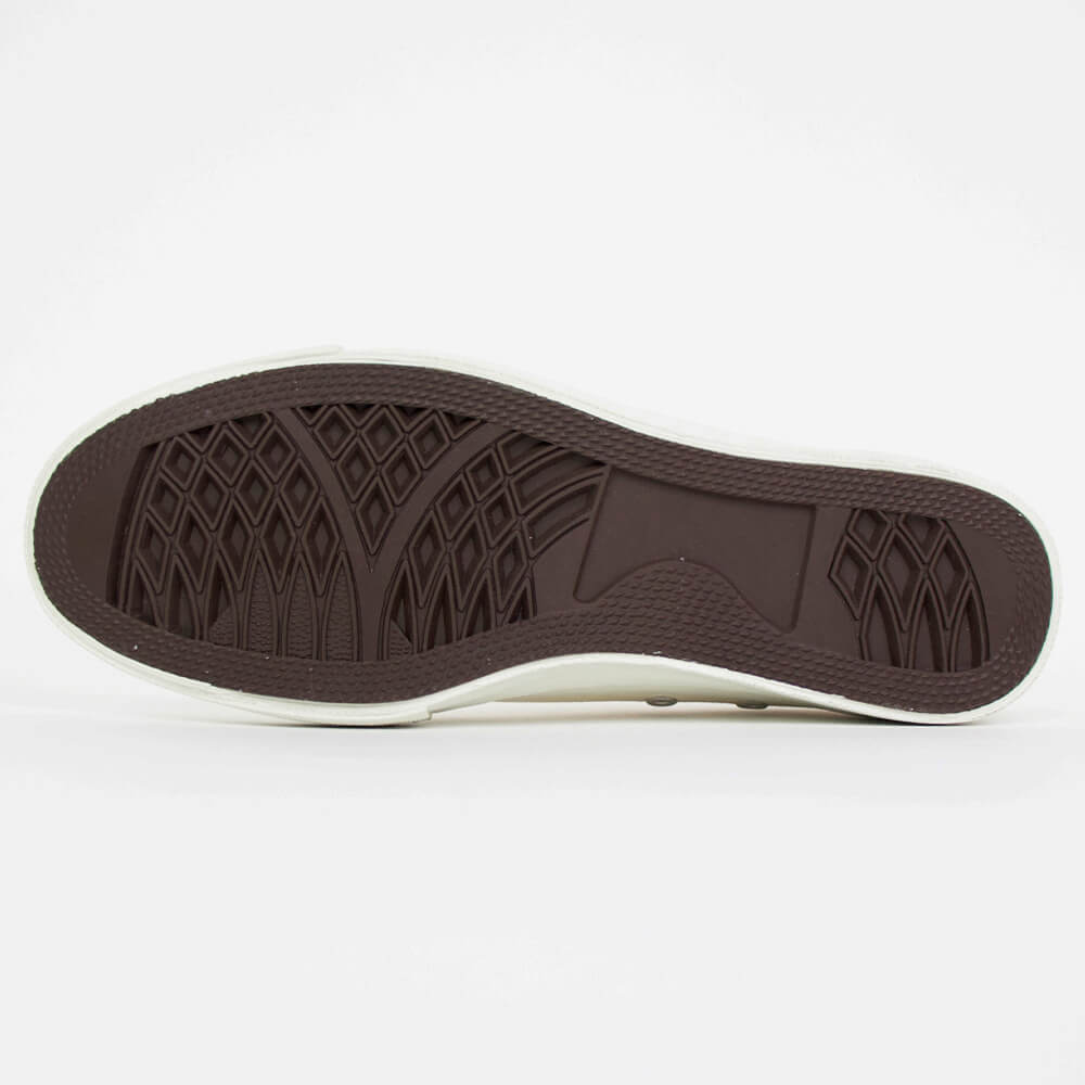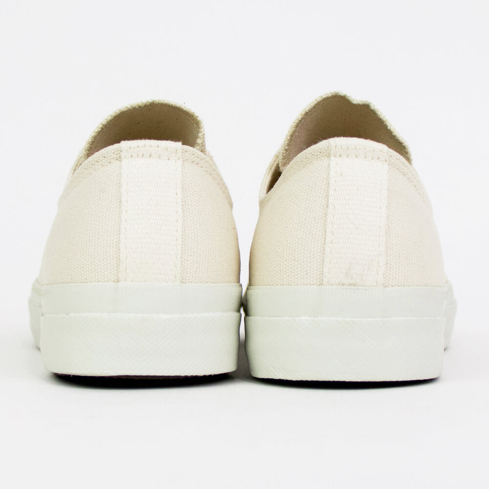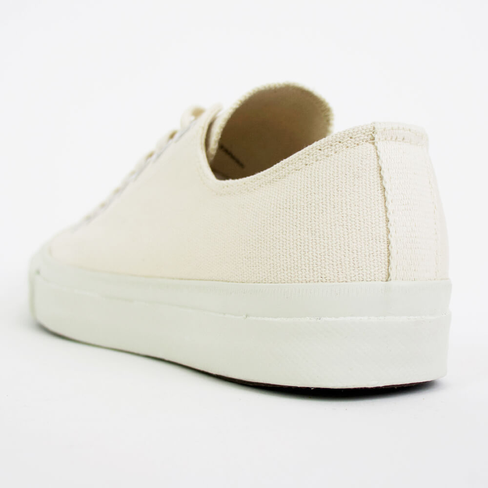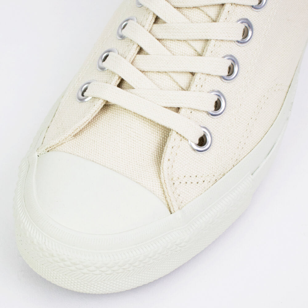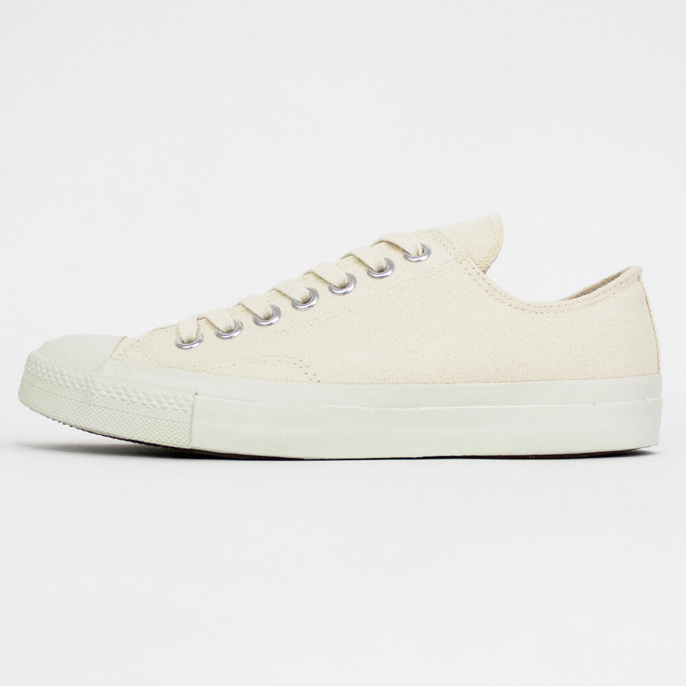 底面は当時と同じ意匠の物を使用し、製法は当時のままバルカナイズ製法で。アッパーには12オンスのキャンバス、コットン100%のシューレース、サイドステッチ、サイド当て布(かもめ)、ベロの長さ、形、踵テープ、ハトメの色、トゥバンパーの左右対称、フォクシングテープの縦模様、ルーズライニング、フリクションテープ(間に布を貼っている)など、忠実に再現しながらもインソールにクッション性の高いインソールを使用するなど、現代的にアップデートされています。