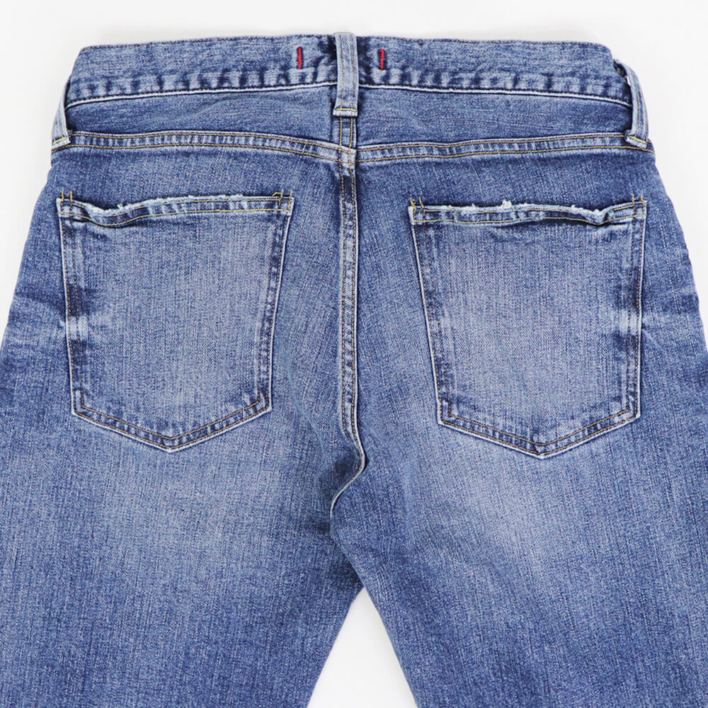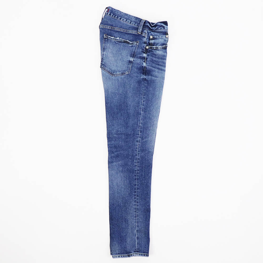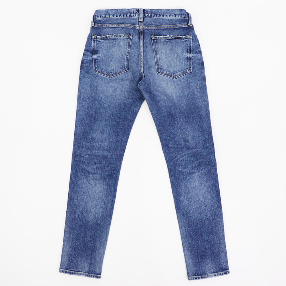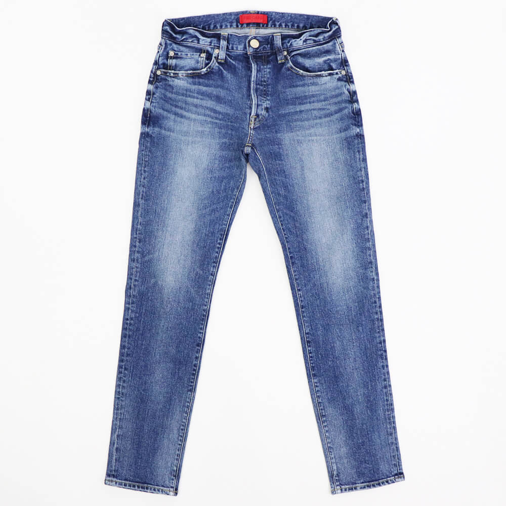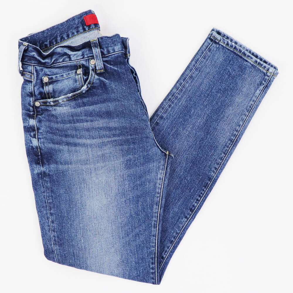 腿から膝下にかけて自然にテーパードされている「スリムテーパード」シルエットを採用しており、日本人の体型に合わせたヒップやポケットの位置、レングスなどが調整されています。また立体的な作りなのでスリムテーパードながら窮屈は穿き心地を感じることはありません。穿き込んでいくにつれ身体に馴染み独自の風合いが増していくのがデニムの最大の魅力です。自分だけの愛着のある一本に育てるのも楽しいですね。カジュアルなスタイルはもちろん、少しキレイめなスタイルとの相性の良いデニムです。