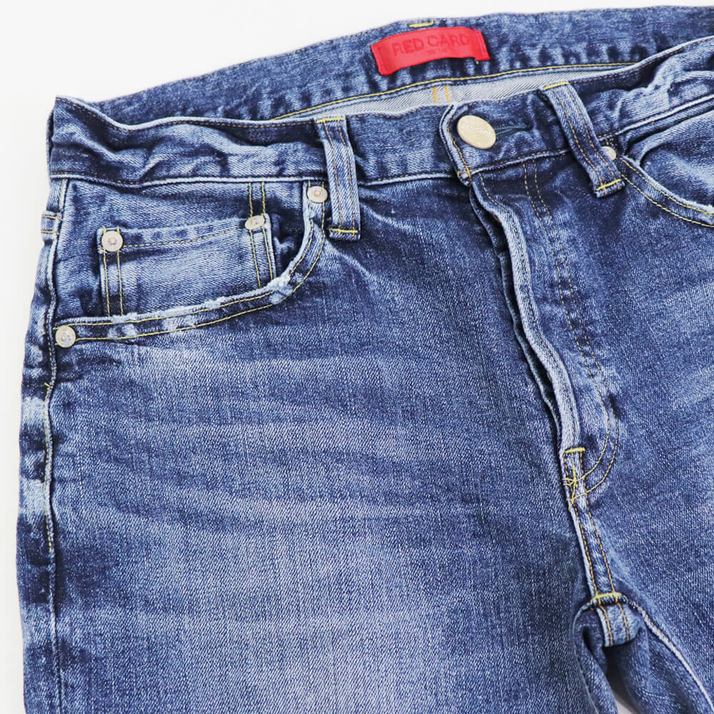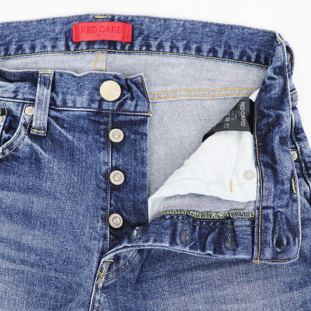 RED CARD(レッドカード)の中でも圧倒的支持を集めるヒットモデル「Rhythm」が今季も入荷いたしました。 RED CARDといえば「リアルヴィンテージ感」は今季も健在で、拘りが強いデニム好きも唸る仕上がりです。独自の加工を施し自然な経年変化の雰囲気を醸し出し、加工を入れすぎる事のないヴィンテージ感が溢れる一本です。ポリウレタン混のデニム生地は見た目以上にストレッチが効いており、穿いた瞬間からその穿き心地の良さを実感出来ます。フロントはジップではなくあえてボタンフライにし、ポケット口や裾などの絶妙なダメージ加工など各所のディテールも完璧です。