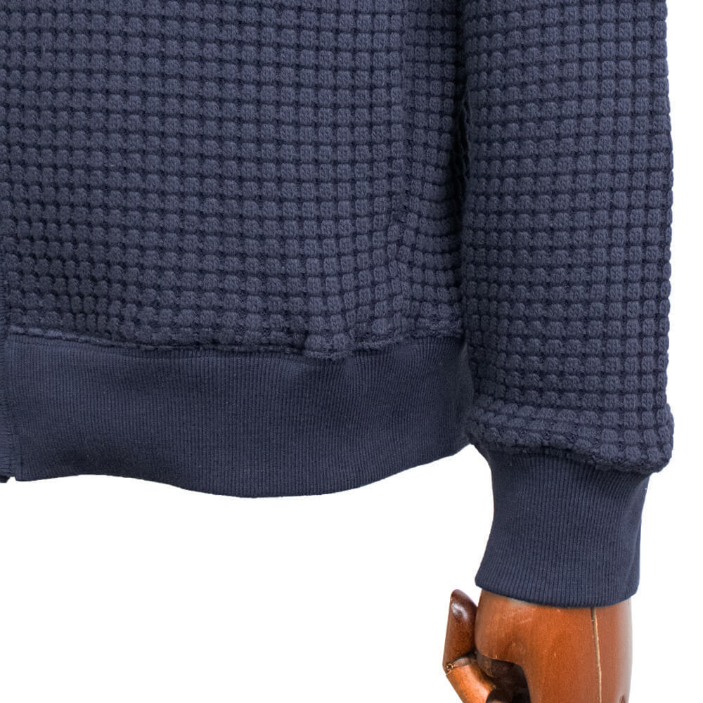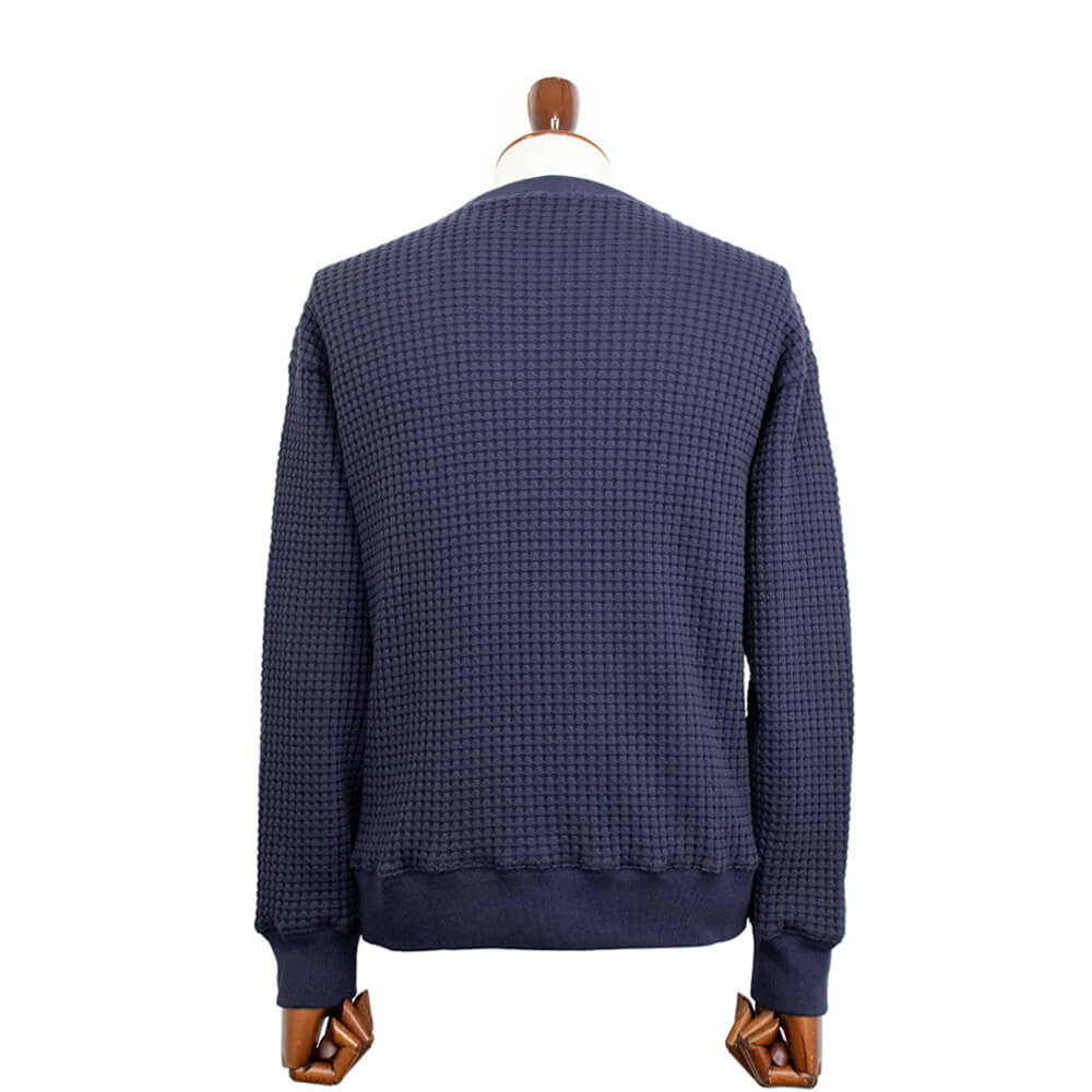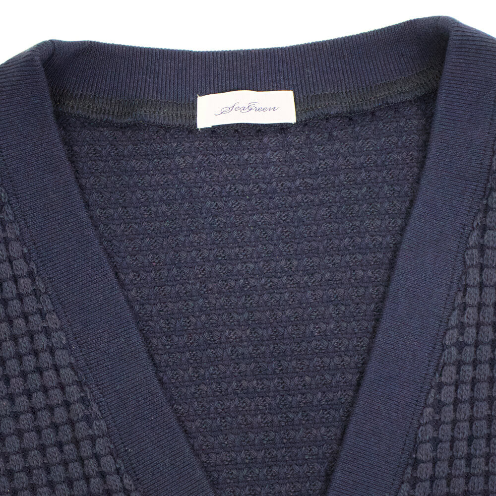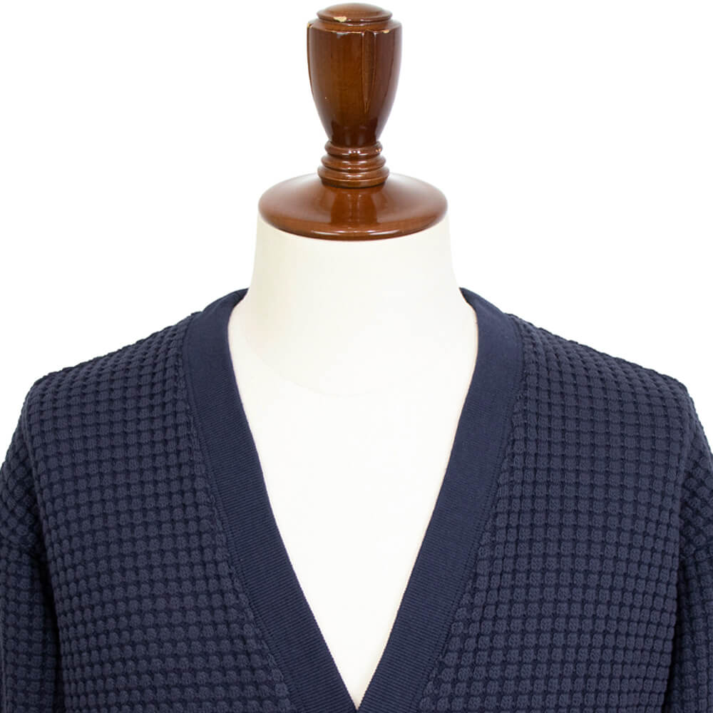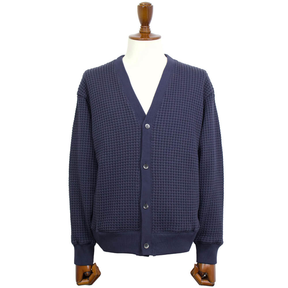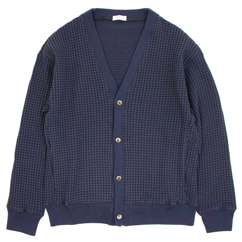 Seagreenの代名詞的存在のワッフル素材のカーディガンです。肌触りの良い網目の大きいワッフル素材を採用し、あえてゆったりとしたシルエットで作ることでリラックス感を強調したユニセックスでも着用できる一着です。国内に数台しかない編み機を用いて表面にコットン、裏面に伸縮性のあるポリエステルを使用することで立体感のある肌触りの良い大きなワッフル柄を表現しています。大人のリラックスしたカジュアルスタイルにぴったりな品のあるカーディガンです。