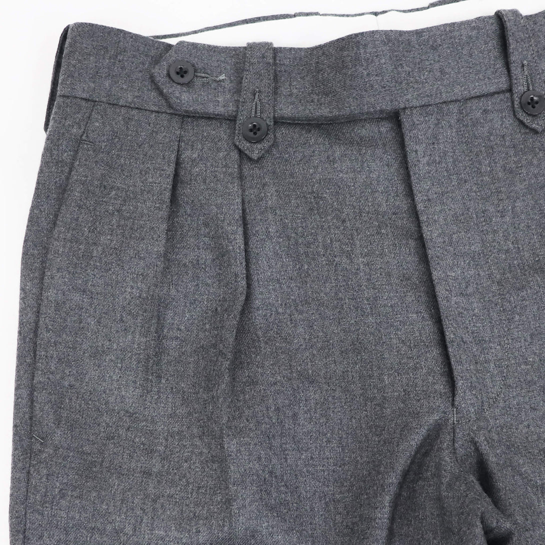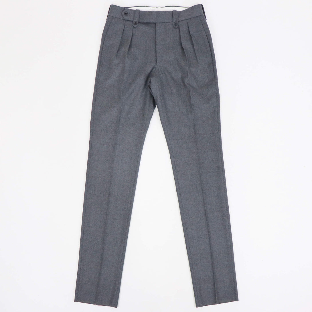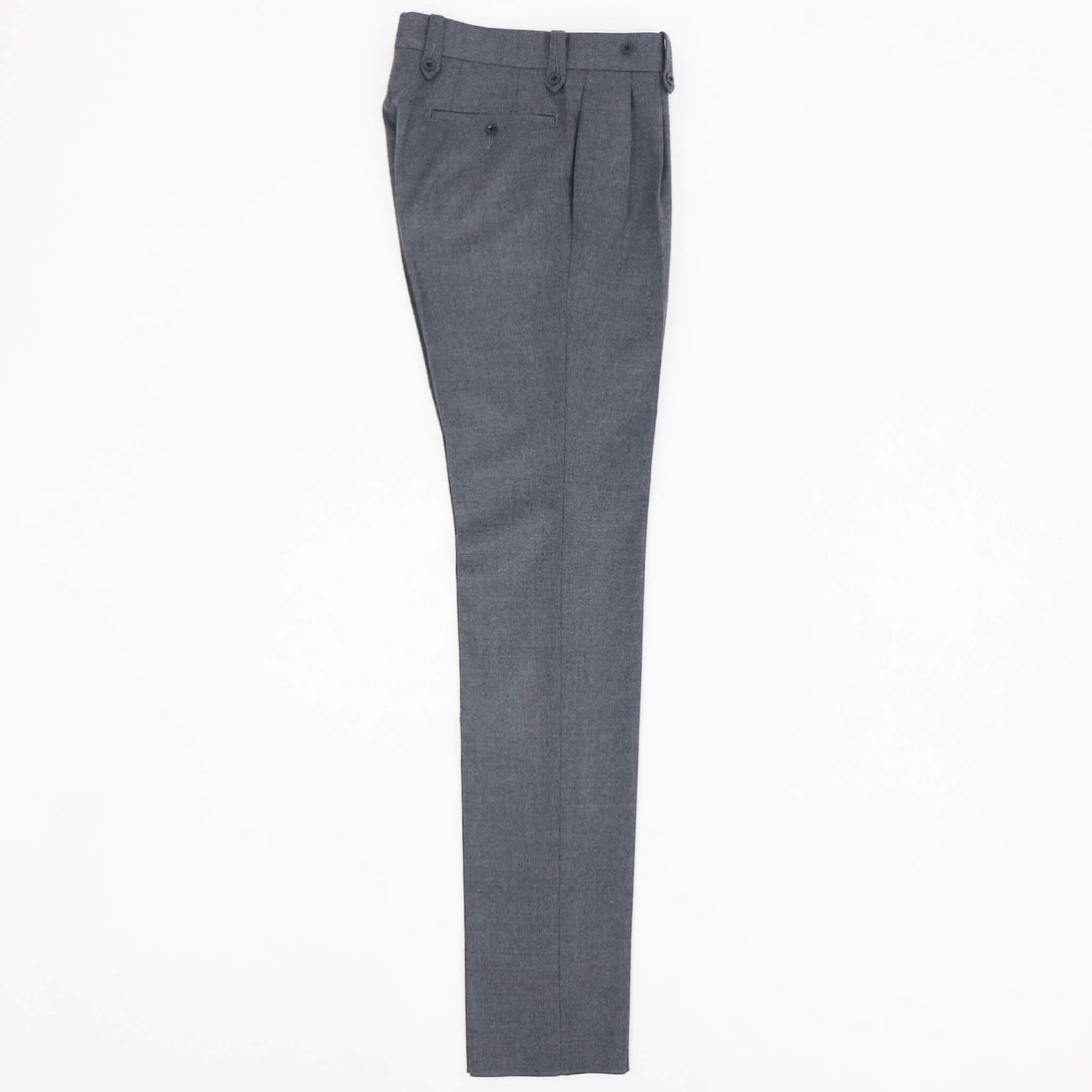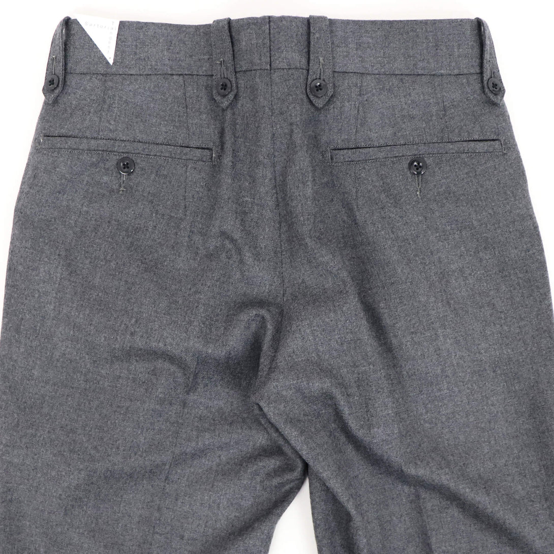 英国軍40’sのグルカパンツがベース。サイドアジャスターベルトなどでウエストを調整するものが有名ですが、こちらの初期タイプはウエストフロント部の長めの持ち出しでサイズを調整する仕様。ベルト部分には特徴的なボタン留めのループタブが配されています。テイラードパンツで使用されるプリーツ入りのマーベルトと、芯地を使用し吸いつくような腰回りの着心地を実現。渡りから裾にかけてテーパードでスリムなシルエットのパンツです。