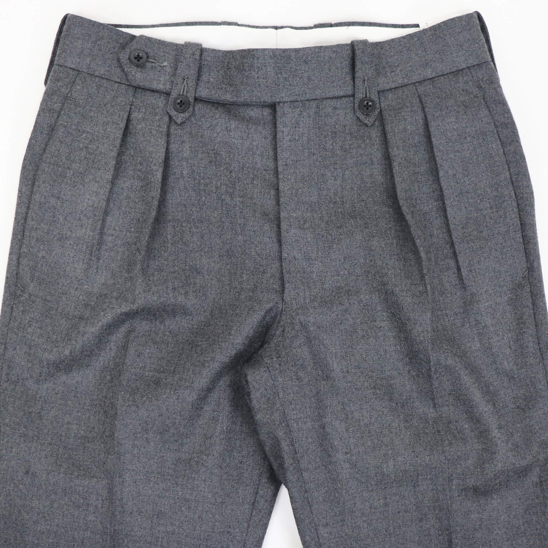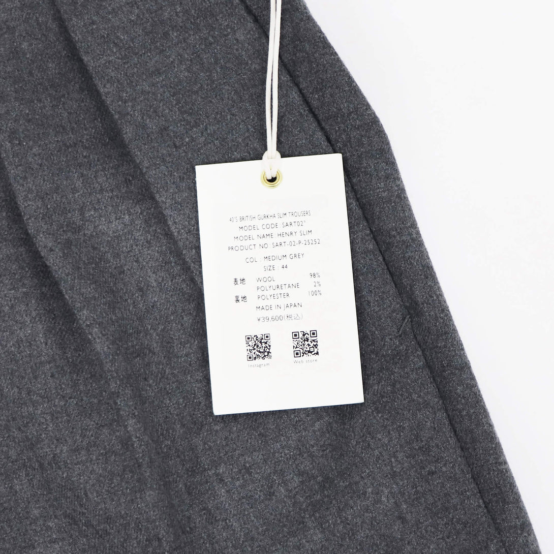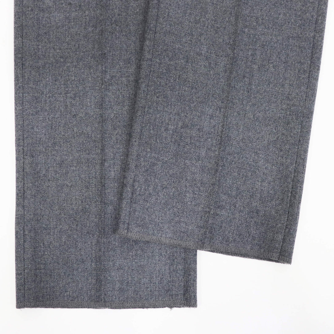 英国軍40’sのグルカパンツがベース。サイドアジャスターベルトなどでウエストを調整するものが有名ですが、こちらの初期タイプはウエストフロント部の長めの持ち出しでサイズを調整する仕様。ベルト部分には特徴的なボタン留めのループタブが配されています。テイラードパンツで使用されるプリーツ入りのマーベルトと、芯地を使用し吸いつくような腰回りの着心地を実現。渡りから裾にかけてテーパードでスリムなシルエットのパンツです。