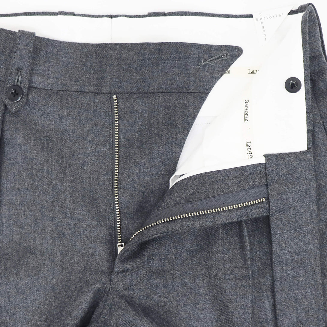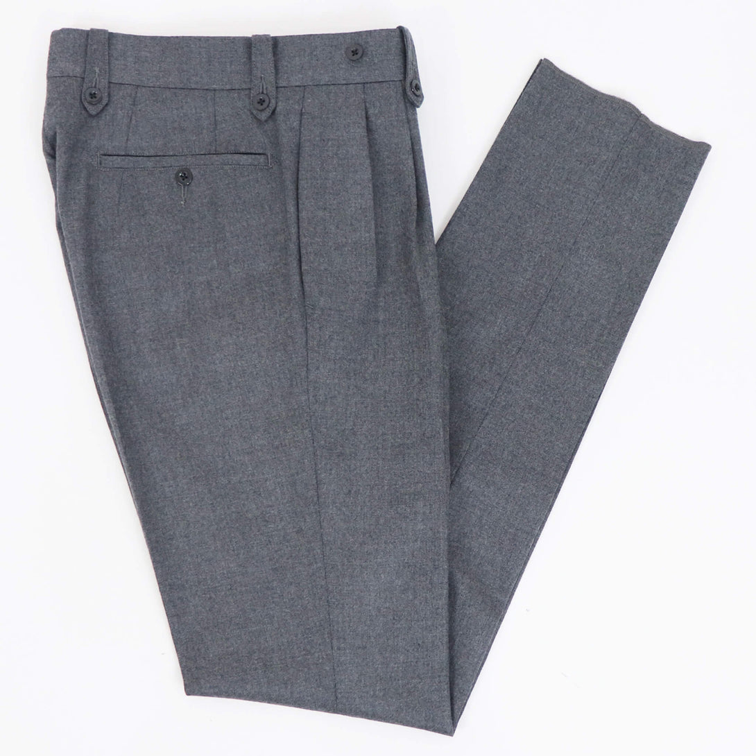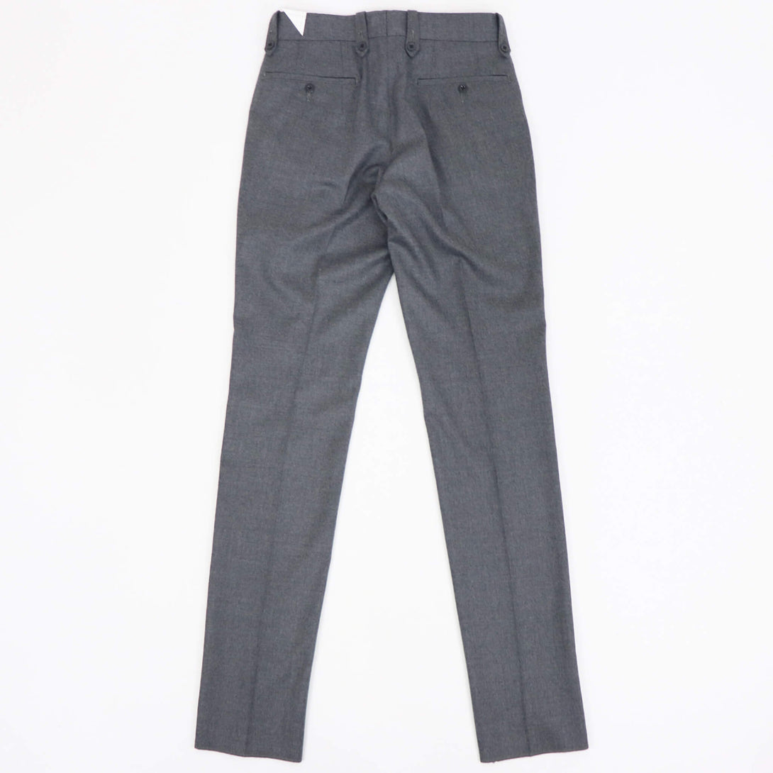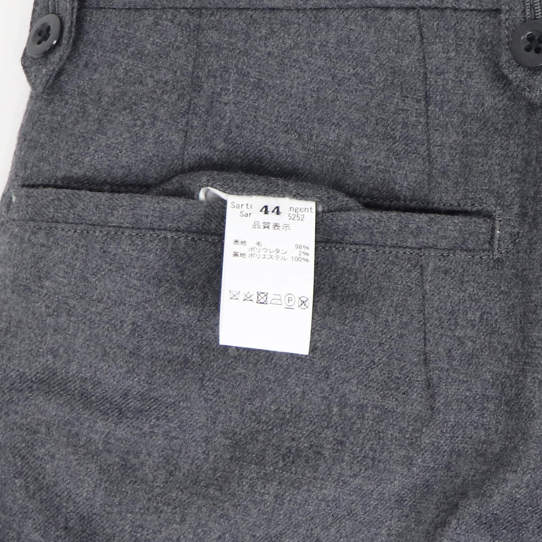 英国軍40’sのグルカパンツがベース。サイドアジャスターベルトなどでウエストを調整するものが有名ですが、こちらの初期タイプはウエストフロント部の長めの持ち出しでサイズを調整する仕様。ベルト部分には特徴的なボタン留めのループタブが配されています。テイラードパンツで使用されるプリーツ入りのマーベルトと、芯地を使用し吸いつくような腰回りの着心地を実現。渡りから裾にかけてテーパードでスリムなシルエットのパンツです。
