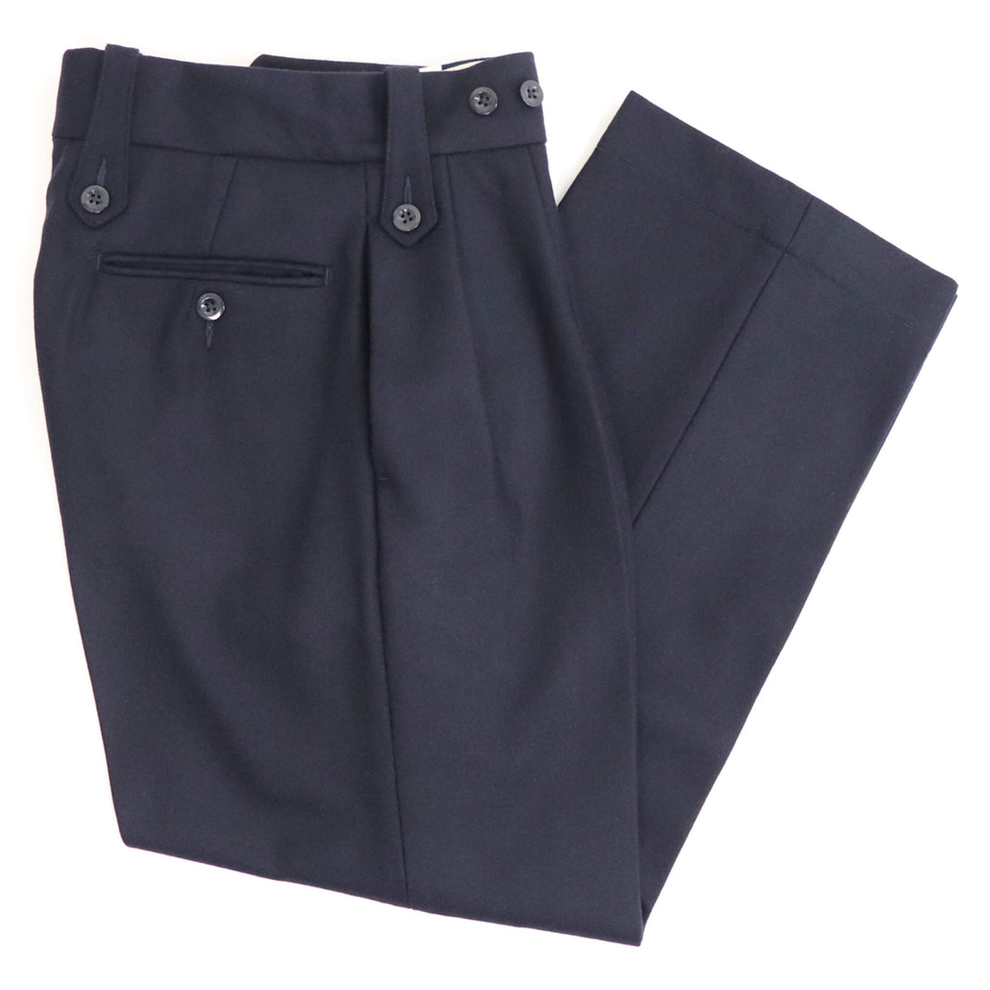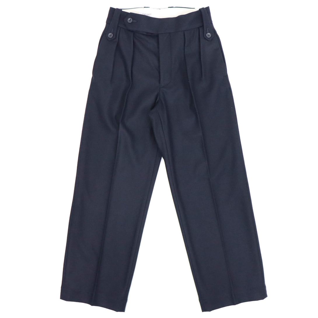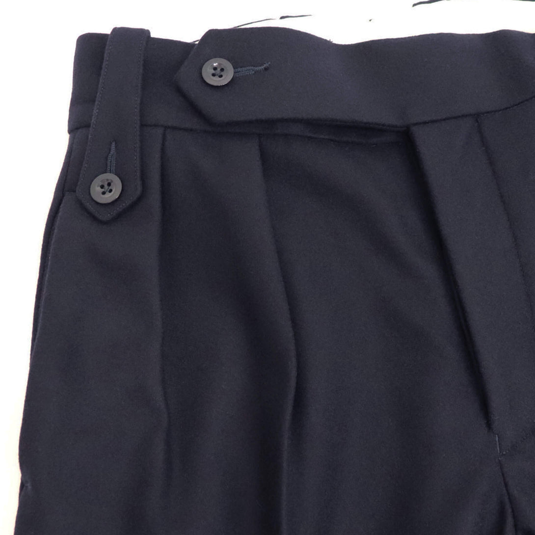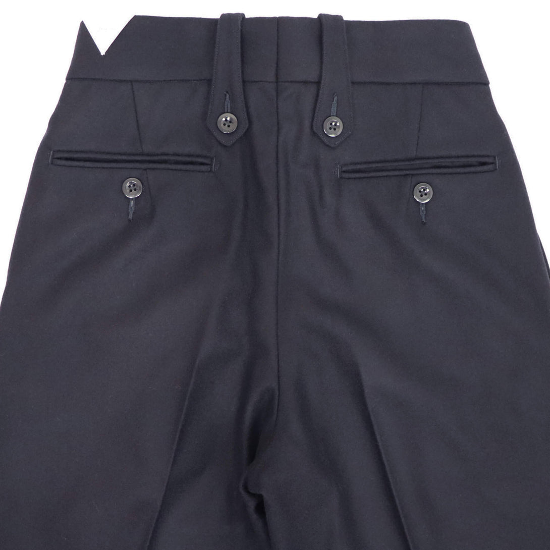 英国軍40’s のグルカパンツがベース。サイドアジャスターベルトなどでウエストを調整するものが有名だが、こちらの初期タイプはウエストフロント部の長めの持ち出しでサイズを調整する仕様なっています。ベルト部分には特徴的なボタン留めのループタブが配されていて、テイラードパンツで使用されるプリーツ入りのマーベルトと、芯地を使用し吸いつくような腰回りの着心地を実現。ワタリから裾にかけてストレートでワイドなシルエットが特徴のパンツです。