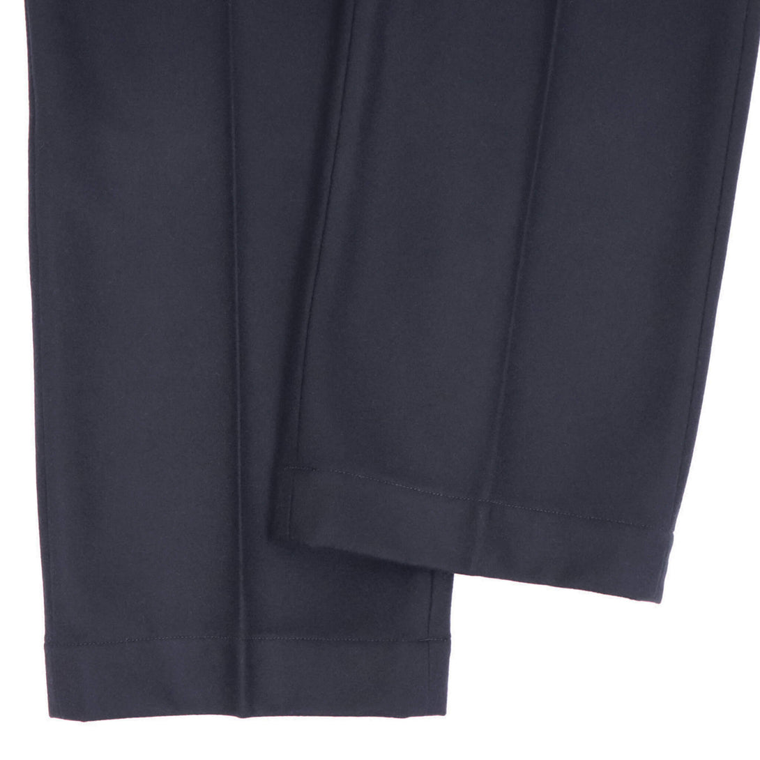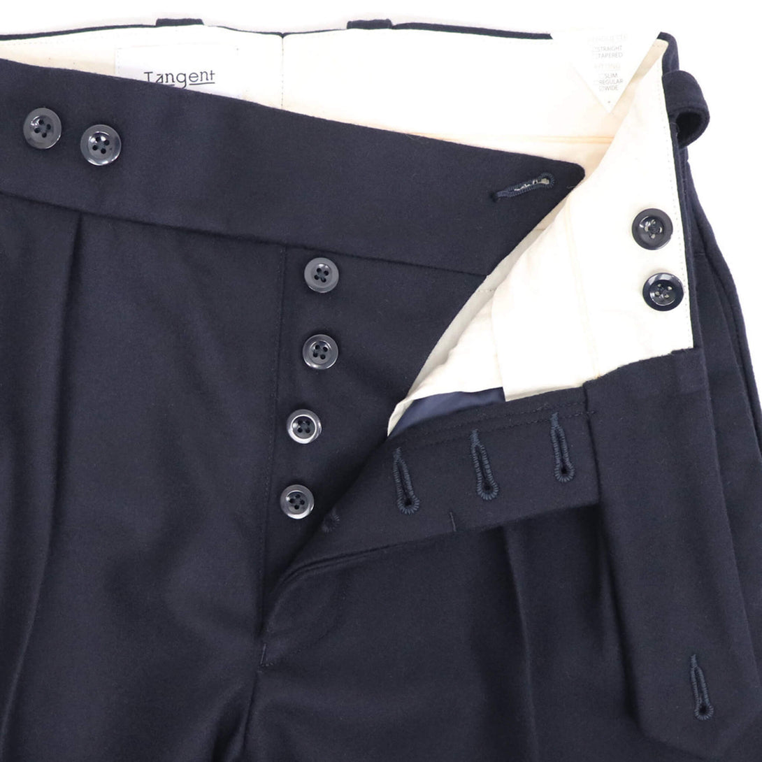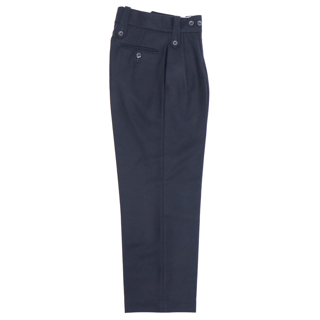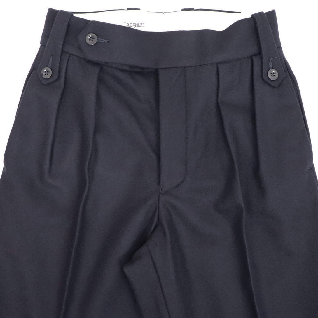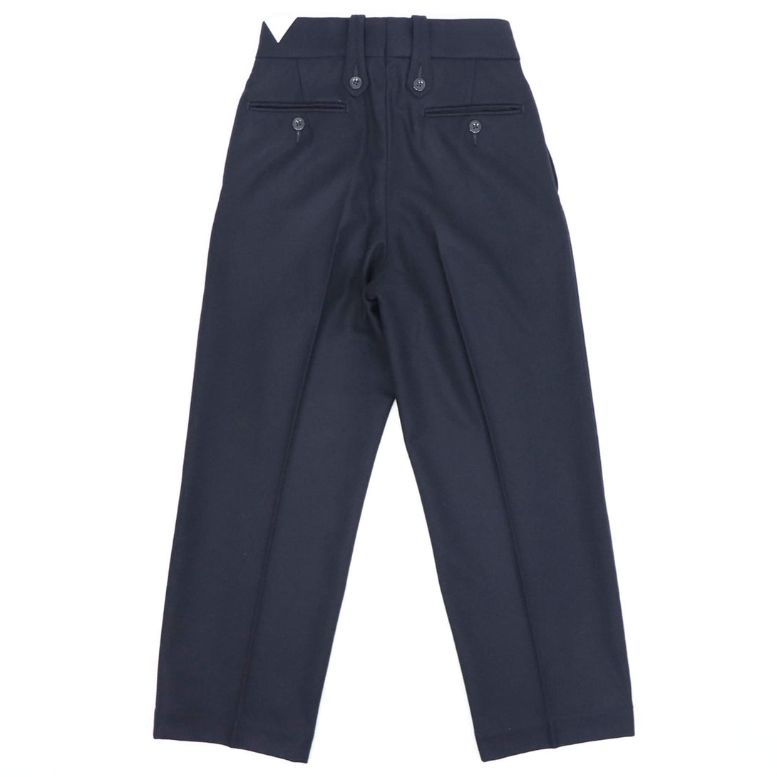 英国軍40’s のグルカパンツがベース。サイドアジャスターベルトなどでウエストを調整するものが有名だが、こちらの初期タイプはウエストフロント部の長めの持ち出しでサイズを調整する仕様なっています。ベルト部分には特徴的なボタン留めのループタブが配されていて、テイラードパンツで使用されるプリーツ入りのマーベルトと、芯地を使用し吸いつくような腰回りの着心地を実現。ワタリから裾にかけてストレートでワイドなシルエットが特徴のパンツです。