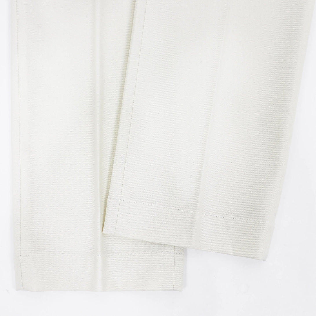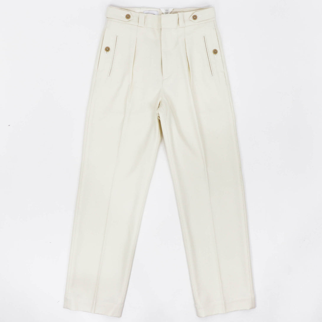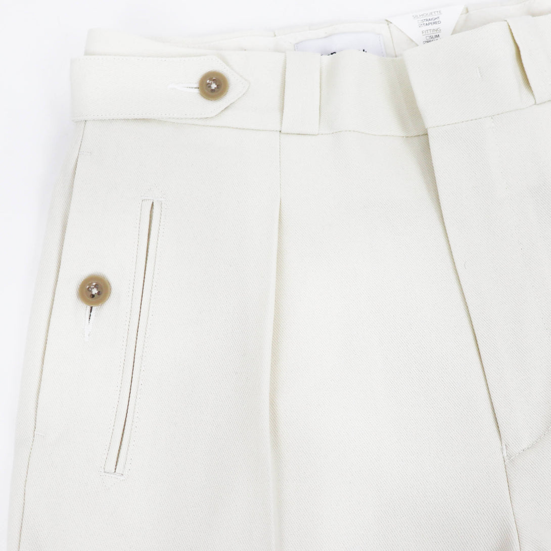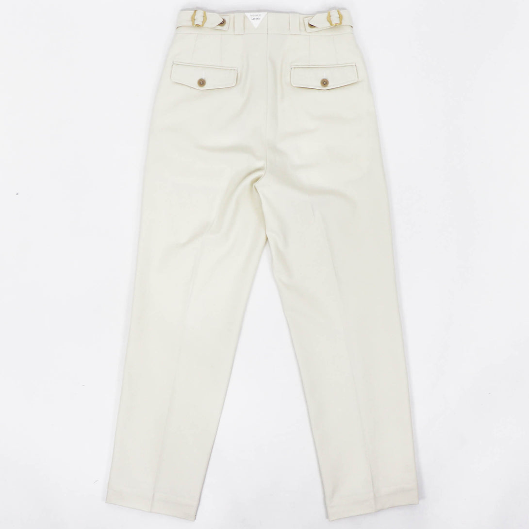 フロントは1プリーツで、ジャケット合わせの相性も考慮し、絞り用の裾のドローコードは排除されすっきりした足元に。テイラードパンツで使用されるプリーツ入りのマーベルトと芯地を使用し吸いつくような腰回りの着心地を実現。膝から裾にかけてきれいにゆるやかにテイパードしており、フィッティングはややゆったり目のレギュラーフィット。遊びのきいたディテールの多いオリジナリティある一本。