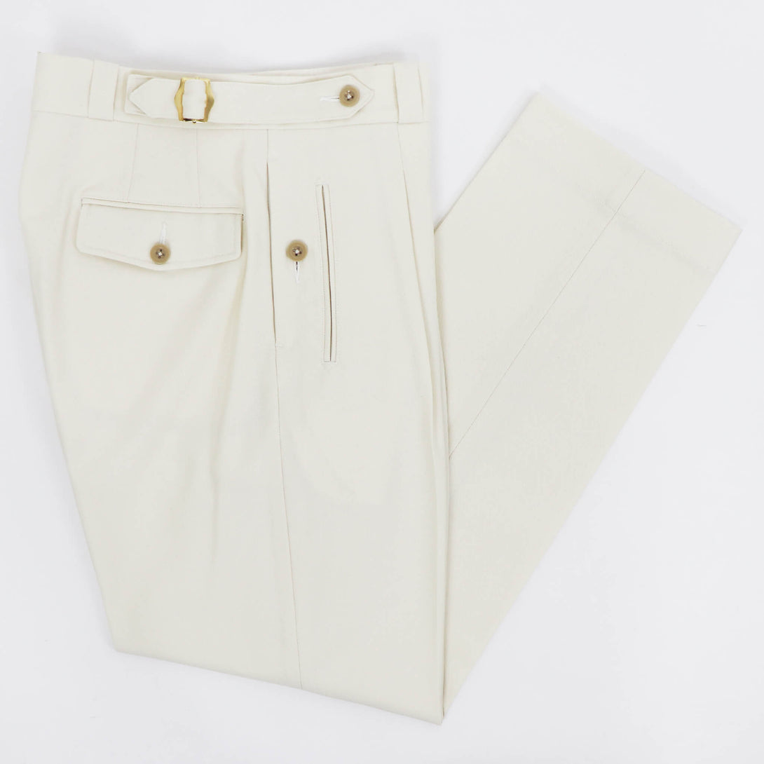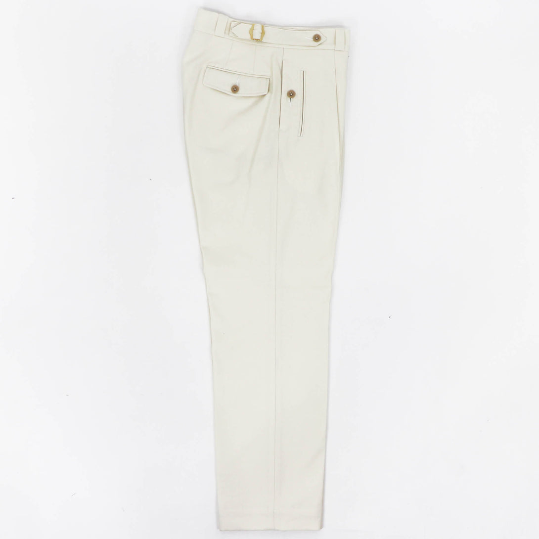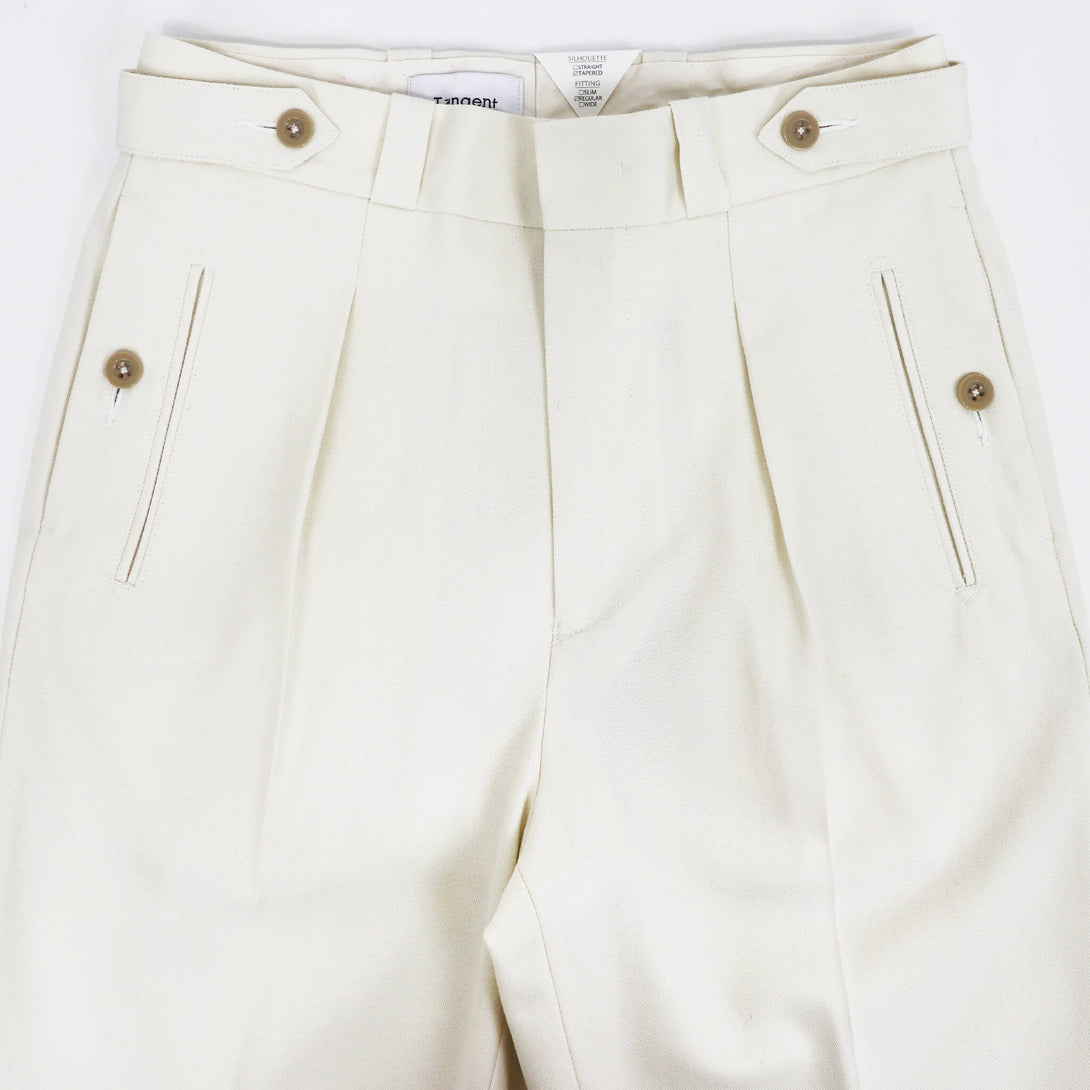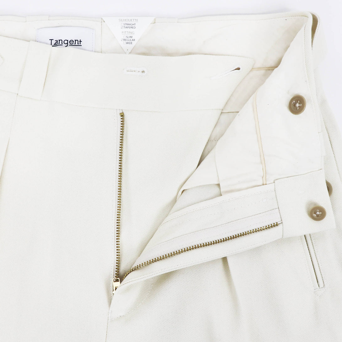 フロントは1プリーツで、ジャケット合わせの相性も考慮し、絞り用の裾のドローコードは排除されすっきりした足元に。テイラードパンツで使用されるプリーツ入りのマーベルトと芯地を使用し吸いつくような腰回りの着心地を実現。膝から裾にかけてきれいにゆるやかにテイパードしており、フィッティングはややゆったり目のレギュラーフィット。遊びのきいたディテールの多いオリジナリティある一本。