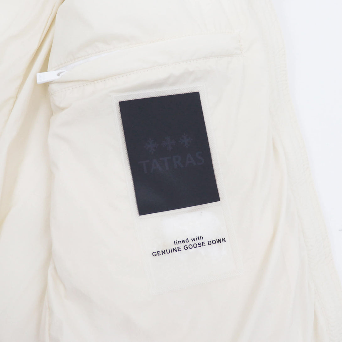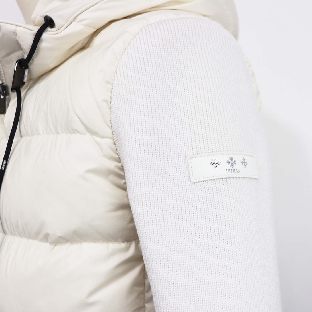 今季のTATRAS(タトラス)は、コンビブルゾンのKEITIE(ケイティー)をセレクト。見頃はダウン、袖はウールのフード一体型コンビネーションブルゾン。ダウンの膨らみが程よく存在感を主張し、着るだけでスタイリッシュなシルエットが完成する一着となります。身頃はマットに仕上げたナイロン、袖のニット部分には上質なメリノウールを使用。極限まで毛羽を抑えた糸を使うことで、素肌に触れてもチクチクしない仕上がりになっています。ファスナーは軽量なプラスチックファスナー。引き手やスピンドルのチップなど要所を引き締めるメタルがTATRASらしい高級感ある仕上がりとなっています。