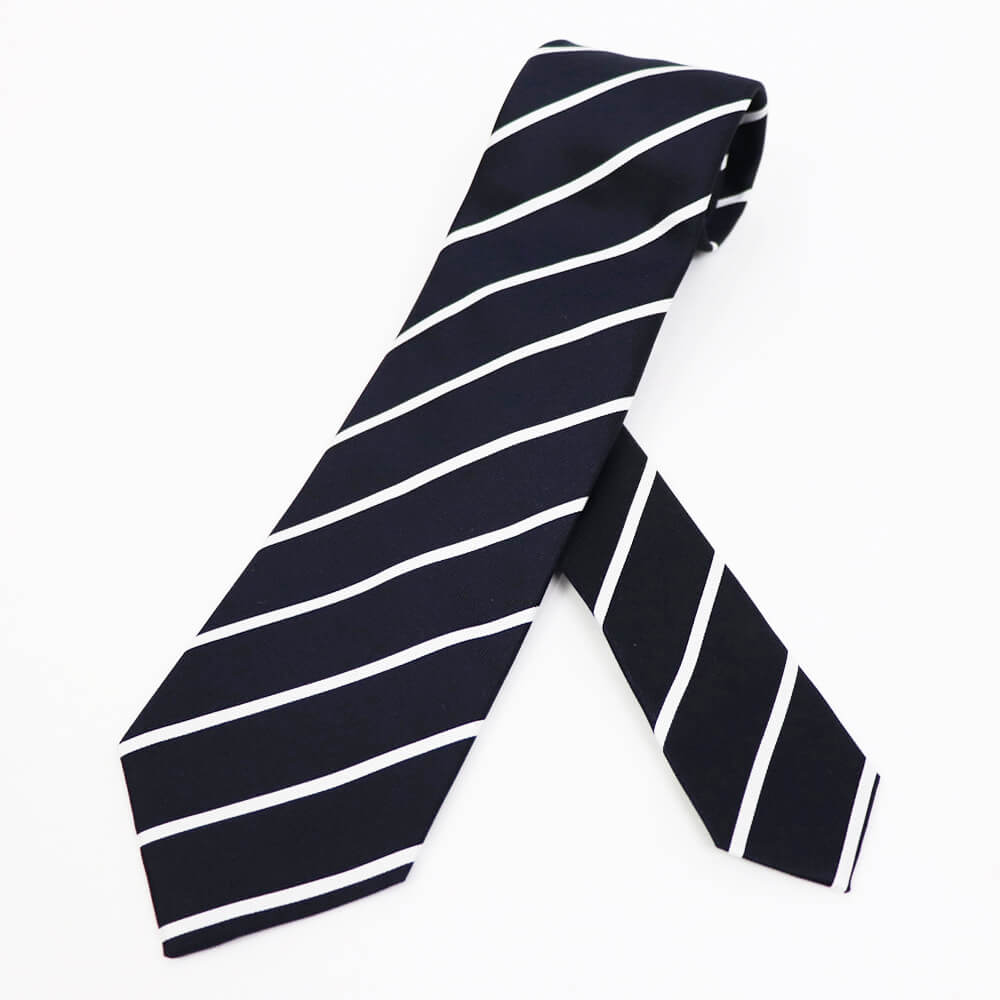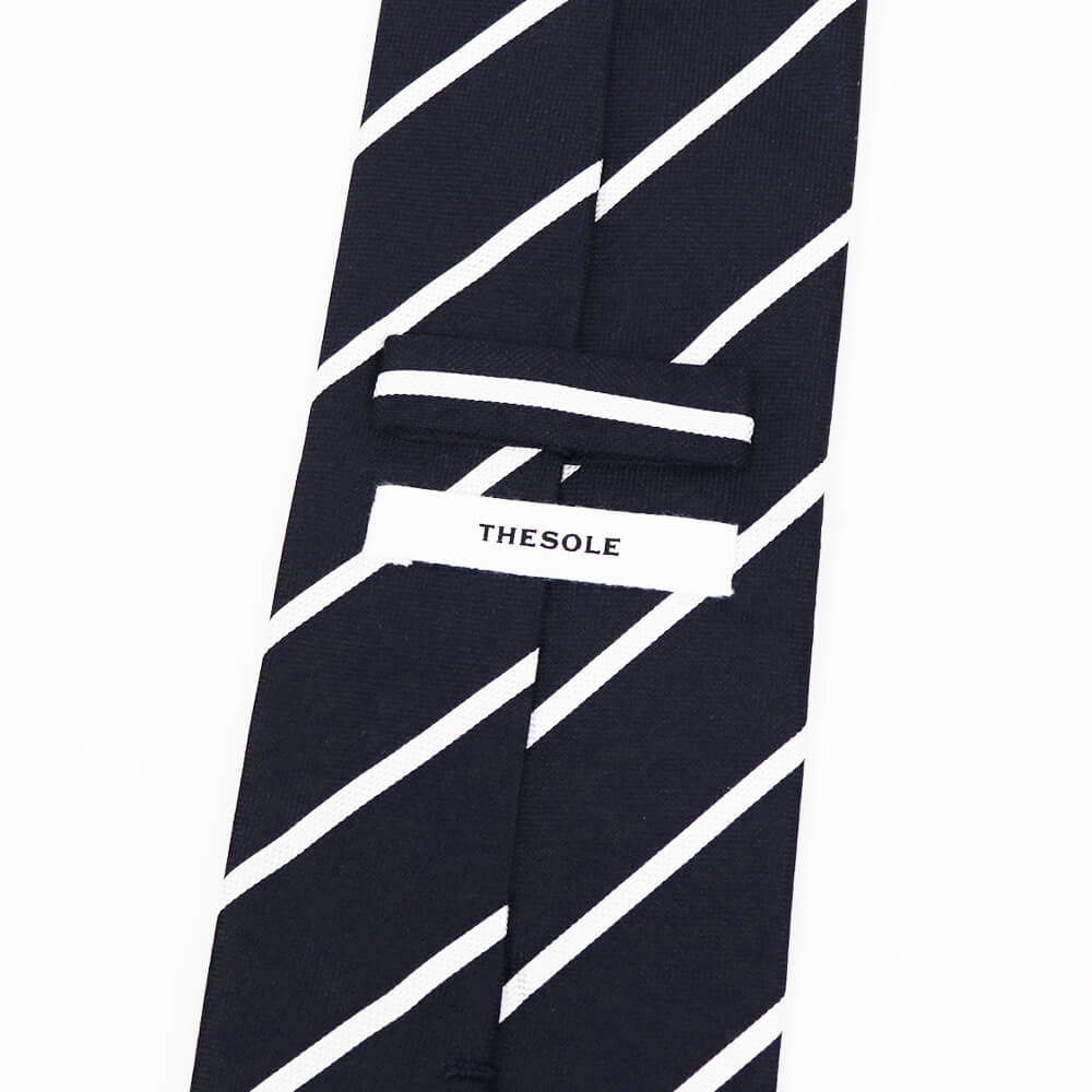 「究極のネクタイとは?」 20年以上ネクタイビジネスに従事する、ネクタイのプロフェッショナルと共に究極ネクタイを作るプロジェクトから誕生した至高のレジメンタルタイです。 一般的に経糸は1色のみの物が多いですが、今回はヤスラ経と呼ばれる2色の経糸をを使う特殊な技法を用い、黒と白の2色の経糸で織り上げた素材で仕上げています。そのためベースの濃紺部分には経糸の黒を、ストライプの白部分には経糸の白が出るように緯糸と絡ませて濃淡をしっかり分けたバスケット組織に織り上げています。 特筆すべきは、このミリ単位での拘りのつまったストライプ柄です。地の部分は23mm、ストライプの部分は3mmで構成されており、一般的には偶数値で作ることの多いレジメンタル柄ですが、地もストライプもミリ単位に拘ったバランスです。長年柄を作り続けてきた並木氏が辿り着いた、シンプルなストライプ柄を最大限にカッコよく見せるピッチです。その織り上げた生地は独自の整理加工を行うことにより最高の風合いを生んでいます。表生地にマッチするベストな芯地を入れ、熟練の職人が丁寧に手縫いで縫製した逸品です。 シンプルながら、普段のドレススタイルを上品に格上げする最高のネクタイです。