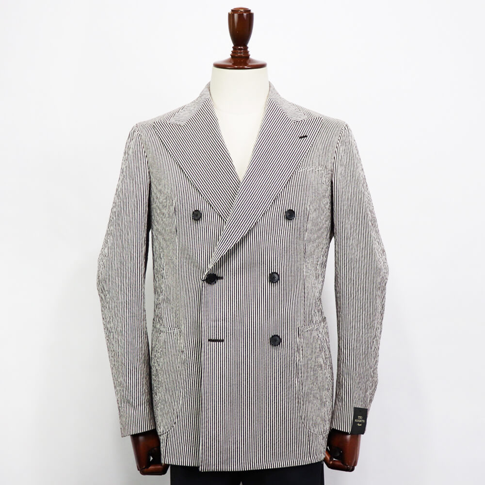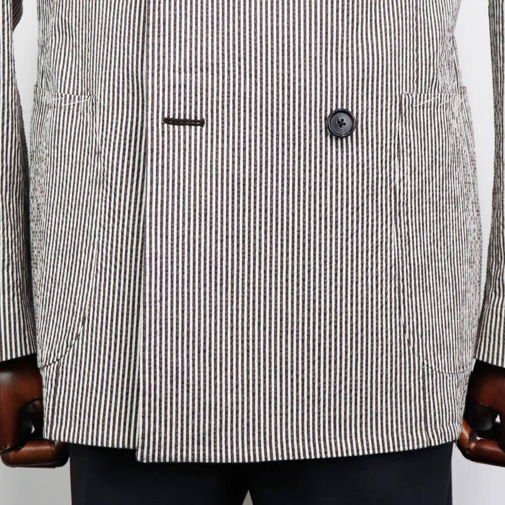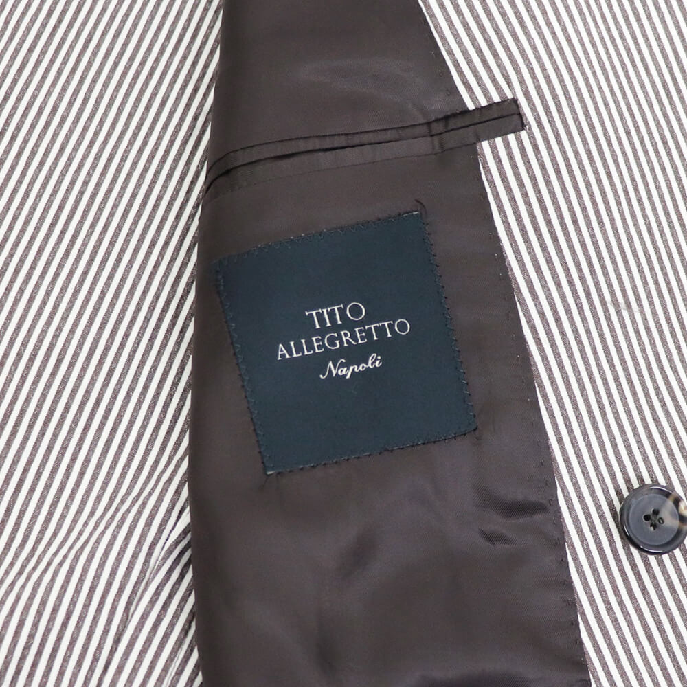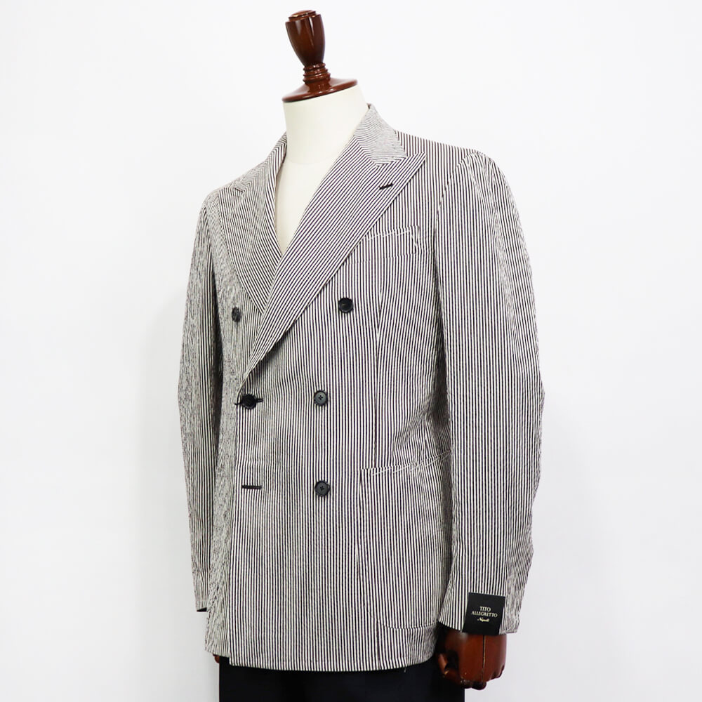 今季のセレクトは、コットン生地や春夏ですとシアサッカーなどを得意としているイタリアのビエラ地区の『SUBALPINO』の生地をセレクトしました。ティトと言えばダブルブレストのイメージが強いので、形はダブルブレストにしました。あえてセットアップではなくジャケットだけのセレクトで、より気軽にジャケットスタイルをお楽しみ頂ければと思います。細かいディテールは、裾まで抜いた前ダーツ、カーブがかっているゴージライン。小さなアームホールにやや太い袖を取り付けてできた迫力のある肩ギャザー。コンパクトな衿ミツに高いノボリ、などまるでサルトが作ったジャケットのよう。それをフルマシンメイドすることにより、優れたコストパフォーマンスを実現させ、ナポリ仕立てをより身近に感じられるようにした点が特徴的なジャケットブランドです。