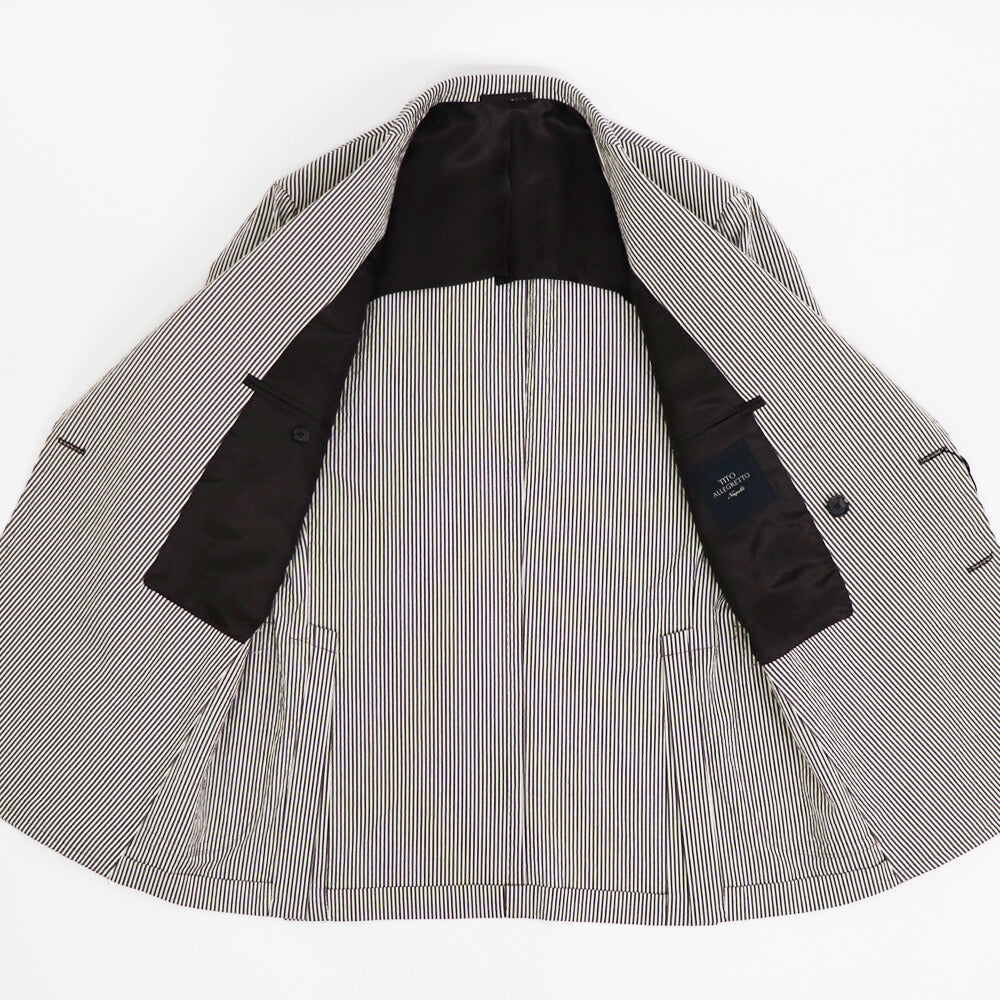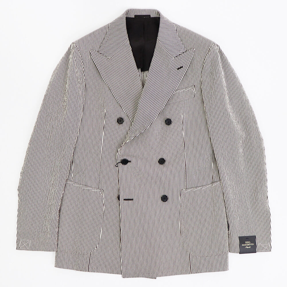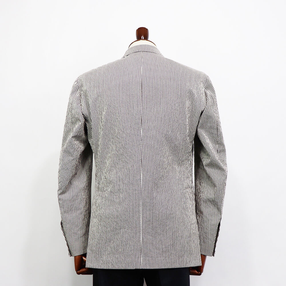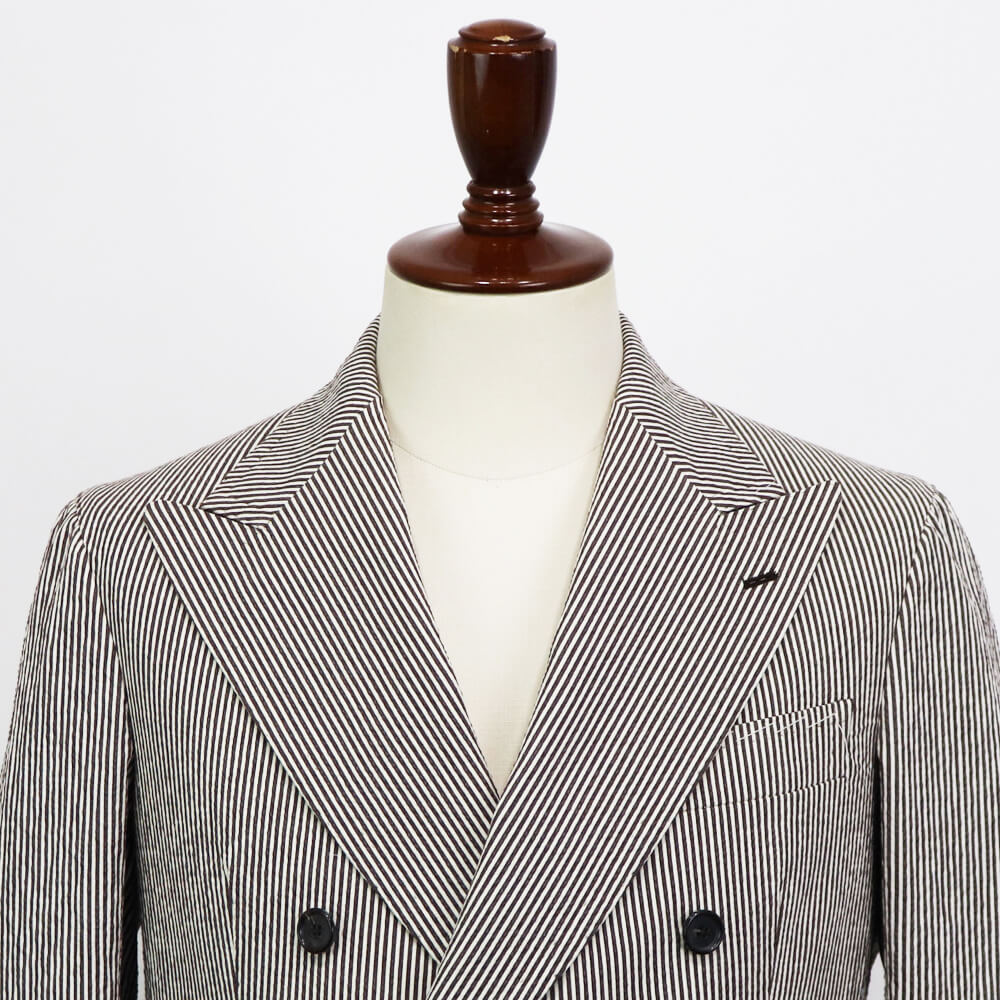 今季のセレクトは、コットン生地や春夏ですとシアサッカーなどを得意としているイタリアのビエラ地区の『SUBALPINO』の生地をセレクトしました。ティトと言えばダブルブレストのイメージが強いので、形はダブルブレストにしました。あえてセットアップではなくジャケットだけのセレクトで、より気軽にジャケットスタイルをお楽しみ頂ければと思います。細かいディテールは、裾まで抜いた前ダーツ、カーブがかっているゴージライン。小さなアームホールにやや太い袖を取り付けてできた迫力のある肩ギャザー。コンパクトな衿ミツに高いノボリ、などまるでサルトが作ったジャケットのよう。それをフルマシンメイドすることにより、優れたコストパフォーマンスを実現させ、ナポリ仕立てをより身近に感じられるようにした点が特徴的なジャケットブランドです。