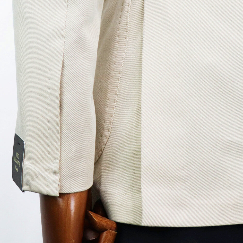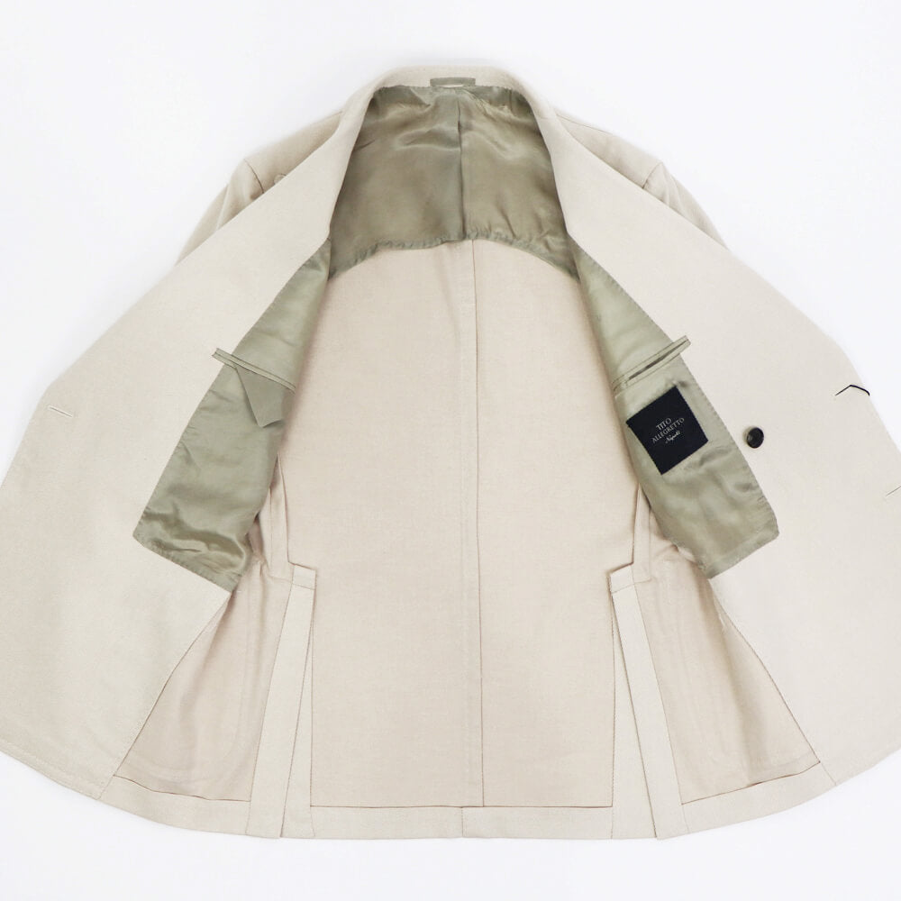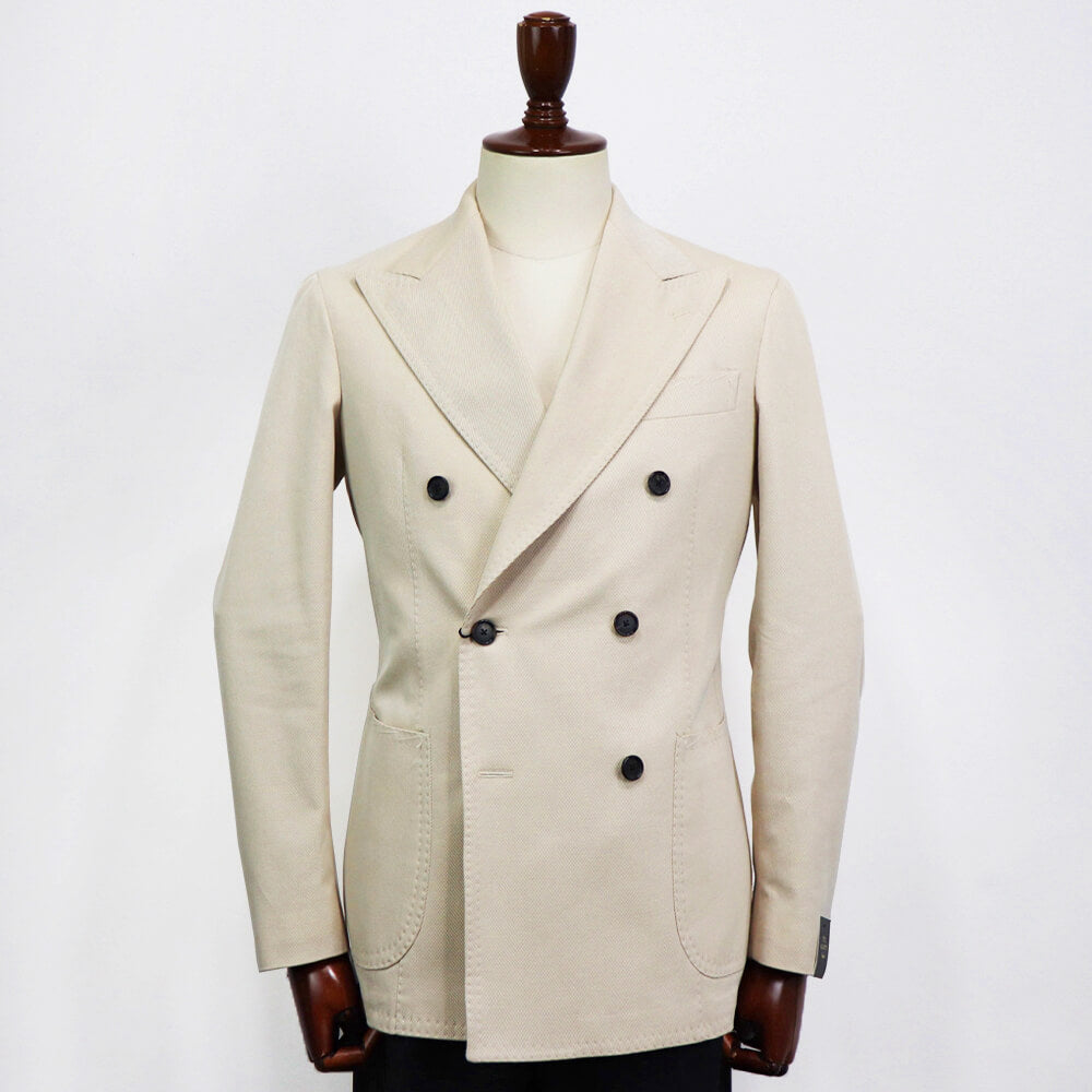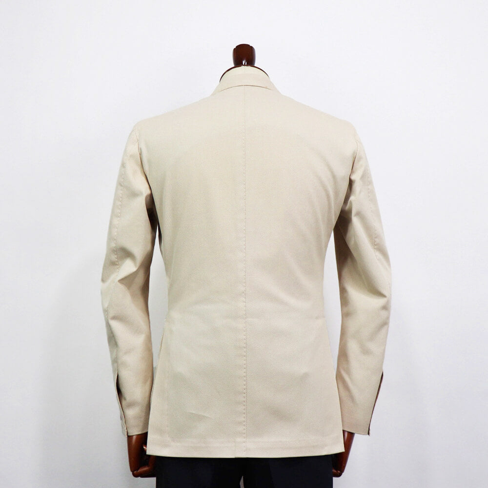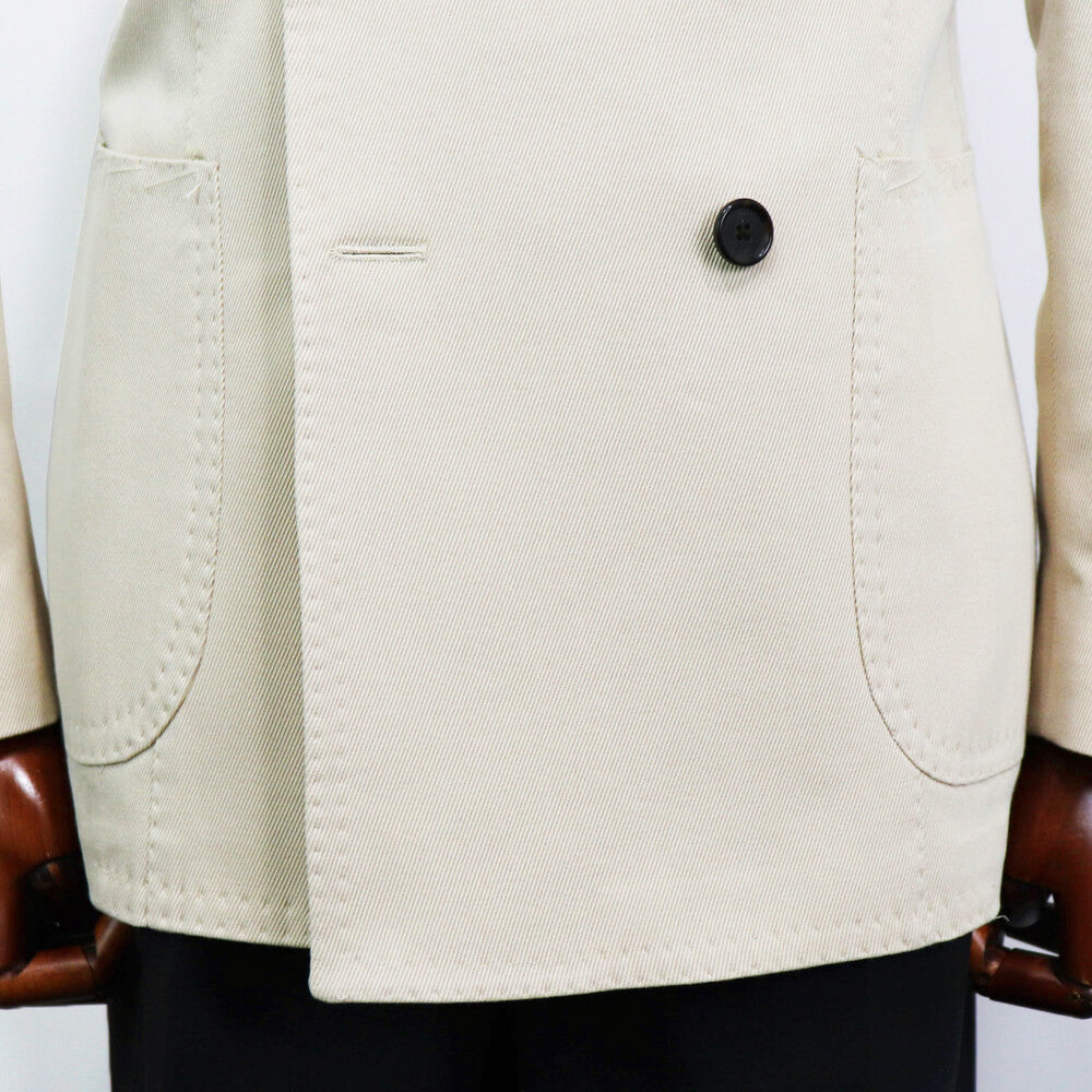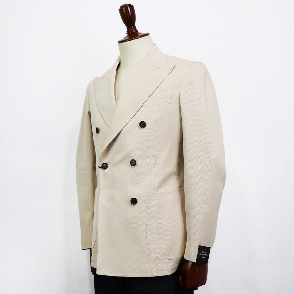 今季のセレクトは、コットン生地や春夏ですとシアサッカーなどを得意としているイタリアのビエラ地区の『SUBALPINO』の生地をセレクトしました。ティトと言えばダブルブレストのイメージが強いので、形はダブルブレストにしました。あえてセットアップではなくジャケットだけのセレクトで、より気軽にジャケットスタイルをお楽しみ頂ければと思います。細かいディテールは、裾まで抜いた前ダーツ、カーブがかっているゴージライン。小さなアームホールにやや太い袖を取り付けてできた迫力のある肩ギャザー。コンパクトな衿ミツに高いノボリ、などまるでサルトが作ったジャケットのよう。それをフルマシンメイドすることにより、優れたコストパフォーマンスを実現させ、ナポリ仕立てをより身近に感じられるようにした点が特徴的なジャケットブランドです。