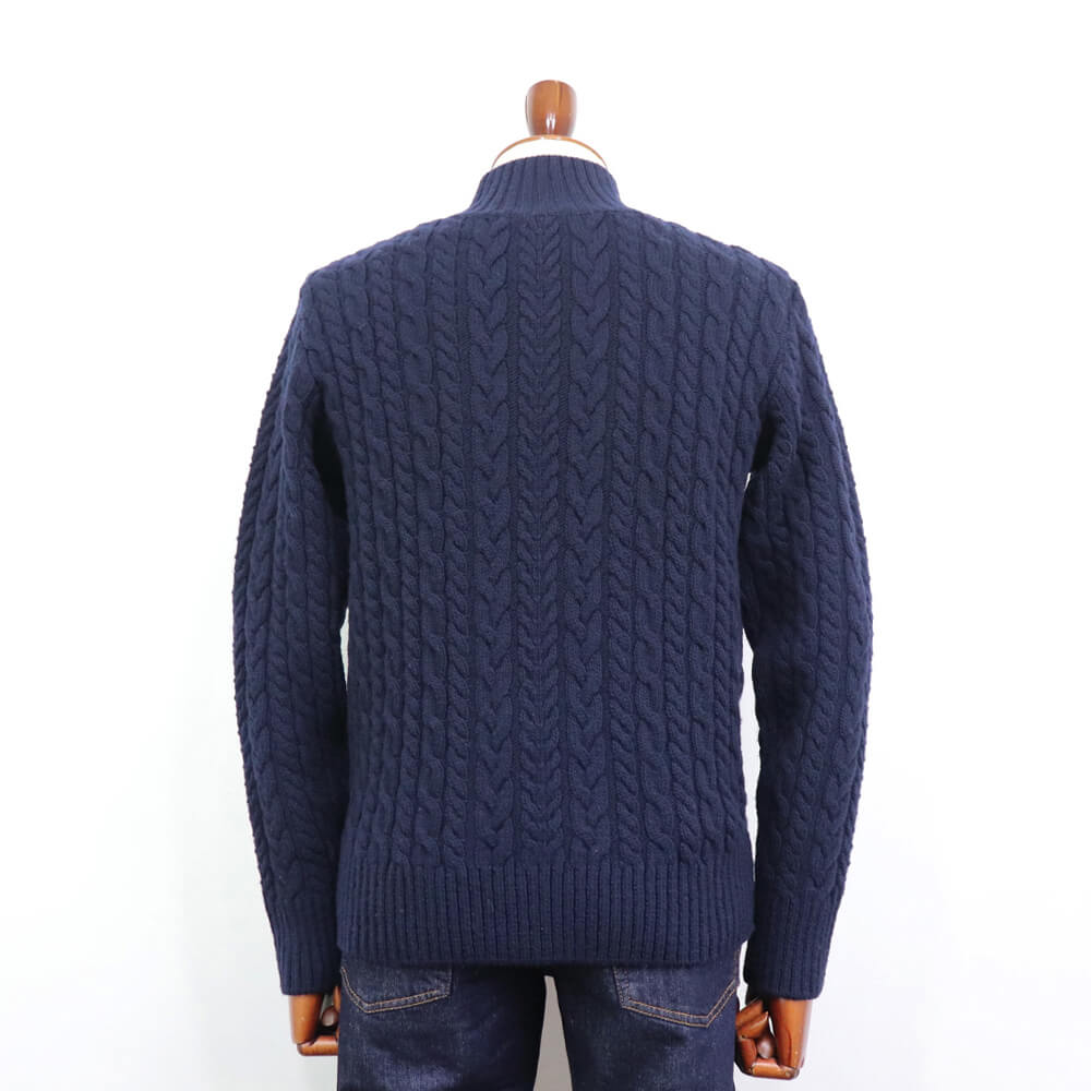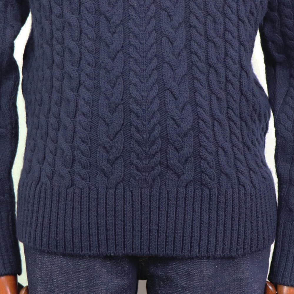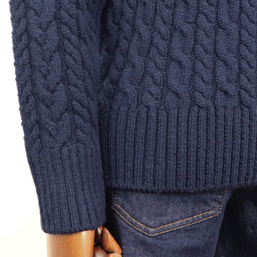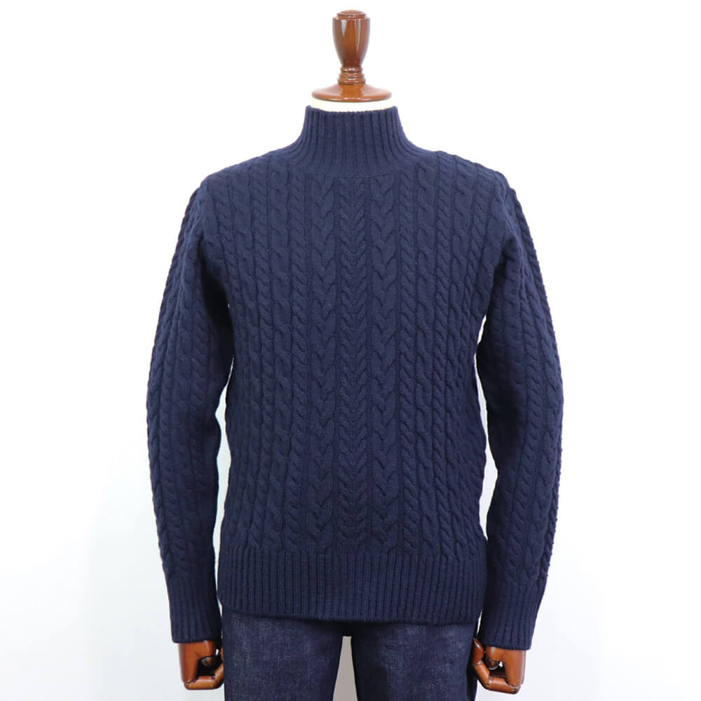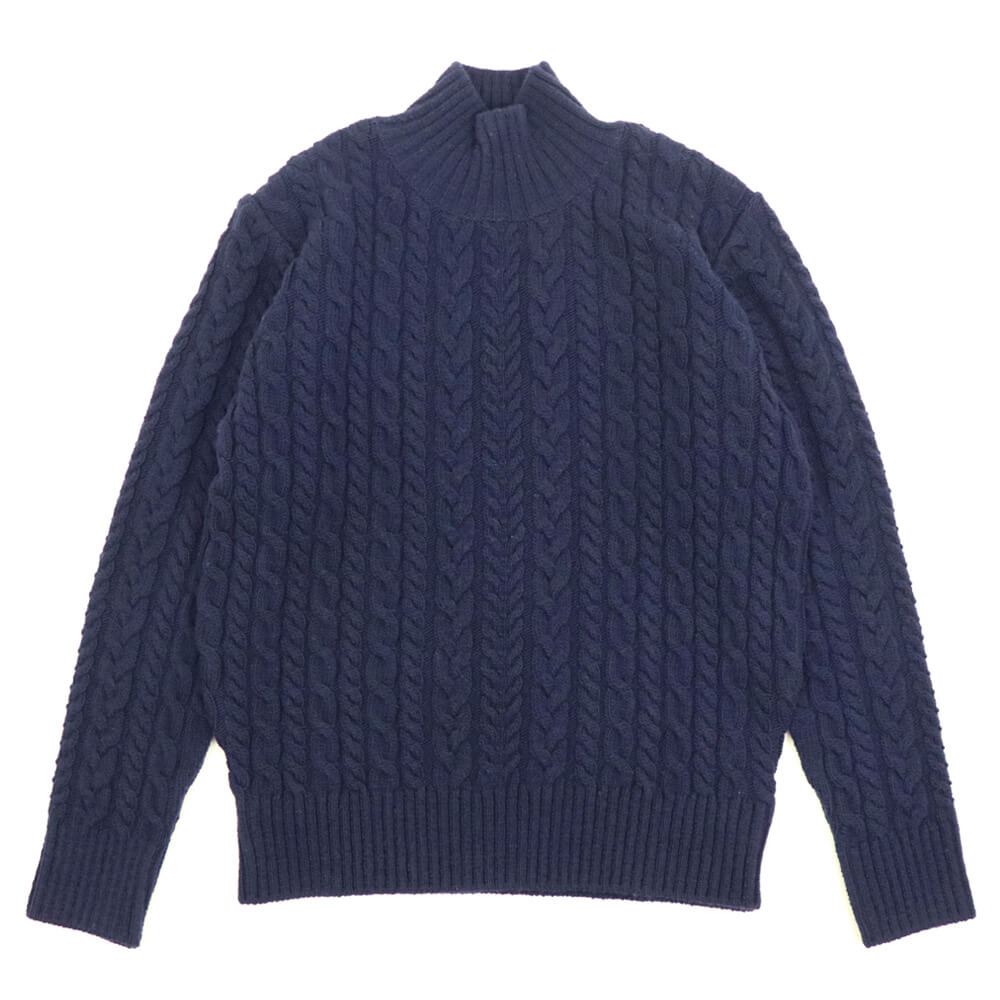 "フィッシャーマンセーター"を彷彿とさせる今季のケーブルニット。南フランス・アルル地方で飼育された希少なフレンチメリノウールを使用し、しっかりとした肉厚感と凹凸の編み地で冬に欠かせない1枚に仕上がっています。見た目とは裏腹に、とても軽く仕上がっております。通常のメリノウールと比べ、弾力性と膨らみがあるのが特徴です。今季はミドルタートルネックを展開。タートルネックとモックネックの中間のような良いとこ取りの首元で、ふっくらとしたケーブル編みでも上品な印象に。秋はメインのスタイリングに、冬はインナーとしてコーディネートを楽しんでください。今季はダウンベストとの組み合わせが旬かも知れませんね。