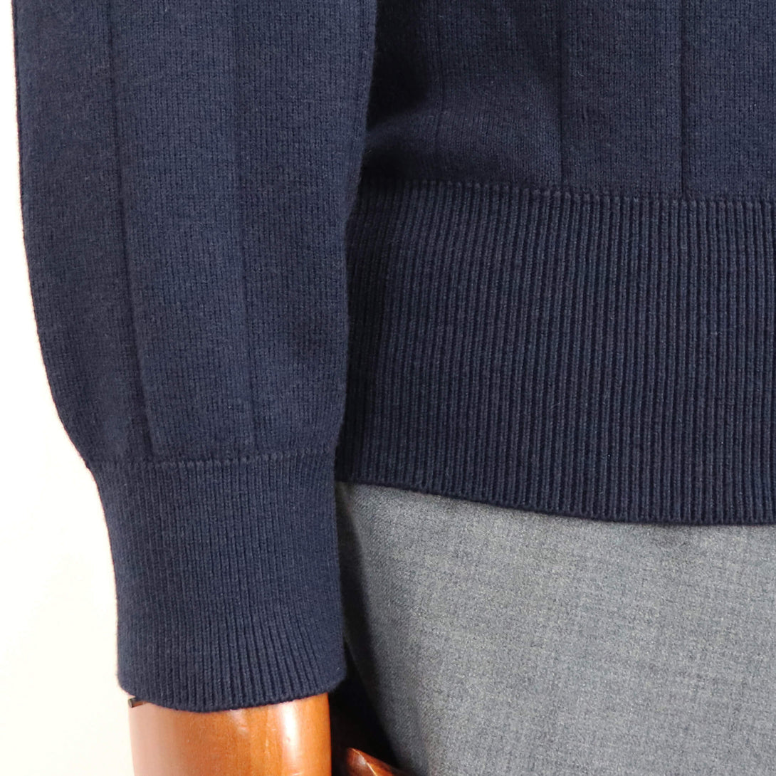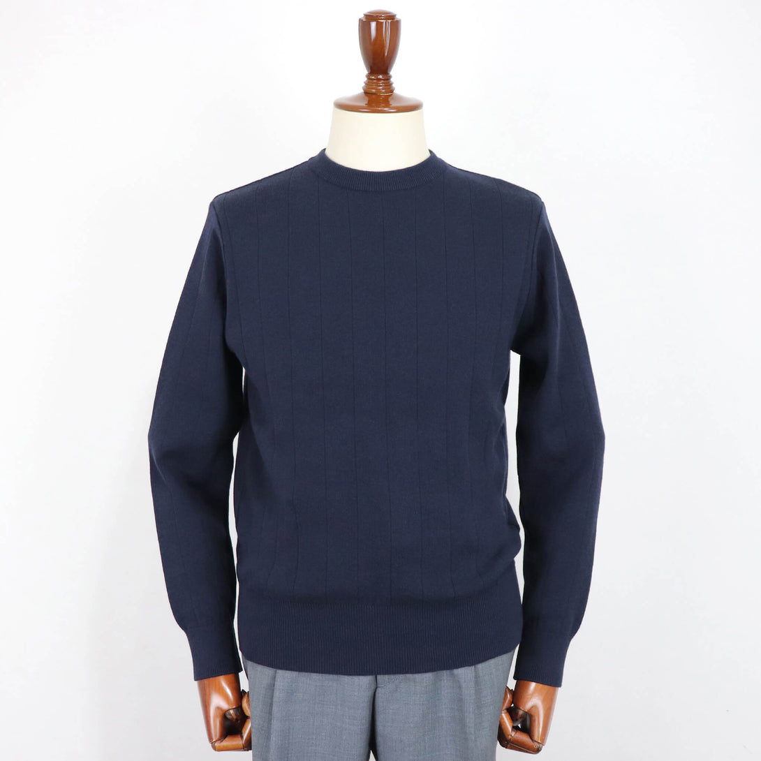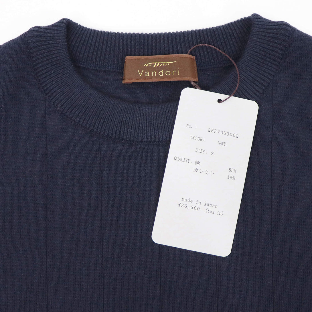 Vandoriより届いた新作は、コットン×カシミヤのクルーネックニット。一般的にハイゲージと言われるニットに比べると少し肉感の厚みがあり、アウターを脱いだ時の主役となる一枚です。素材は 、希少な超長綿にカシミヤを15%ブレンドした糸で編み上げたニット。しなやかで柔らかな肌触りと、上品な光沢をあわせ持つ特別な仕上がりとなっています。伸縮性に優れた快適な着心地に加え、凹凸感のある編み地を取り入れることで、シンプルながらも立体的で洗練された表情に。カラーは、ネイビーとブラックの2色をセレクト。ネイビーは、落ち着いた印象を与え、大人のスタイリングに自然に馴染みます。また、ブラックは色気、艶っぽい印象に。好みのカラーでコーディネートを楽しめるアイテムです。袖と裾をリブ仕様にすることで程よいアクセントを添え、腕まくりしたり、長袖ならではの着こなしもお楽しみください。