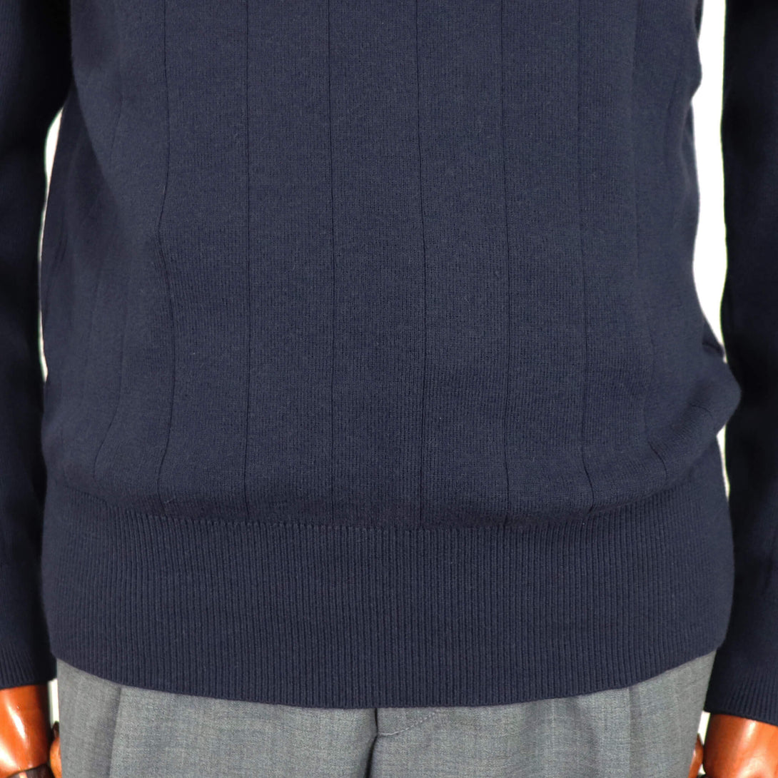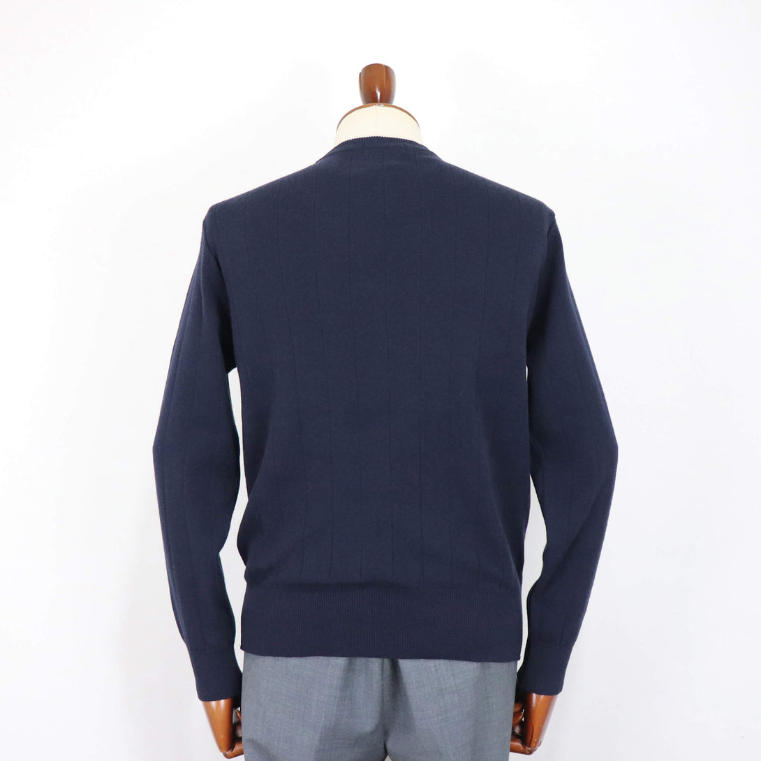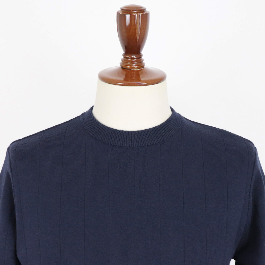 Vandoriより届いた新作は、コットン×カシミヤのクルーネックニット。一般的にハイゲージと言われるニットに比べると少し肉感の厚みがあり、アウターを脱いだ時の主役となる一枚です。素材は 、希少な超長綿にカシミヤを15%ブレンドした糸で編み上げたニット。しなやかで柔らかな肌触りと、上品な光沢をあわせ持つ特別な仕上がりとなっています。伸縮性に優れた快適な着心地に加え、凹凸感のある編み地を取り入れることで、シンプルながらも立体的で洗練された表情に。カラーは、ネイビーとブラックの2色をセレクト。ネイビーは、落ち着いた印象を与え、大人のスタイリングに自然に馴染みます。また、ブラックは色気、艶っぽい印象に。好みのカラーでコーディネートを楽しめるアイテムです。袖と裾をリブ仕様にすることで程よいアクセントを添え、腕まくりしたり、長袖ならではの着こなしもお楽しみください。