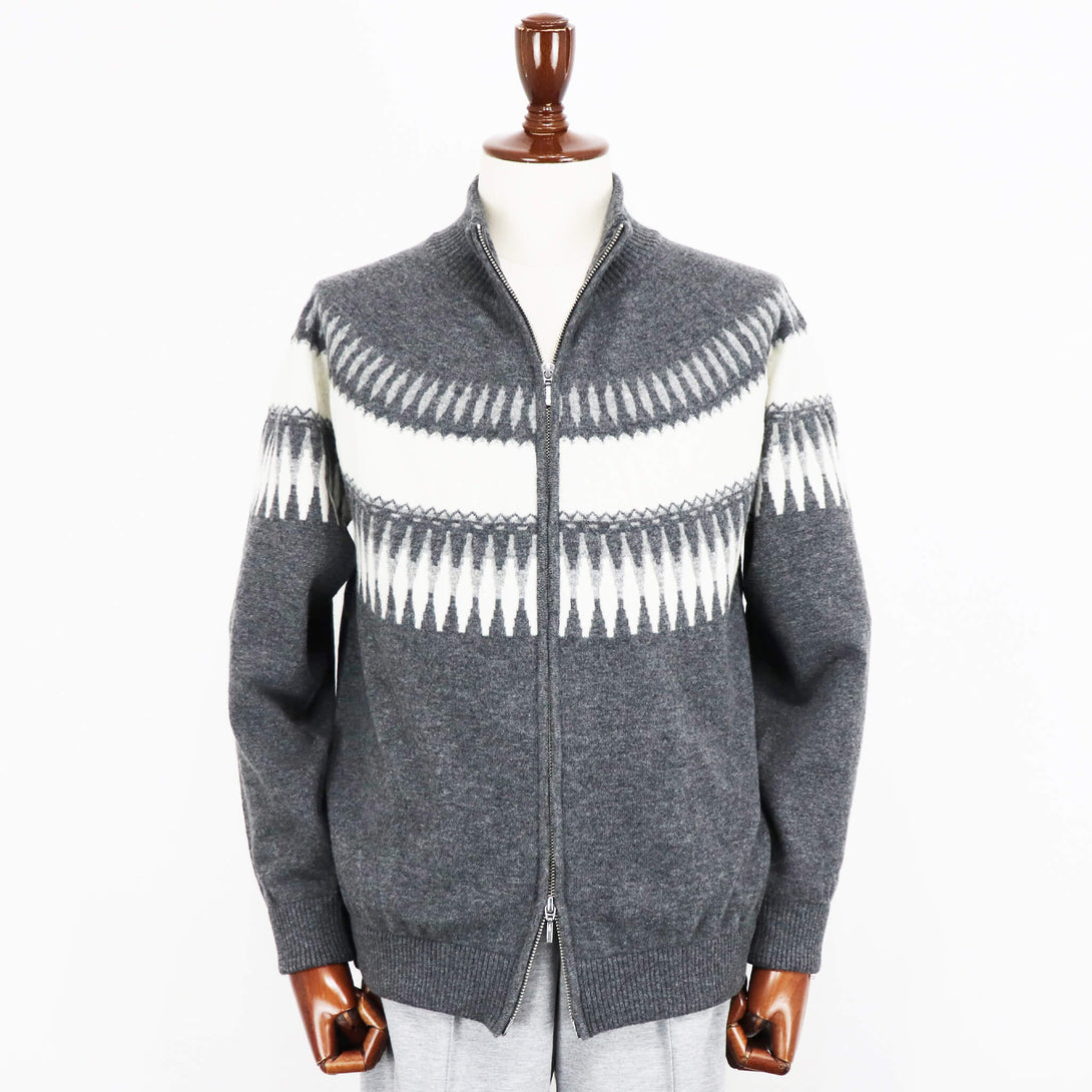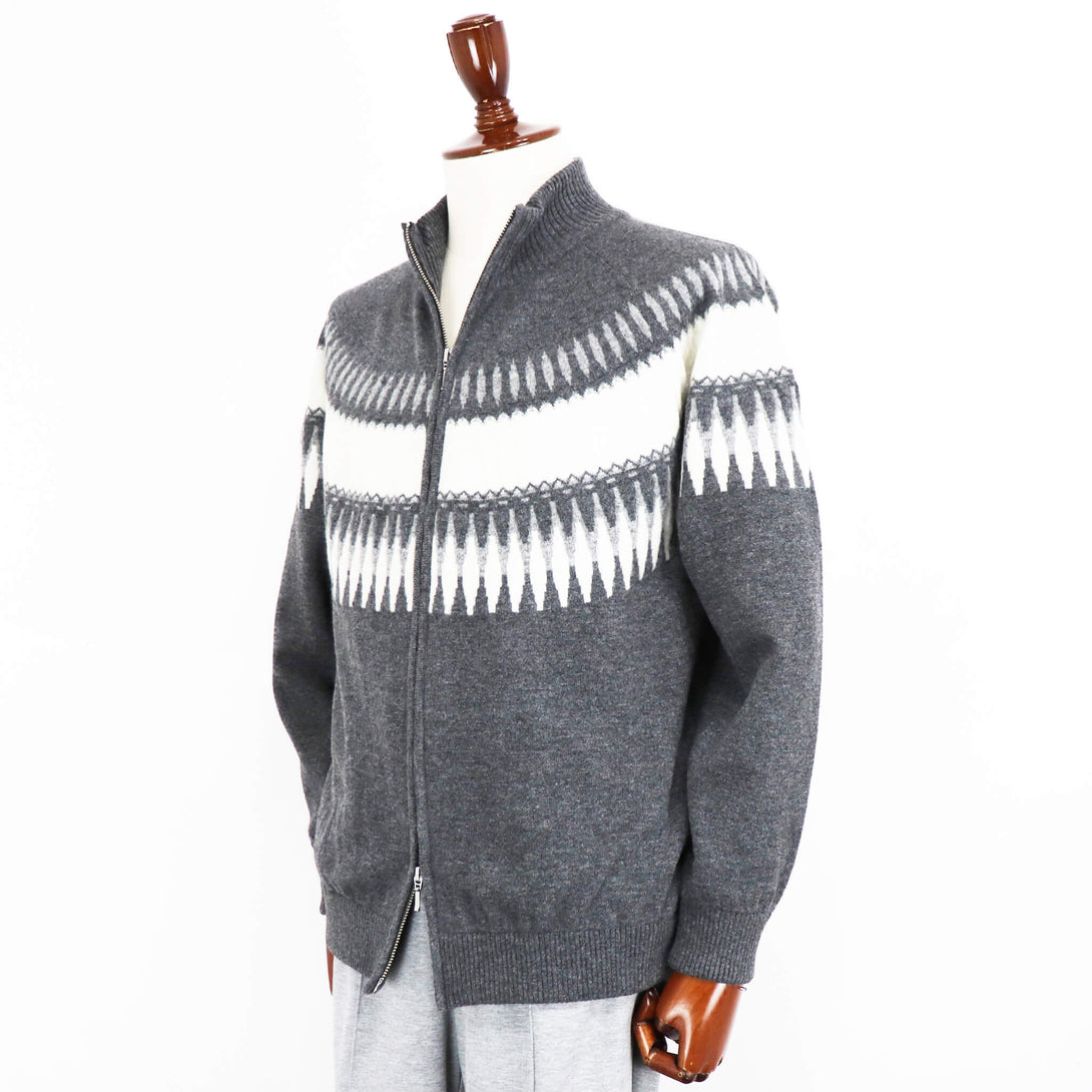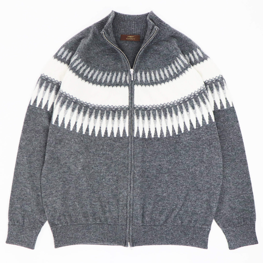 今季もVandori(ヴァンドリ)から素敵なニットが届きました。冬の定番フェアアイル柄(求心柄)です。しっとりとしたぬめり感と繊細で柔らかな風合いで、抜群な肌触りを実現しています。ウールとカシミヤをブレンドし、軽やかで柔らかく、ウォーム感のある素材感に仕上がっています。また今季はジップアップブルゾンにすることで、カーディガン感覚で羽織る事もできます。適度なゆとりを持たせたリラックスフィットのサイズ感で、ストレスフリーな着心地を実現。ハイゲージ以上、ミドルゲージ未満の絶妙な肉感で、コートやダウンベストとの組み合わせでコーディネートをお楽しみください。