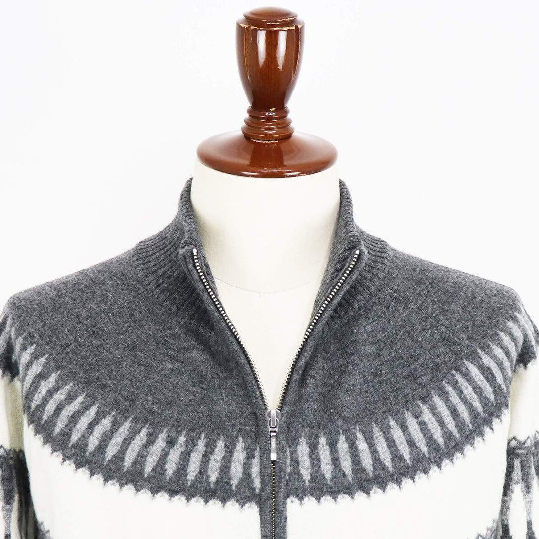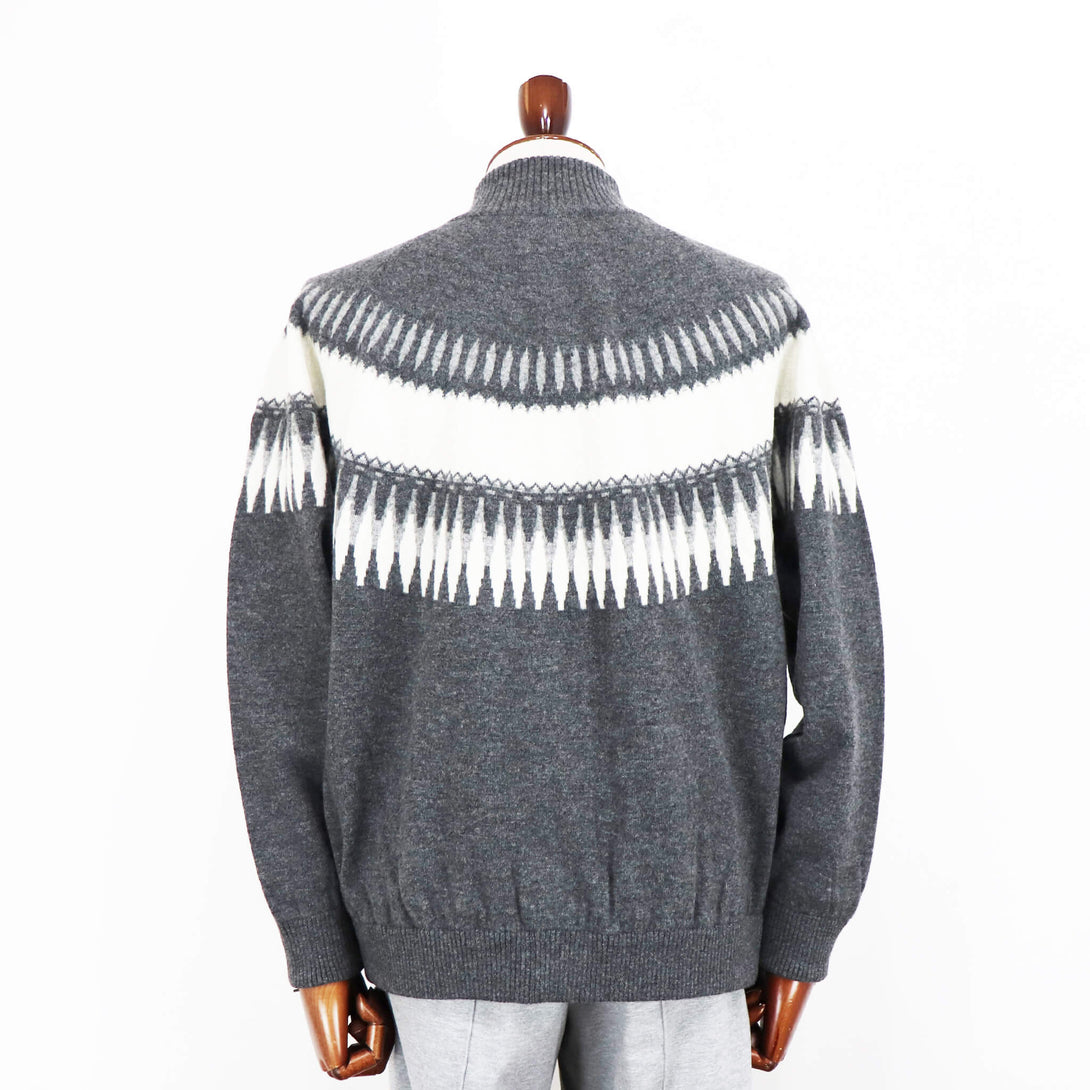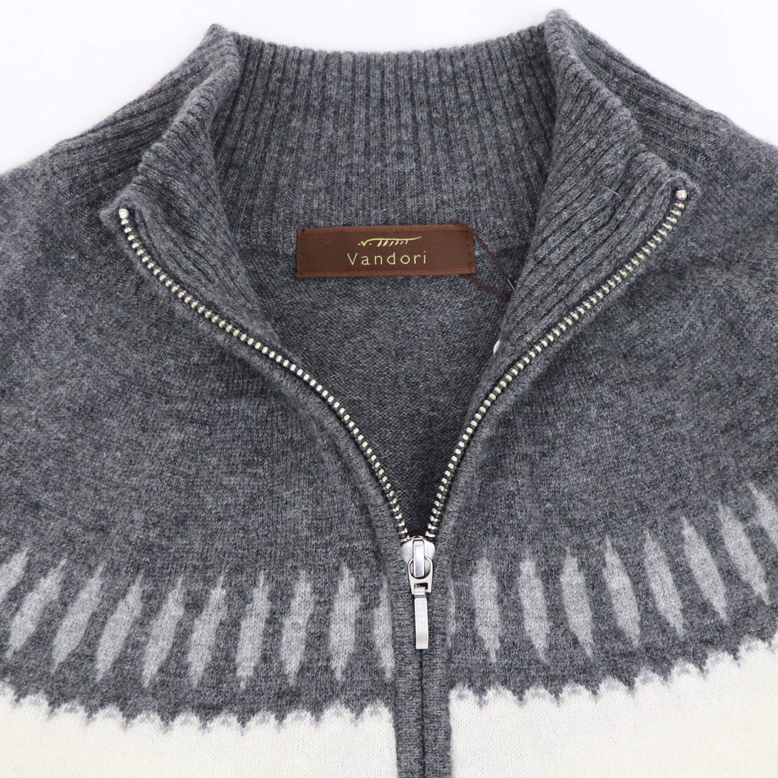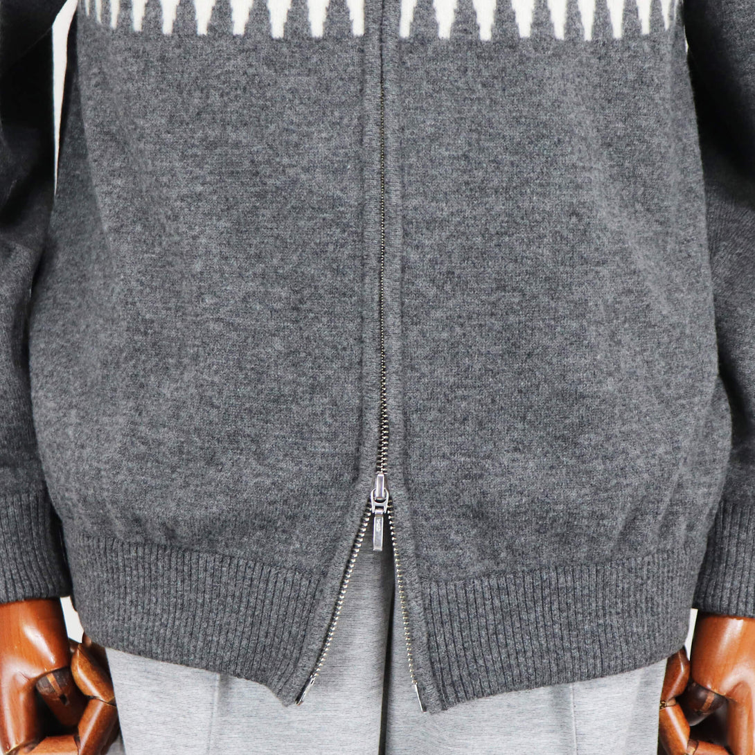 今季もVandori(ヴァンドリ)から素敵なニットが届きました。冬の定番フェアアイル柄(求心柄)です。しっとりとしたぬめり感と繊細で柔らかな風合いで、抜群な肌触りを実現しています。ウールとカシミヤをブレンドし、軽やかで柔らかく、ウォーム感のある素材感に仕上がっています。また今季はジップアップブルゾンにすることで、カーディガン感覚で羽織る事もできます。適度なゆとりを持たせたリラックスフィットのサイズ感で、ストレスフリーな着心地を実現。ハイゲージ以上、ミドルゲージ未満の絶妙な肉感で、コートやダウンベストとの組み合わせでコーディネートをお楽しみください。