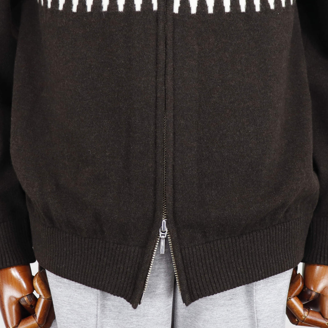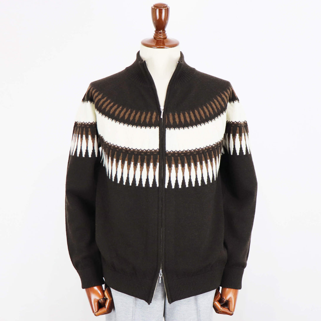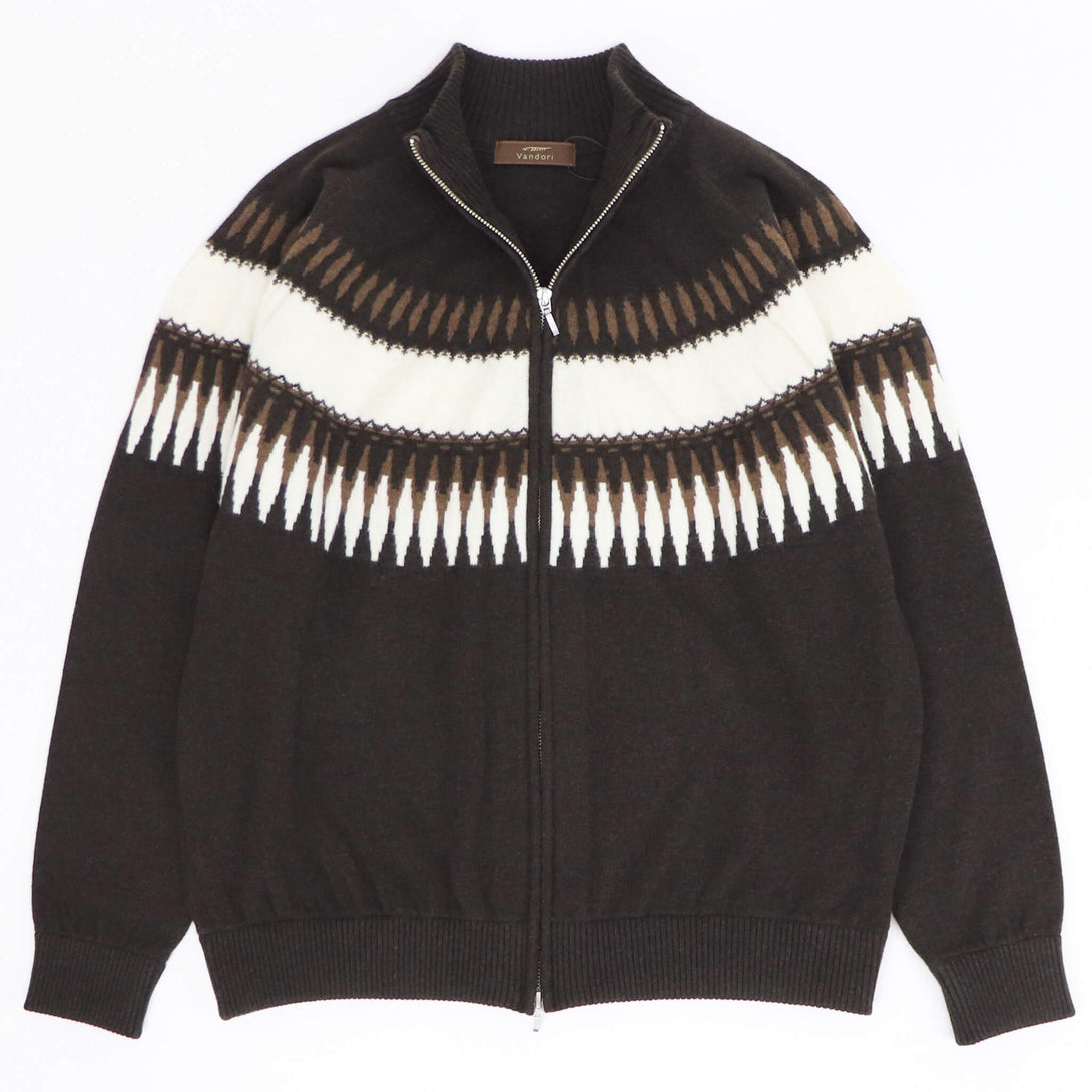 今季もVandori(ヴァンドリ)から素敵なニットが届きました。冬の定番フェアアイル柄(求心柄)です。しっとりとしたぬめり感と繊細で柔らかな風合いで、抜群な肌触りを実現しています。ウールとカシミヤをブレンドし、軽やかで柔らかく、ウォーム感のある素材感に仕上がっています。また今季はジップアップブルゾンにすることで、カーディガン感覚で羽織る事もできます。適度なゆとりを持たせたリラックスフィットのサイズ感で、ストレスフリーな着心地を実現。ハイゲージ以上、ミドルゲージ未満の絶妙な肉感で、コートやダウンベストとの組み合わせでコーディネートをお楽しみください。
