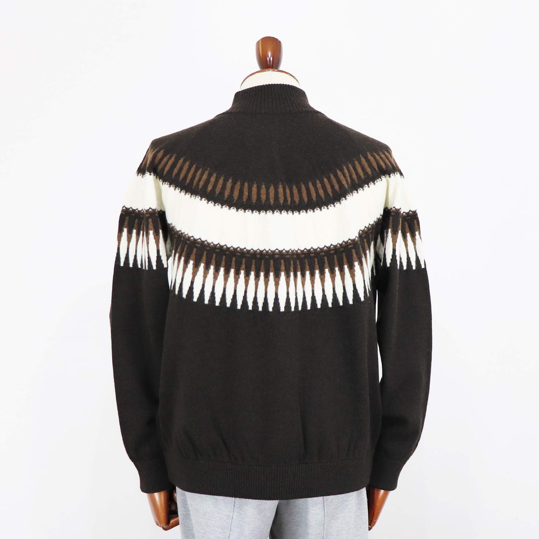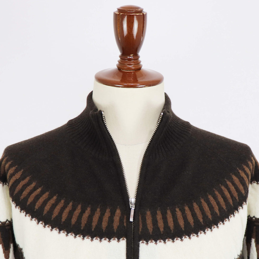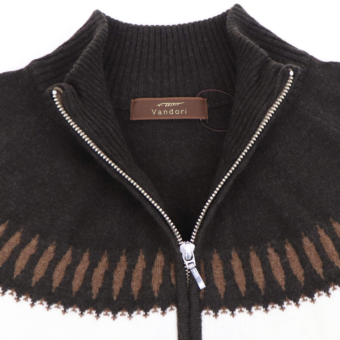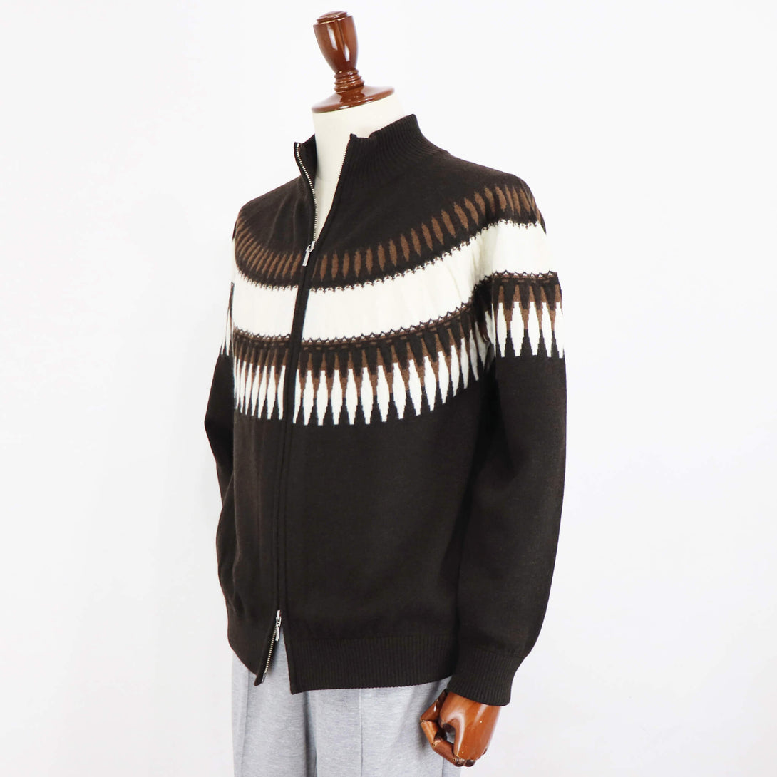 今季もVandori(ヴァンドリ)から素敵なニットが届きました。冬の定番フェアアイル柄(求心柄)です。しっとりとしたぬめり感と繊細で柔らかな風合いで、抜群な肌触りを実現しています。ウールとカシミヤをブレンドし、軽やかで柔らかく、ウォーム感のある素材感に仕上がっています。また今季はジップアップブルゾンにすることで、カーディガン感覚で羽織る事もできます。適度なゆとりを持たせたリラックスフィットのサイズ感で、ストレスフリーな着心地を実現。ハイゲージ以上、ミドルゲージ未満の絶妙な肉感で、コートやダウンベストとの組み合わせでコーディネートをお楽しみください。