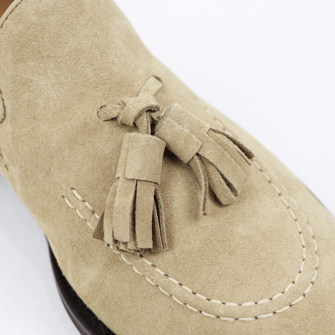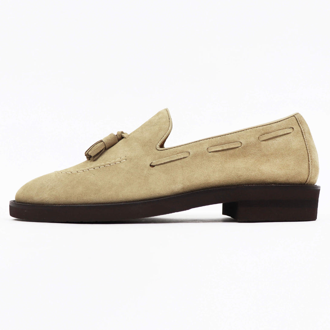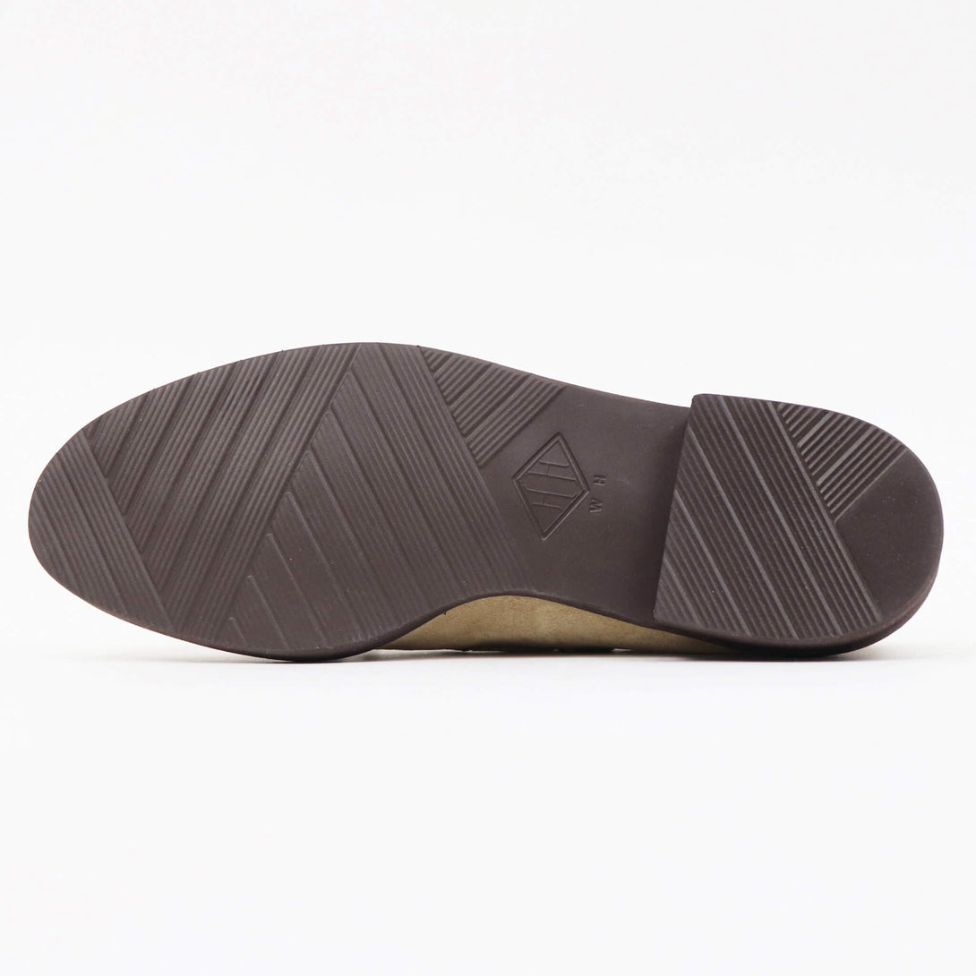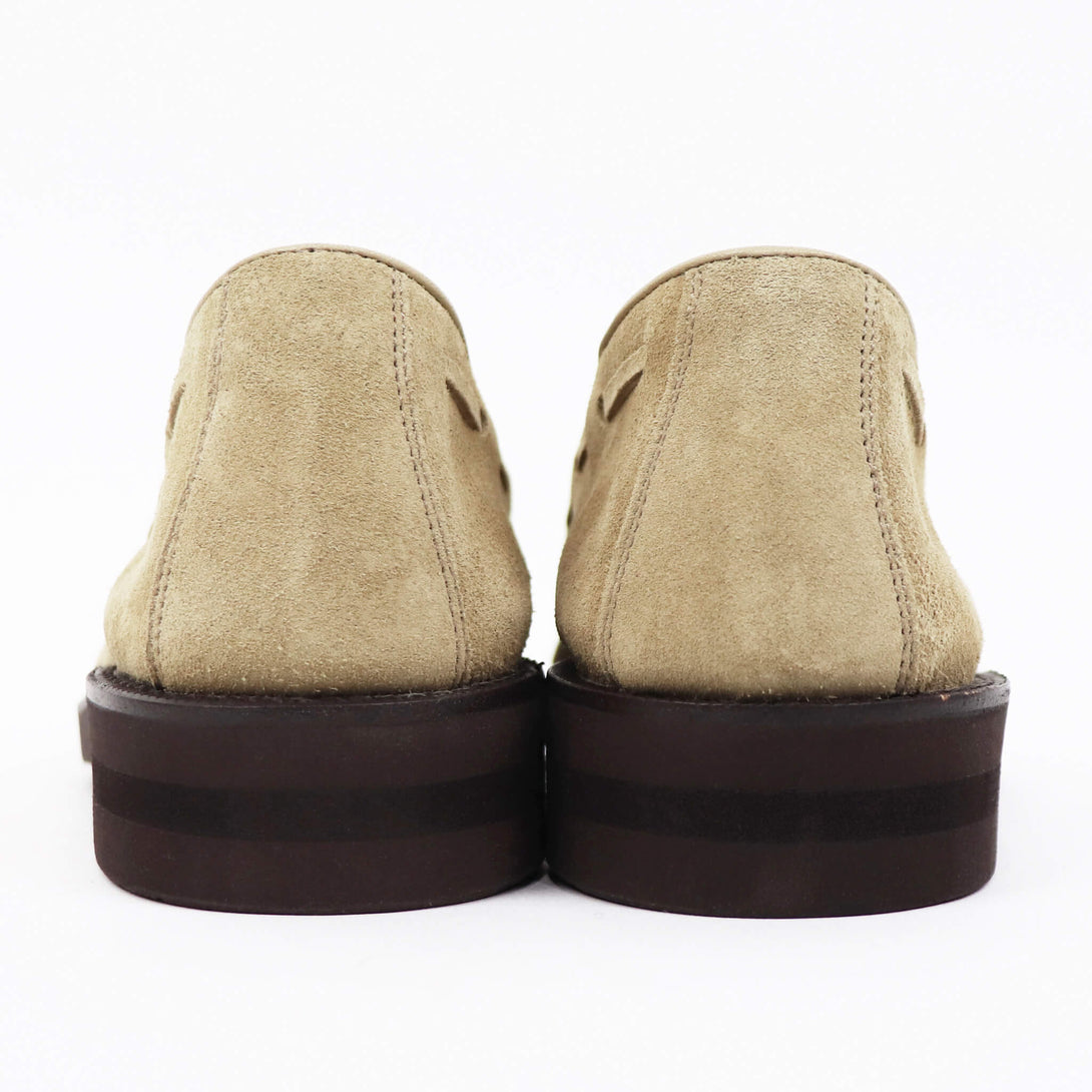 アッパーに英国タンナーチャールズFステッド社ヤヌスカーフ(銀付きスウェード)を使用。しっとりとした手触りと、柔らかい革を採用し、ライニングを貼らないアンライニング仕様となります。アッパーに柔らかい革を使用し、アンライニングにすることで、驚くほどのやわらかさを実現しています。アッパーは柔らかいのが特徴ですが、履くとバシッと決まるというのがこのシューズの特徴。また、やわらかさだけではなく、軽さもポイント。ソールはWHオリジナルのソールとなります。グリップ力、衝撃吸収力、軽量、クッション性に優れたソールです。ストレッチの効いたイージー系のセットアップや、パンツとの相性は抜群です。