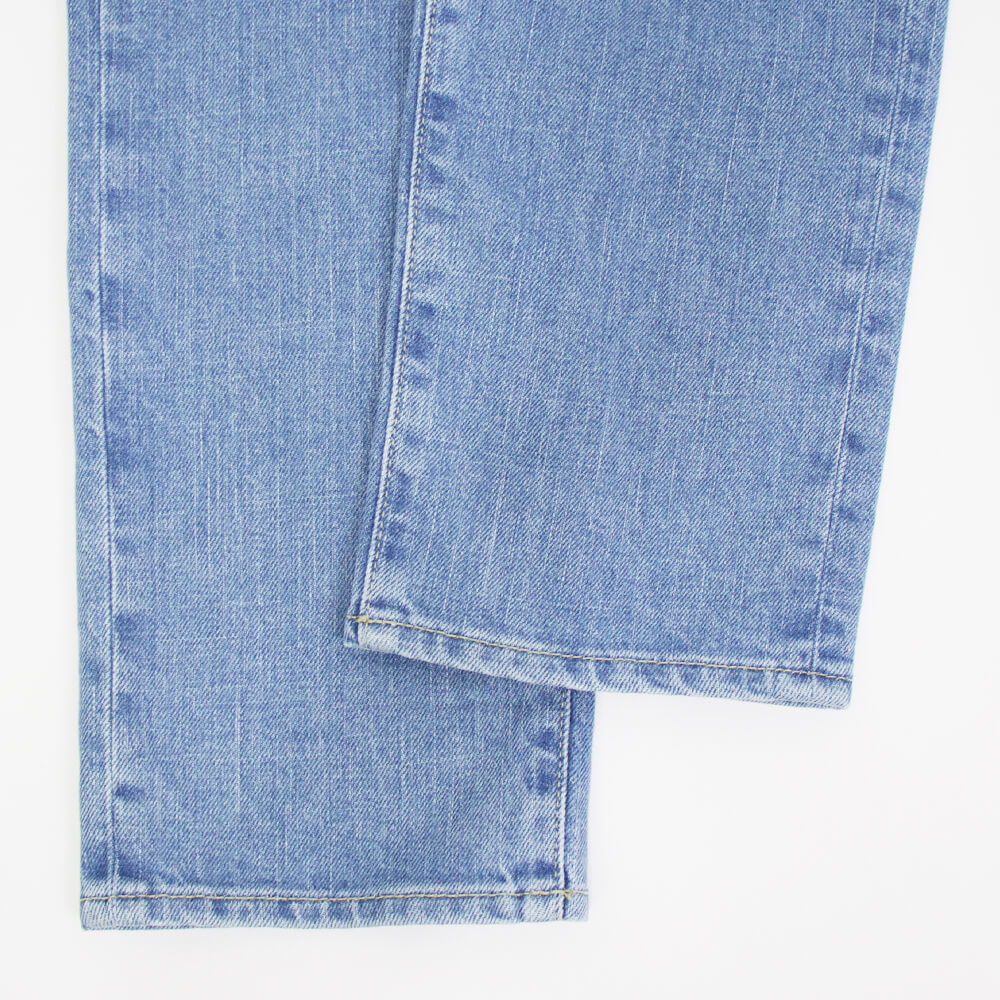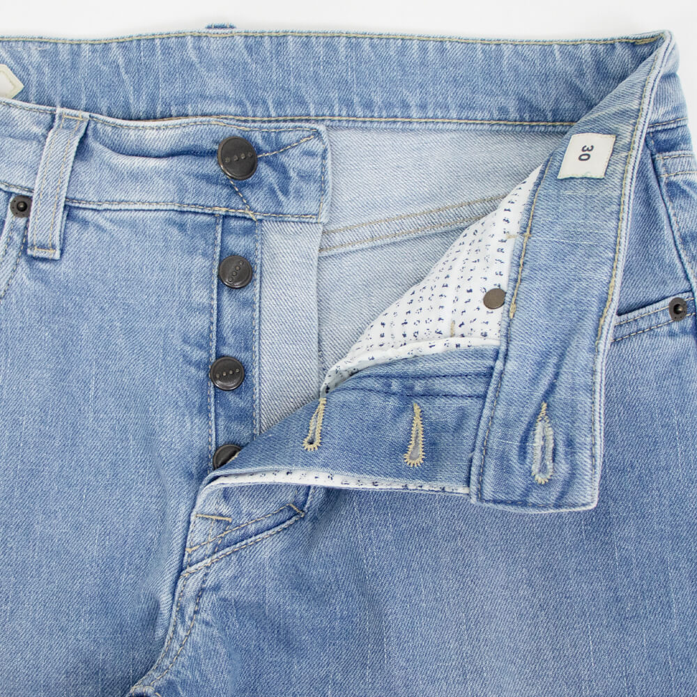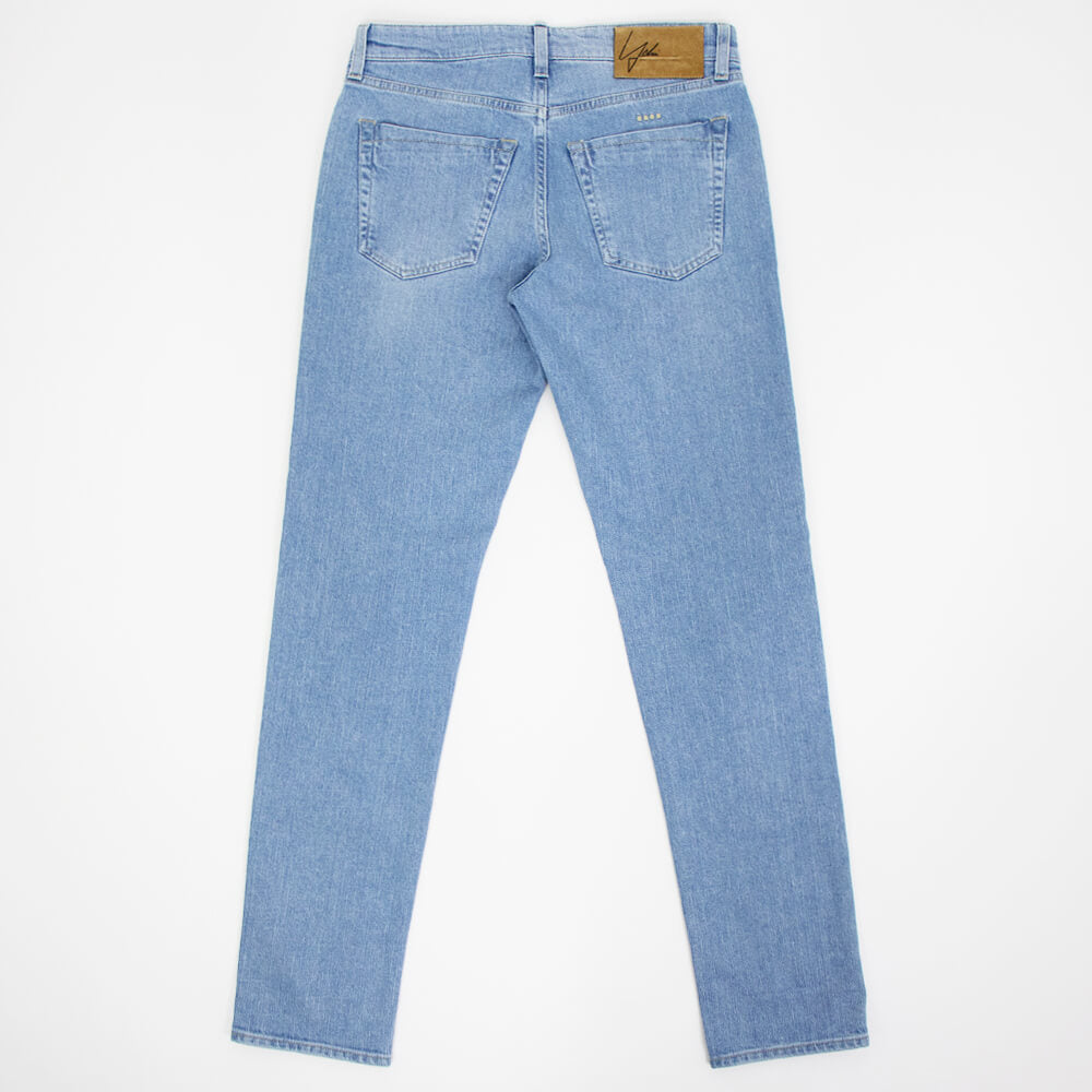 ポリウレタン混のデニム生地は自然なストレッチが効いておりスッキリしたシルエットながら窮屈な穿き心地を感じる事はありません。フロントのボタンフライはクラシカルな印象を与え、レザーパッチも高級感を感じさせます。