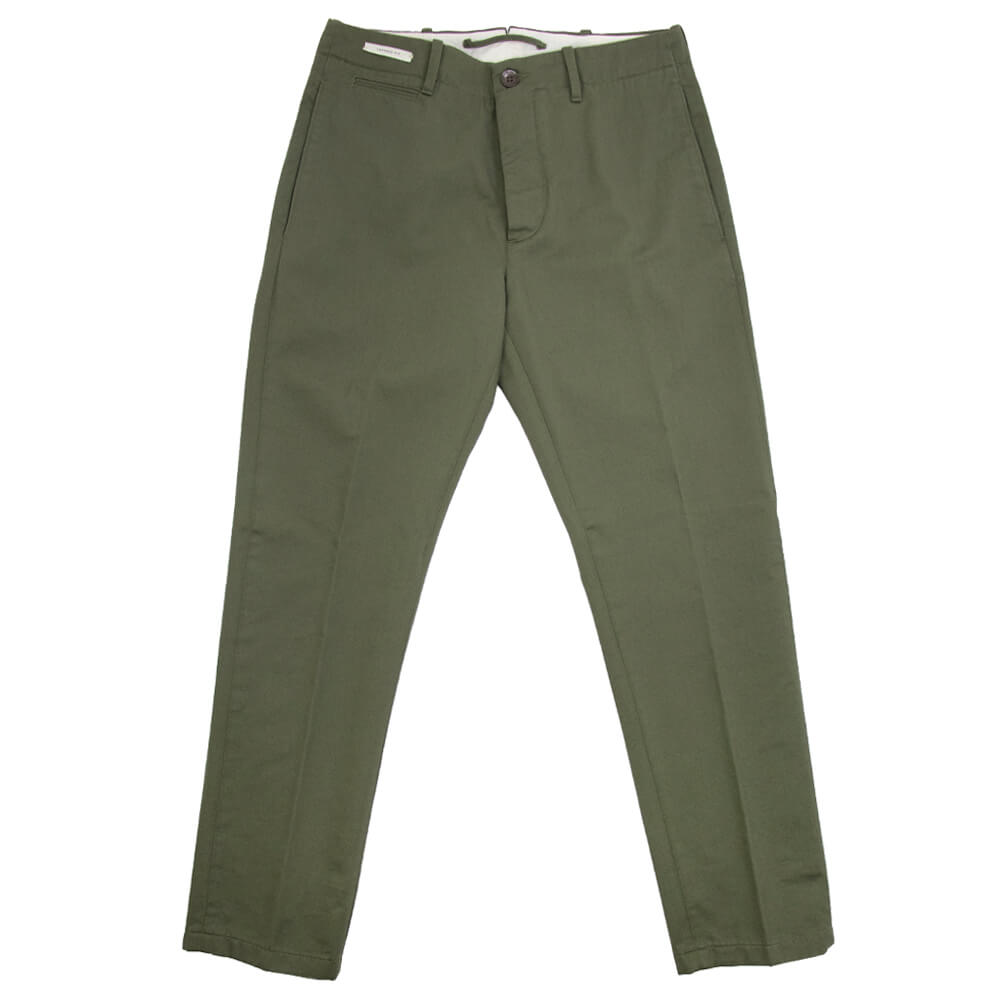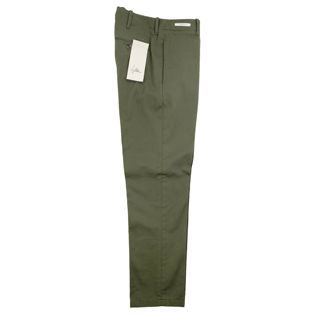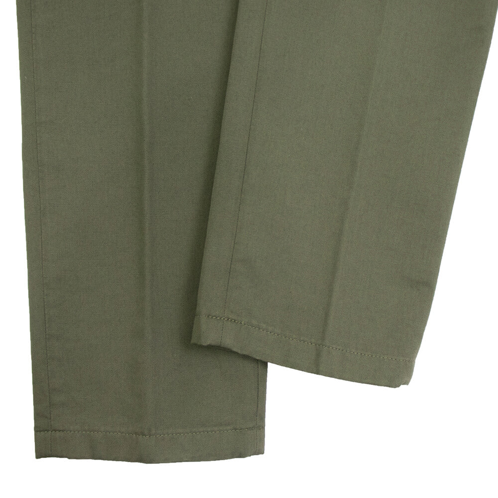 適度なゆとりを持ったブランドシグネチャーモデルROBUSTO(ロブスト)の通称アメリカンチノと呼ばれるチノパンツです。葉巻のロブストサイズ(太めのサイズ)から名付けられたモデル名の通り、ゆったりとしたシルエットが特徴。裾にかけては程よくテーパードし、太すぎない、現代的なフィッティングが魅力です。クラシックなジャケットにも、カジュアルスタイルにも、いつもの着こなしに変化を加える1本です。素材は適度な肉厚のコットン100%の3Dダイアゴナルと呼ばれる少し織りの立体感が強い生地を採用しています。反応染めによって糸内部からしっかり染めている生地の為、色落ちや日焼け等に非常に強い特徴があり、長くご愛用いただける点も魅力です。バックポケットの4つのドットはビアンケッティ氏の親愛なる4人の家族を意味します。