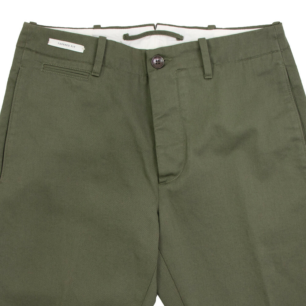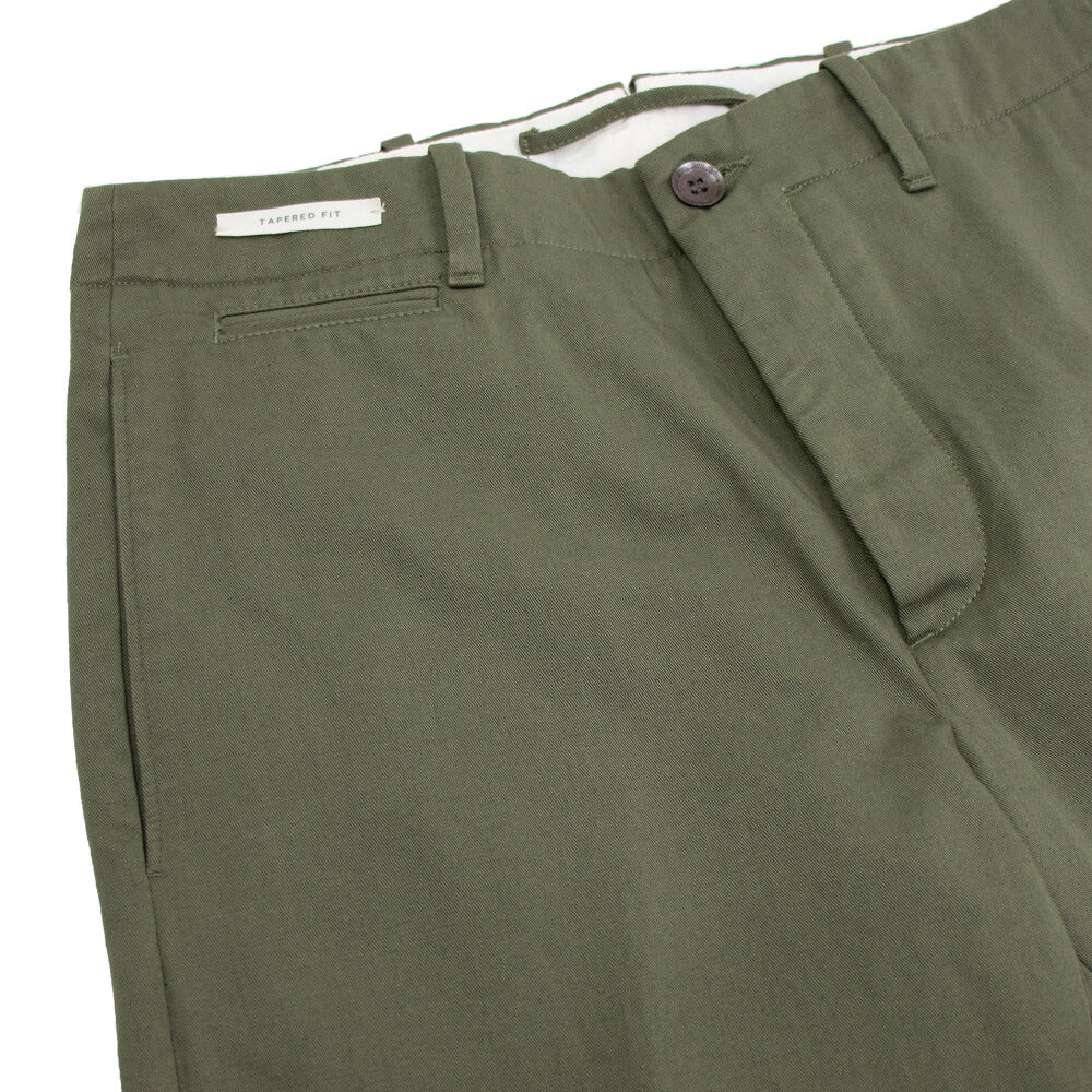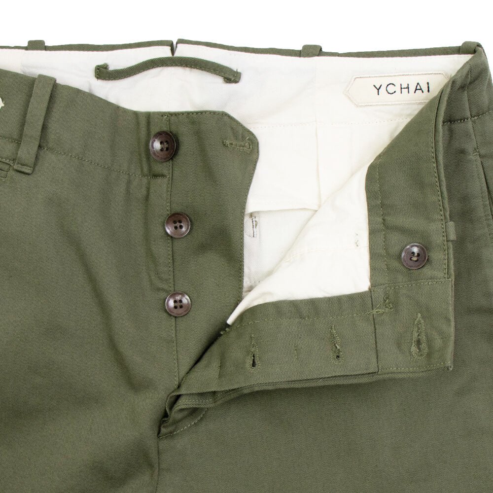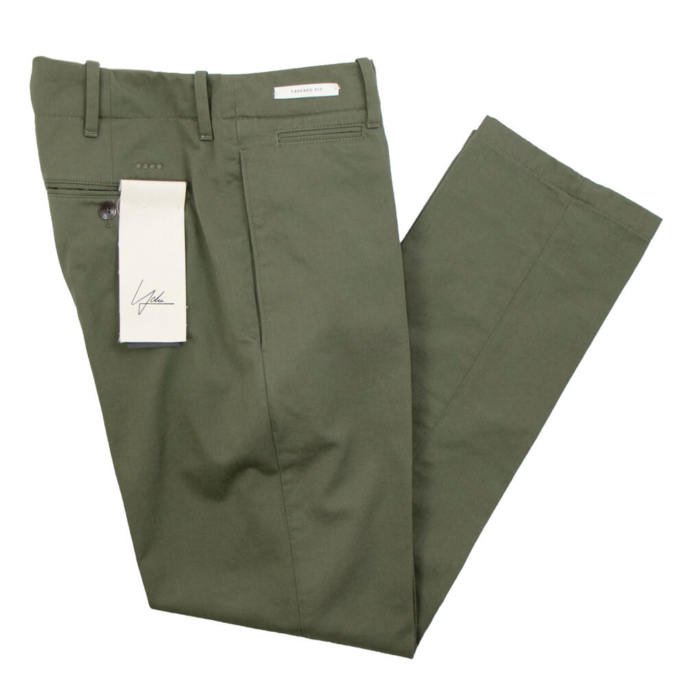 適度なゆとりを持ったブランドシグネチャーモデルROBUSTO(ロブスト)の通称アメリカンチノと呼ばれるチノパンツです。葉巻のロブストサイズ(太めのサイズ)から名付けられたモデル名の通り、ゆったりとしたシルエットが特徴。裾にかけては程よくテーパードし、太すぎない、現代的なフィッティングが魅力です。クラシックなジャケットにも、カジュアルスタイルにも、いつもの着こなしに変化を加える1本です。素材は適度な肉厚のコットン100%の3Dダイアゴナルと呼ばれる少し織りの立体感が強い生地を採用しています。反応染めによって糸内部からしっかり染めている生地の為、色落ちや日焼け等に非常に強い特徴があり、長くご愛用いただける点も魅力です。バックポケットの4つのドットはビアンケッティ氏の親愛なる4人の家族を意味します。